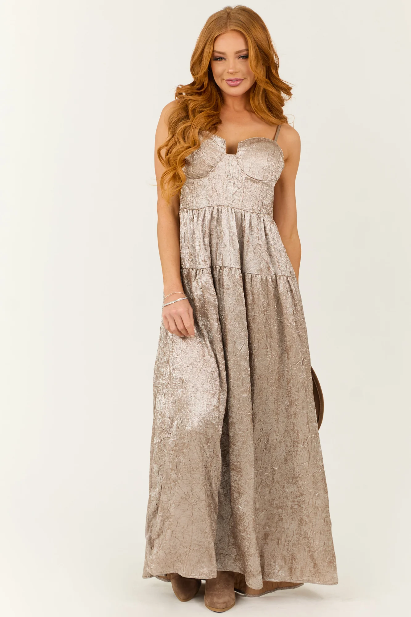 Elevate your style with this stunning Textured Metallic Corset Sleeveless Maxi Dress in Champagne. Made with 100% polyester, this dress features a wired bust, a sweetheart neckline, and a square notch for a chic look. The back zipper with hook and eye closure adds convenience, while the black inner shell complements the desert lining perfectly. Available in sizes S, M, and L, this non-stretchy woven dress fits slightly loose and measures 54-55 inches in length. Hand wash cold water, line dry, iron on low heat for care. Perfect for formal occasions, proms, and special events.
