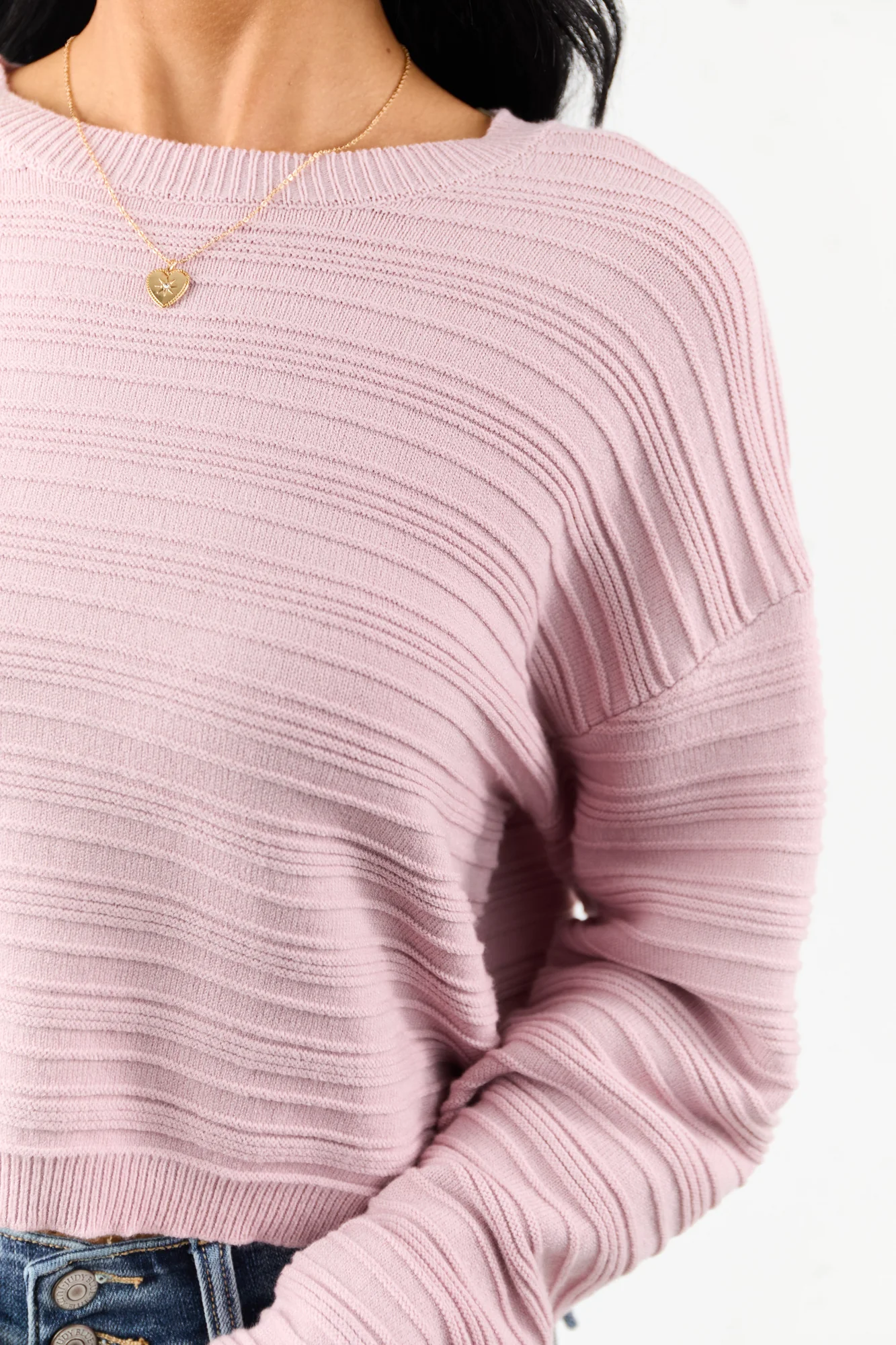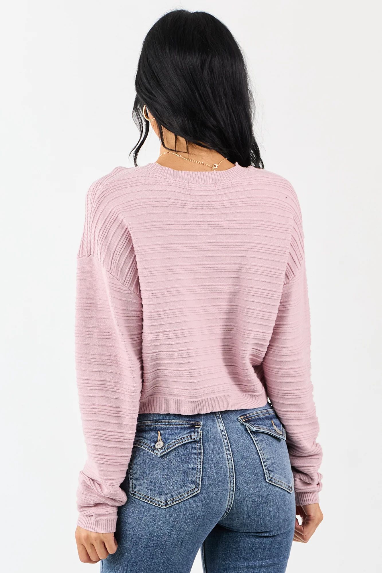Indulge in the cozy luxury of our pink textured knit cropped sweater. This relaxed fit sweater features a soft pink hue, stretchy ribbed knit, drop shoulder design, and is crafted from a blend of 50% Rayon, 28% Polyester, 22% Nylon for supreme comfort. Available in sizes S, M, and L. Add a touch of elegance to your wardrobe with this chic piece. Model is wearing a size Small. Model’s measurements: Size 1, Height 59″, Bust 34″, Waist 26″.