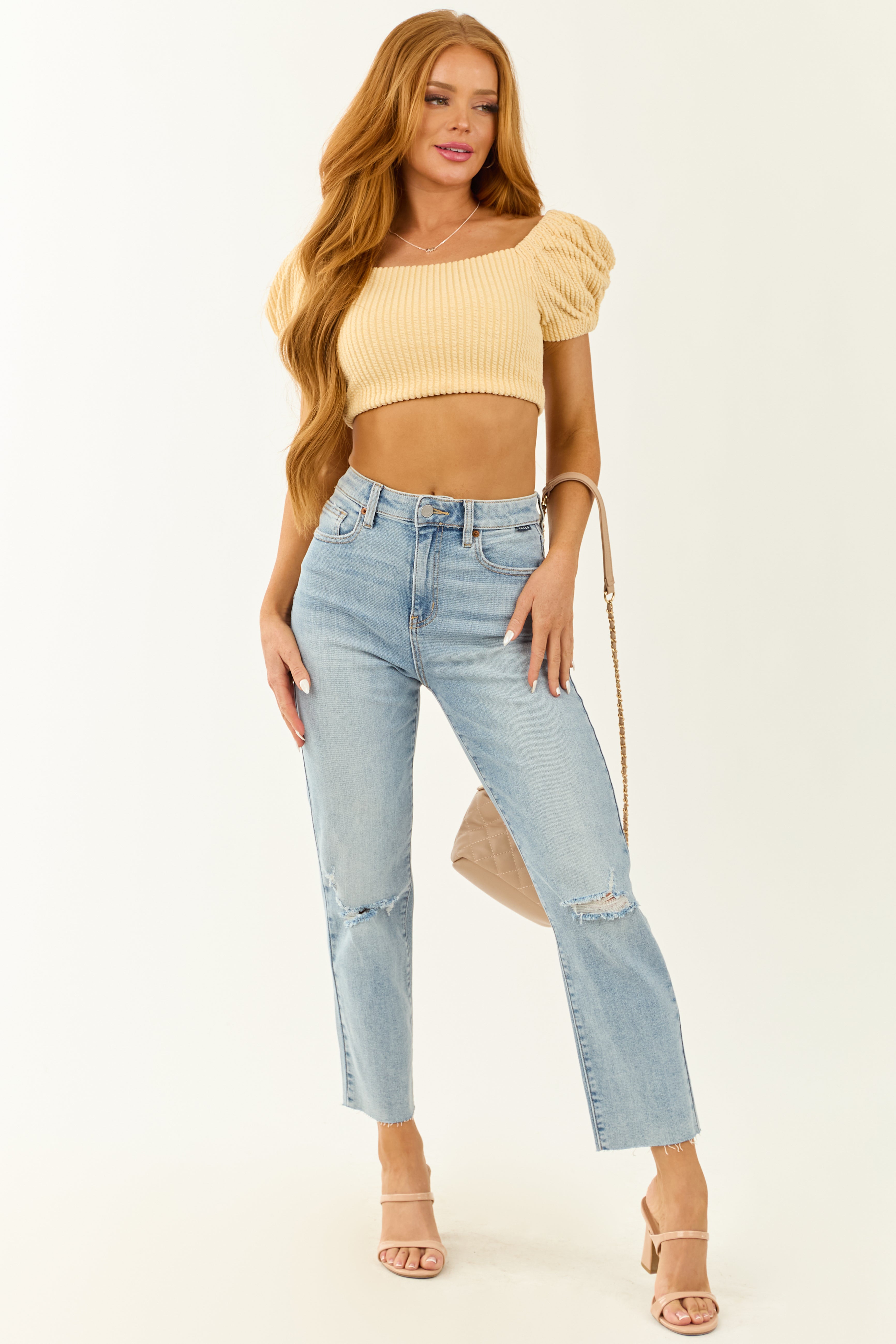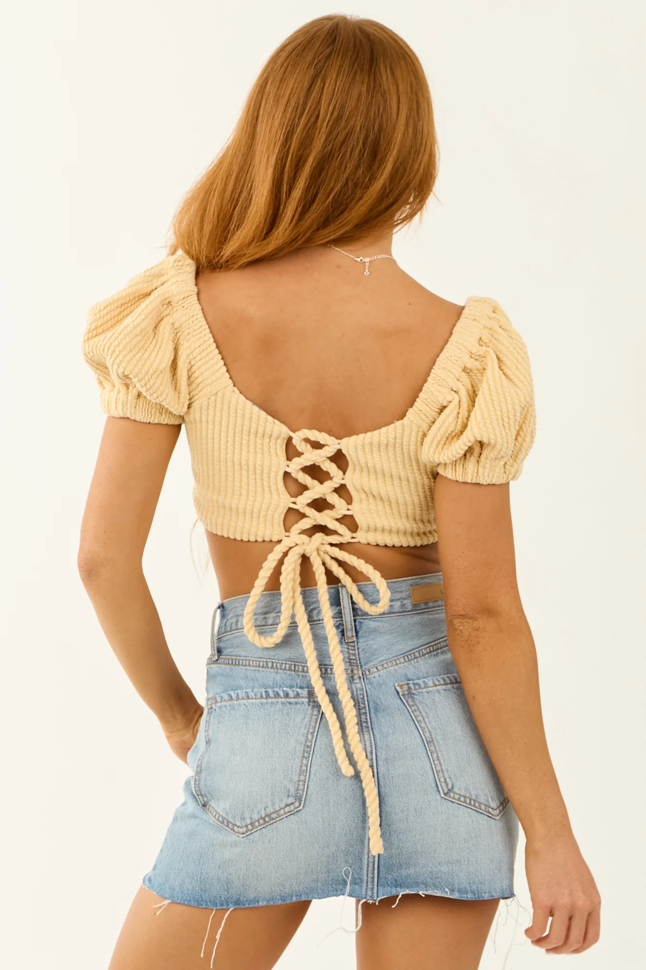 Stay stylish and sleek in this textured puff sleeve crop top featuring a lace-up back, elastic cuffs, and shoulders for a fresh, flirty look full of charm. Made with stretchy ribbed knit fabric, lined for comfort. Ideal for pairing with high-waisted bottoms for a trendy outfit that stands out effortlessly. Hand wash cold, line dry – easy care. Available in sizes S, M, L. Model is wearing a size Small (Bust: 33″, Waist: 24″).