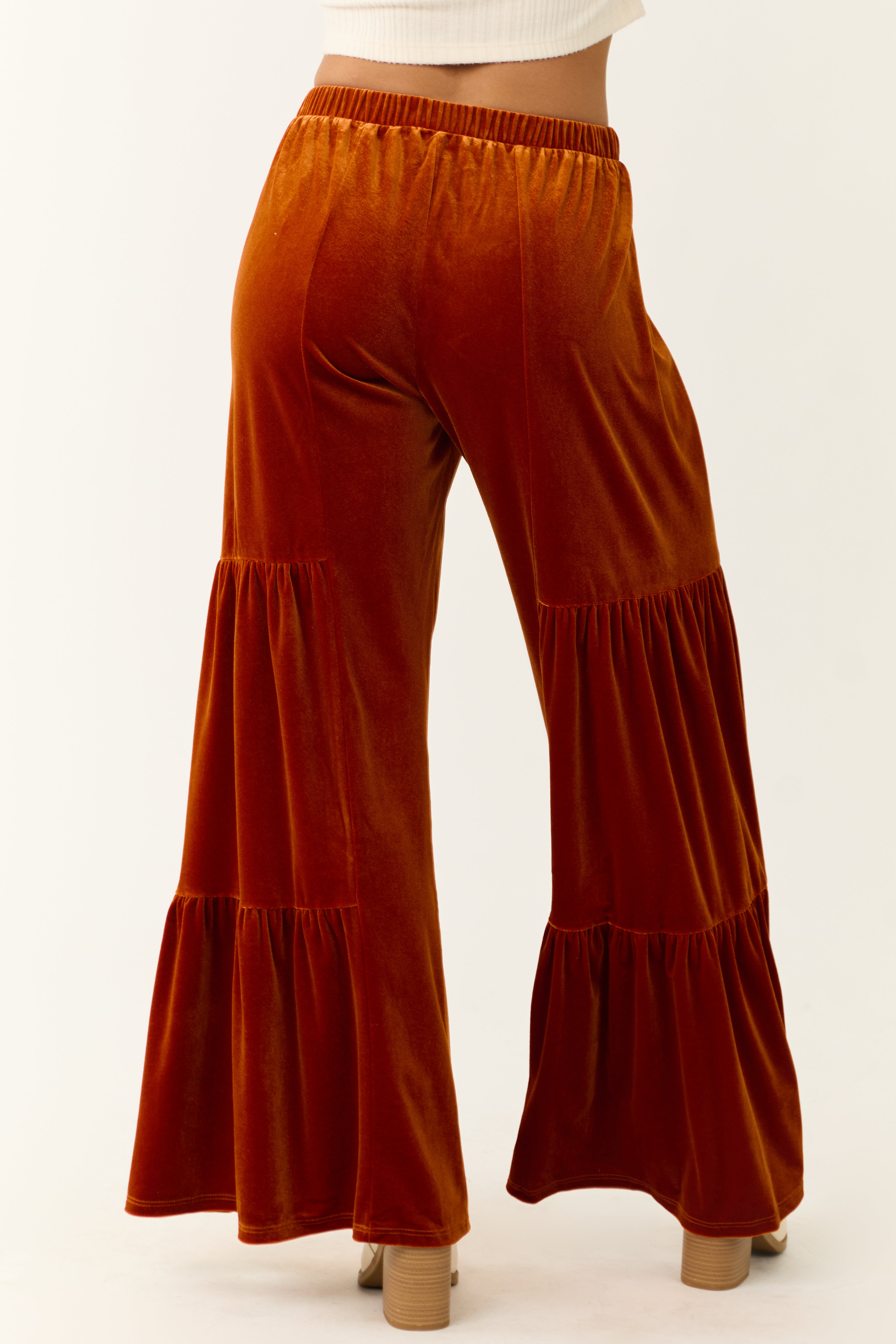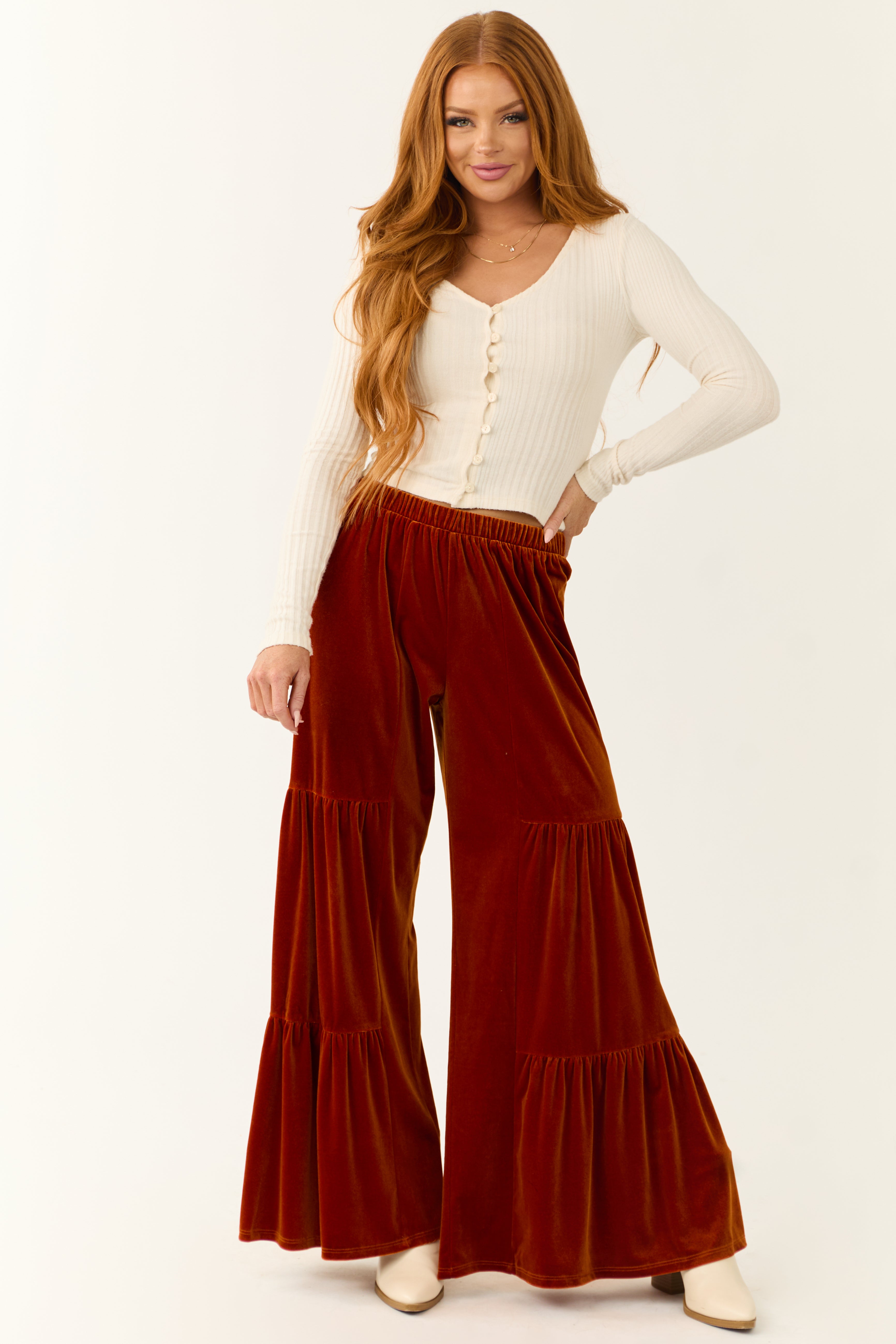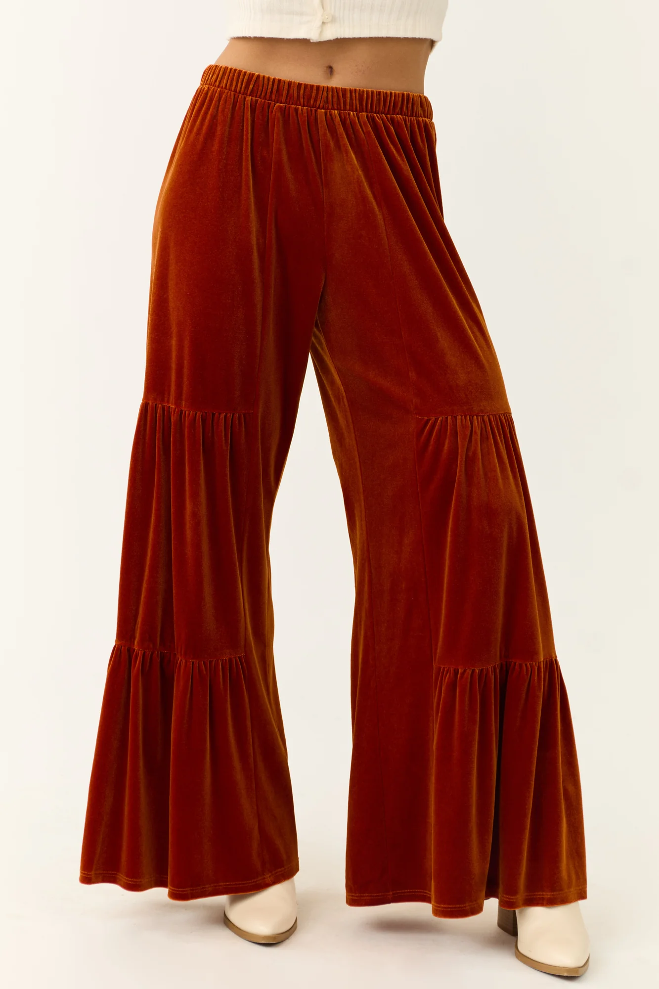 Indulge in luxurious comfort with our burnt orange velvet wide leg pants that embody elegance and style. Available in sizes S, M, and L, with an elastic waistband for a perfect fit. Crafted from semi-stretchy 96% Polyester and 4% Spandex fabric, these pants offer a flattering silhouette and a 30-inch inseam. Ideal for date nights and evenings out. Hand wash cold, line dry. Model wears size Small.