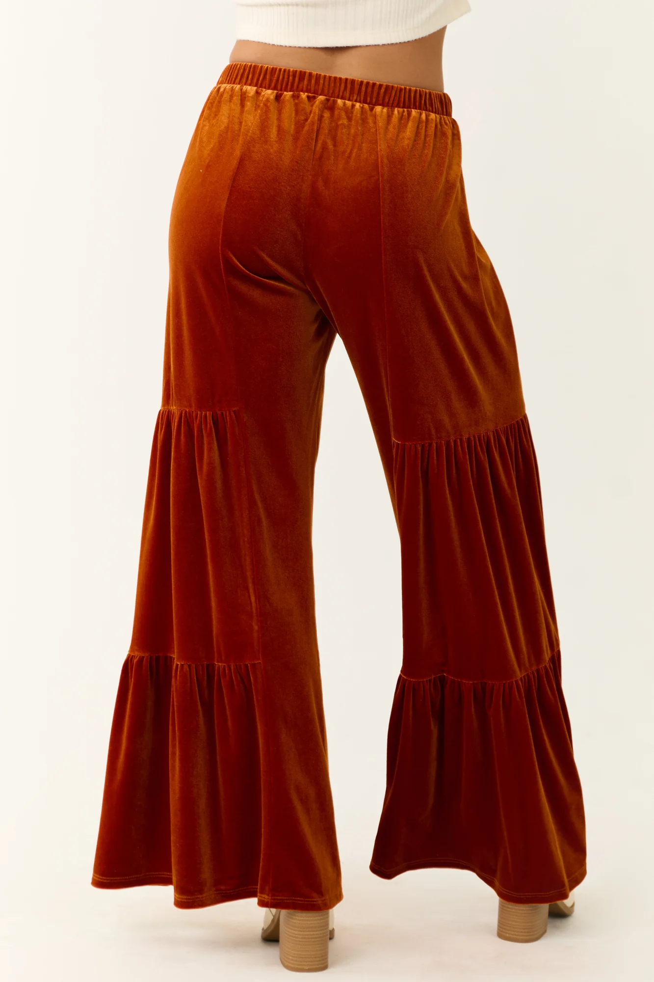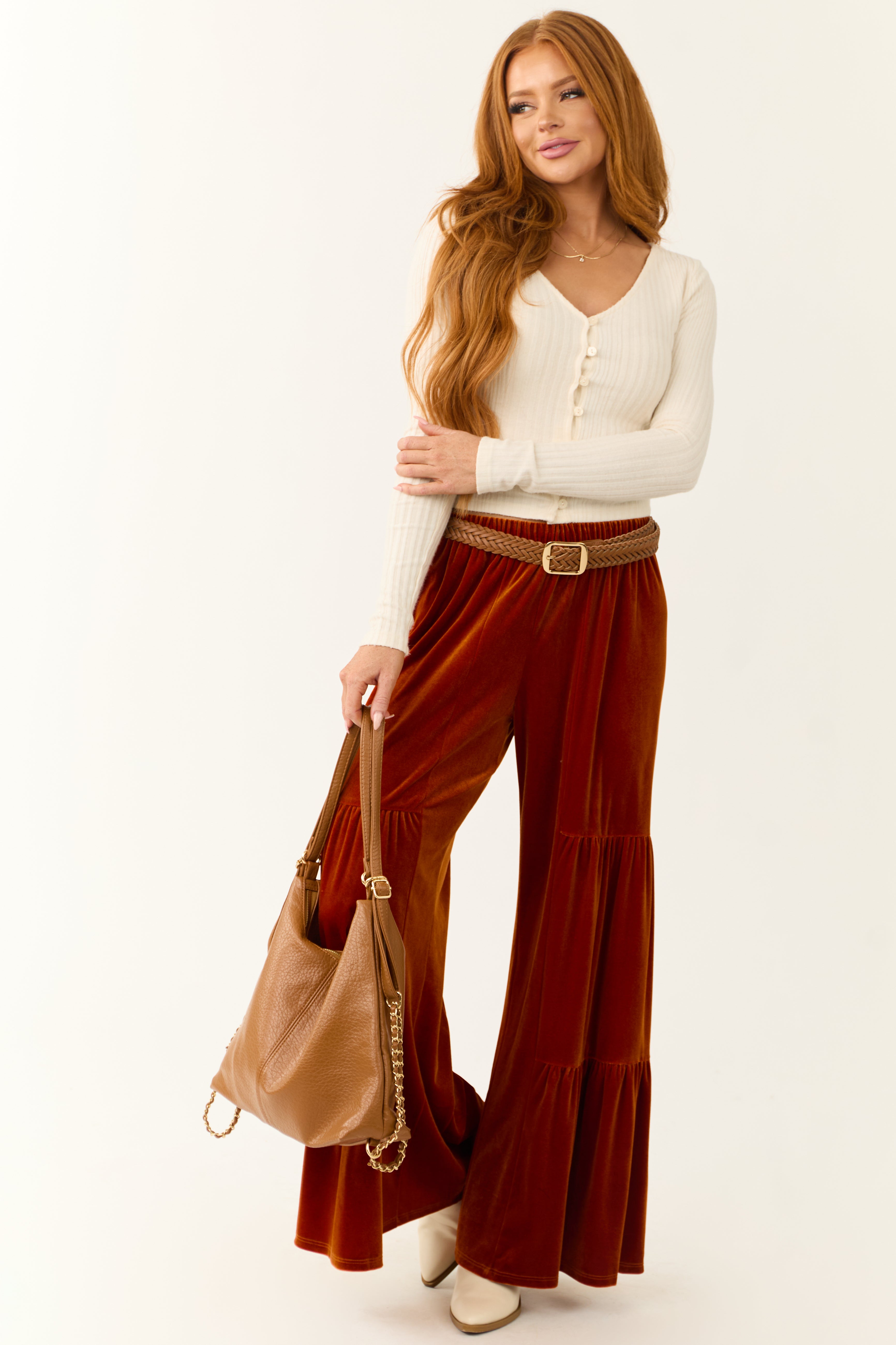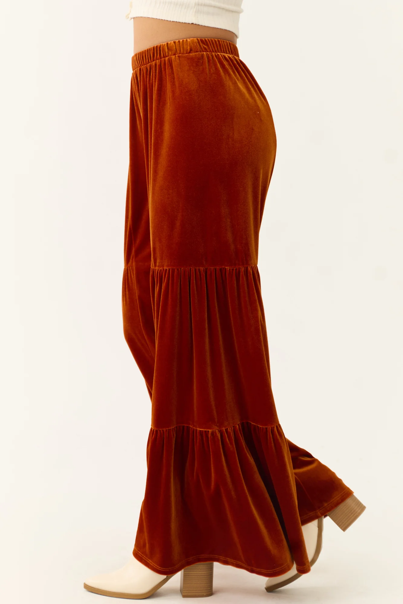 Indulge in luxurious comfort with our burnt orange velvet wide leg pants that embody elegance and style. Available in sizes S, M, and L, with an elastic waistband for a perfect fit. Crafted from semi-stretchy 96% Polyester and 4% Spandex fabric, these pants offer a flattering silhouette and a 30-inch inseam. Ideal for date nights and evenings out. Hand wash cold, line dry. Model wears size Small.