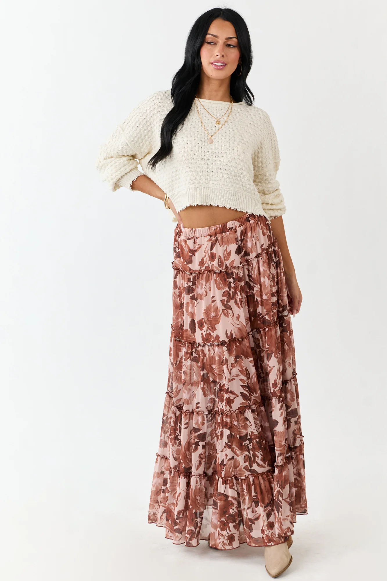 Embrace the romance with our tiered floral mesh maxi skirt in Rose Taupe. Crafted from soft mesh with dreamy florals in Sepia, Caramel, and Cognac shades with frilly layers for a whimsical touch. This maxi skirt features an elastic waistband, a mini-length lining, and is composed of 90% Nylon and 10% Spandex. Feel effortlessly beautiful in this flowy skirt that fits true to size. Garment specifications for size small: Waist – 26 inches, Length – 42 inches. Imported and lined with 100% Polyester. Model is 59″ tall with a bust of 34″, waist of 26″, and wearing a size Small.