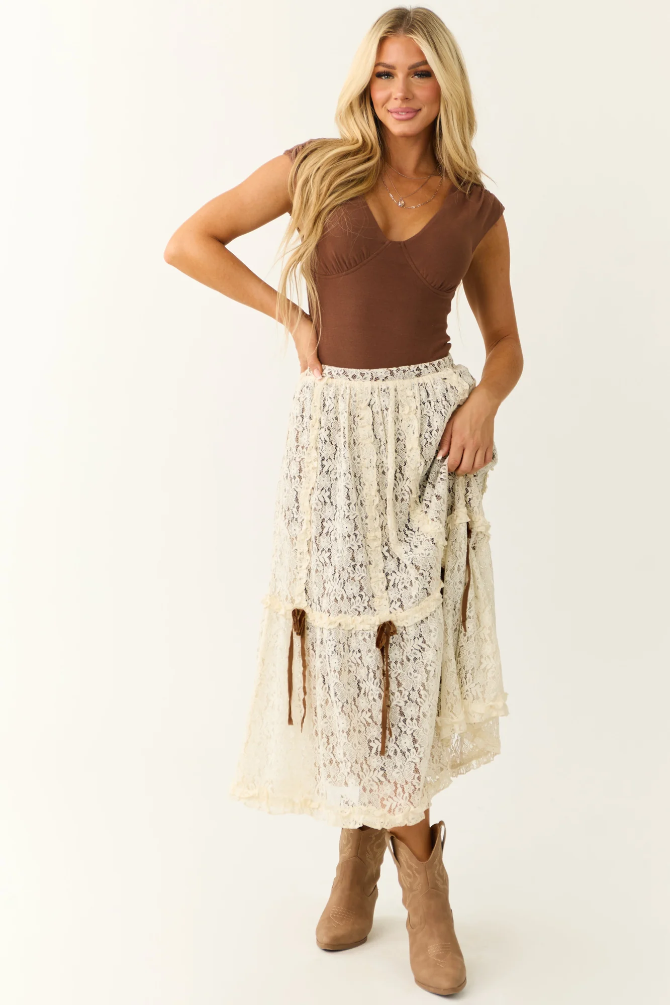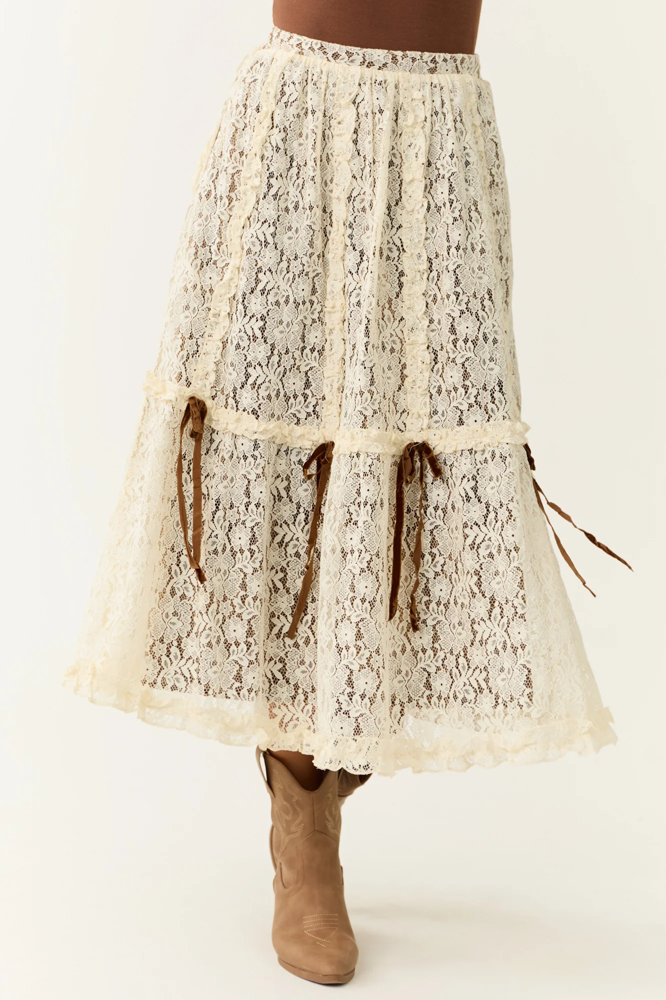 Indulge in elegance with our tiered lace and velvet midi skirt featuring a charming bow detail. This skirt comes in sizes small, medium, and large with waist measurements ranging from 23 to 36 inches and a length of up to 34 inches. The non-stretchy woven mesh outer layer complements the floral lace design, while the stretchy velvet knit lining offers a comfortable fit. Complete with two pockets, this skirt is a perfect blend of style and functionality. Hand wash for best care results.