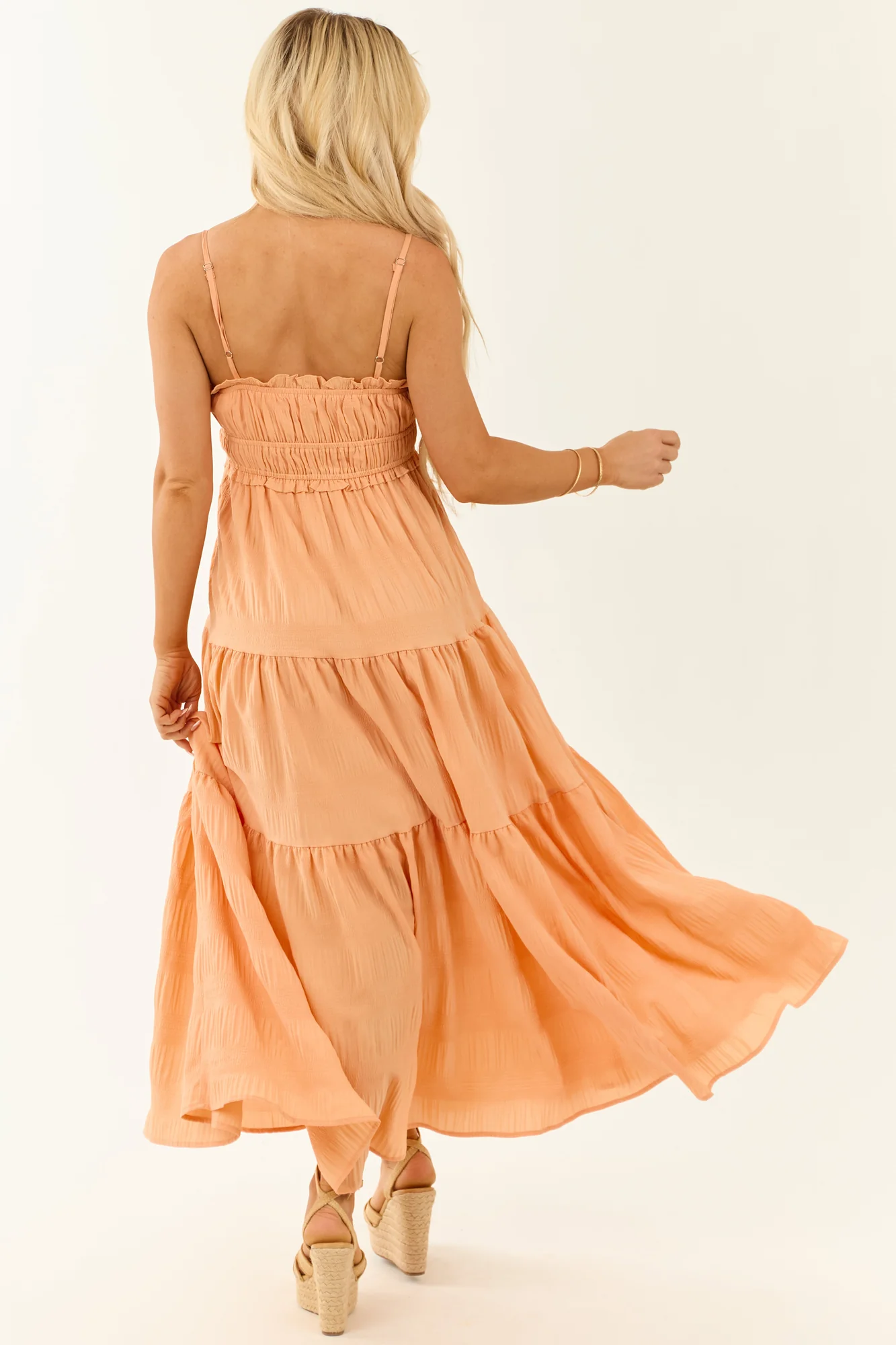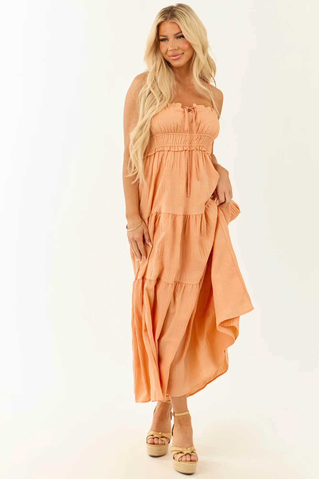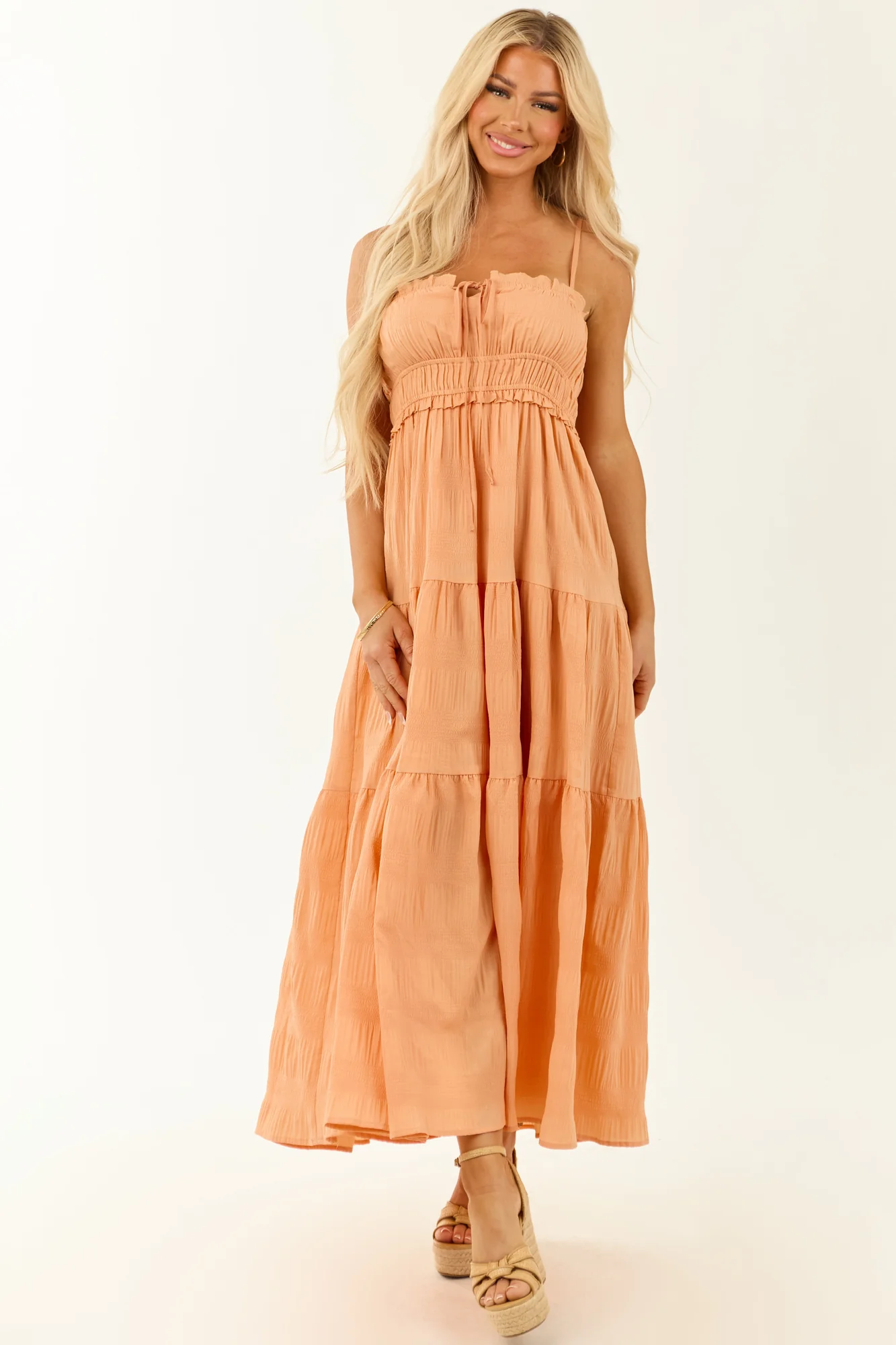 Embrace warmth and wanderlust in this bold and breezy tiered textured maxi dress perfect for golden hour escapes. This radiant dress features an elastic neckline and waistband for a comfortable fit, adjustable spaghetti straps, non-cinching bust tie, and elegant frill details. Lined to the knee, made of 100% polyester with a 100% rayon lining. Imported. Available in sizes S, M, and L. Model is wearing a size Small. Models measurements: Height 57, Bust 34, Waist 26.
