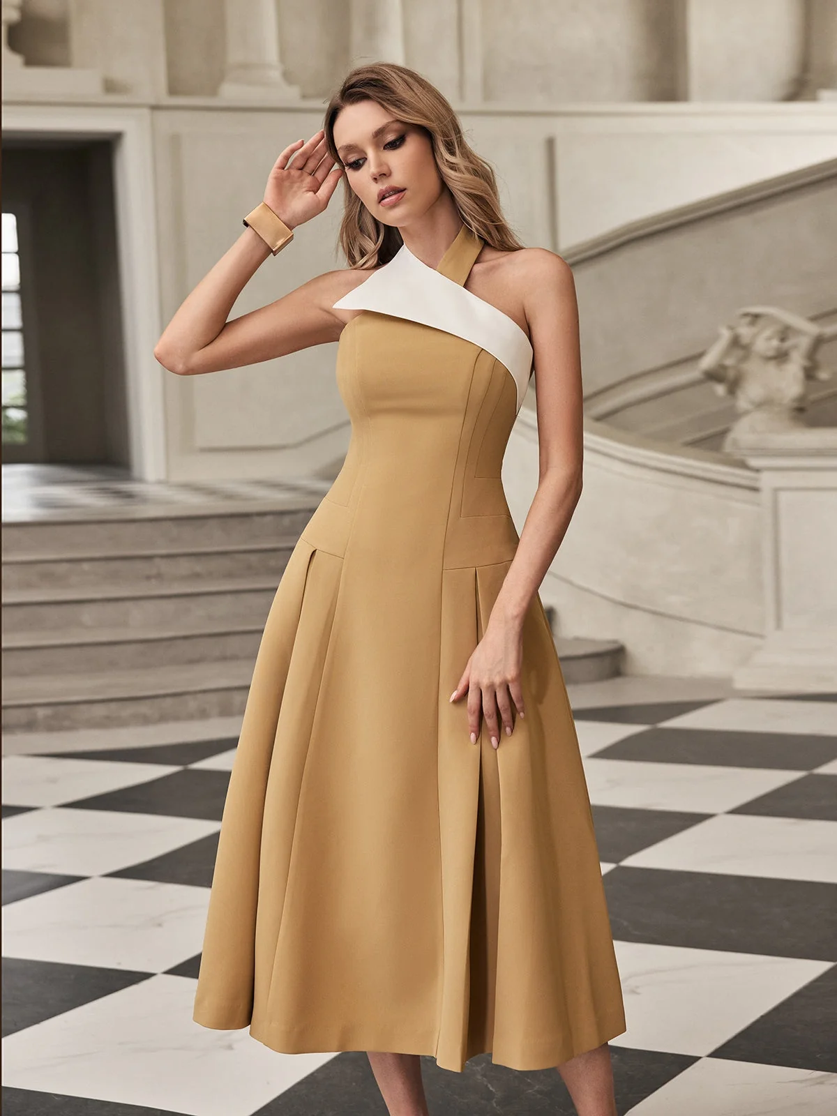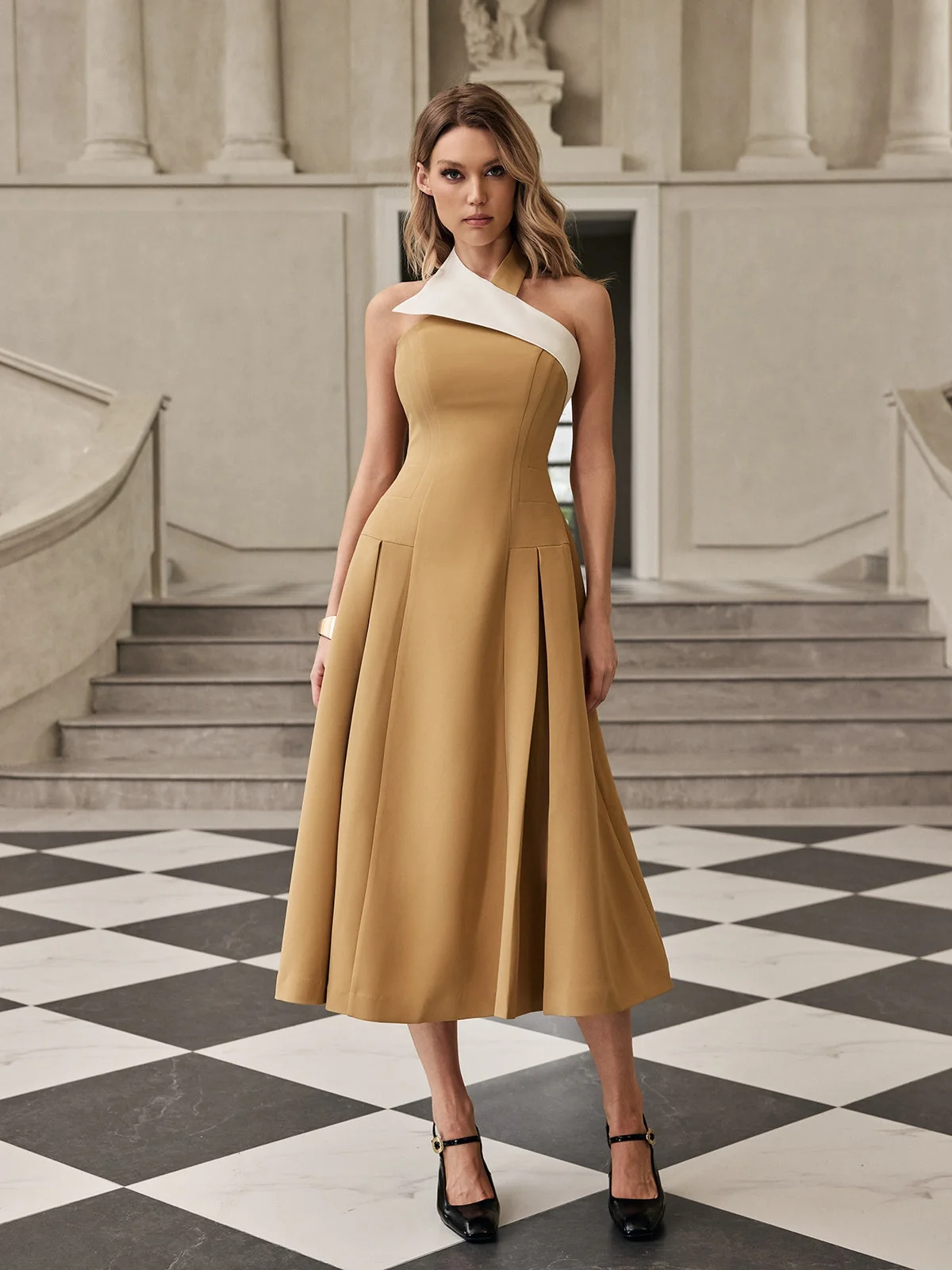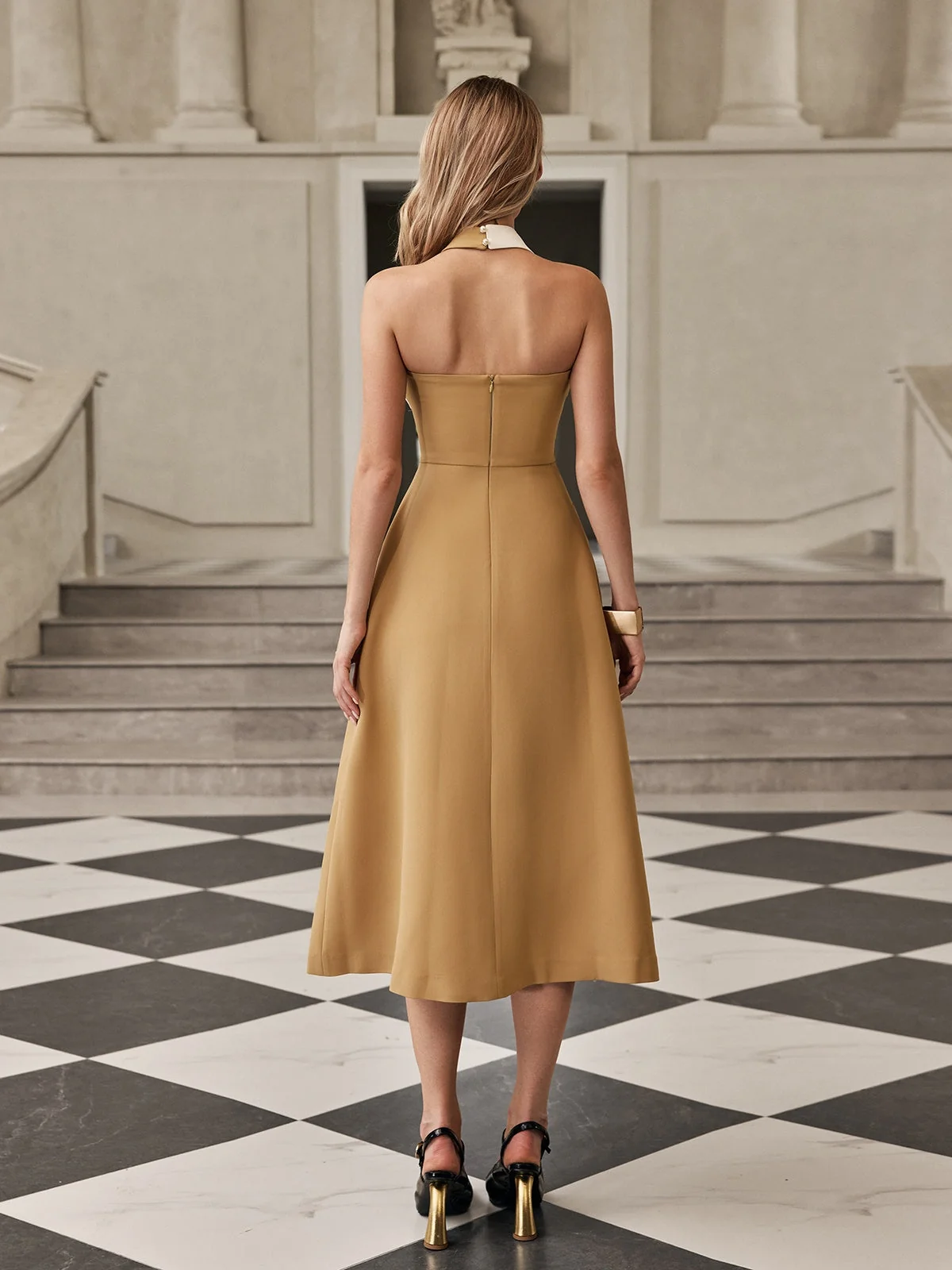 Elevate your style with the Toast Tan Halterneck Midi Dress. Crafted from 100% Polyester with a flattering design, slight stretch, and invisible zipper back closure. This dress in warm toast tan offers elegance and comfort, perfect for any occasion from day to night. Highlight your silhouette with confidence and chic flair. Hand wash cold for best care.