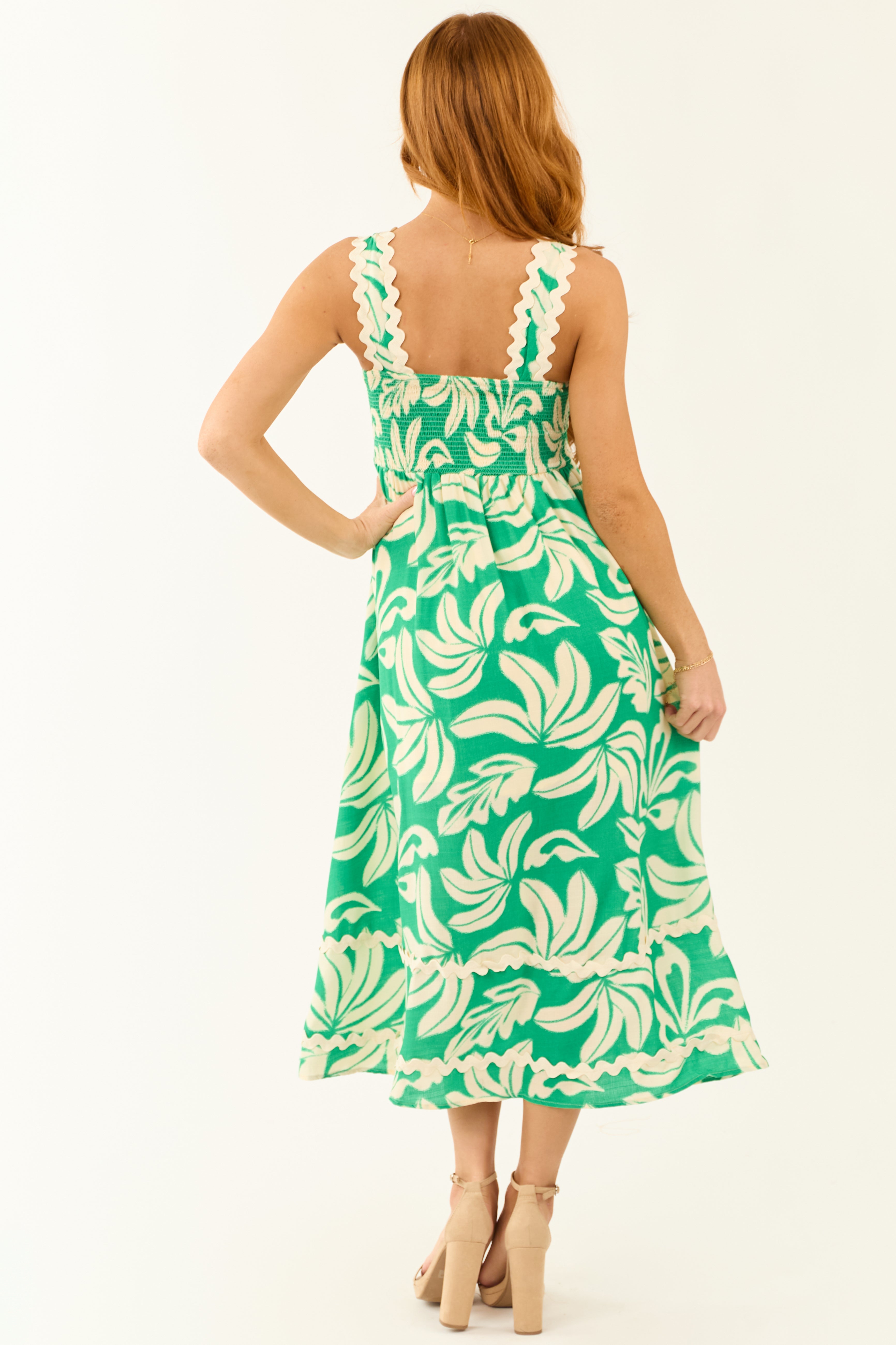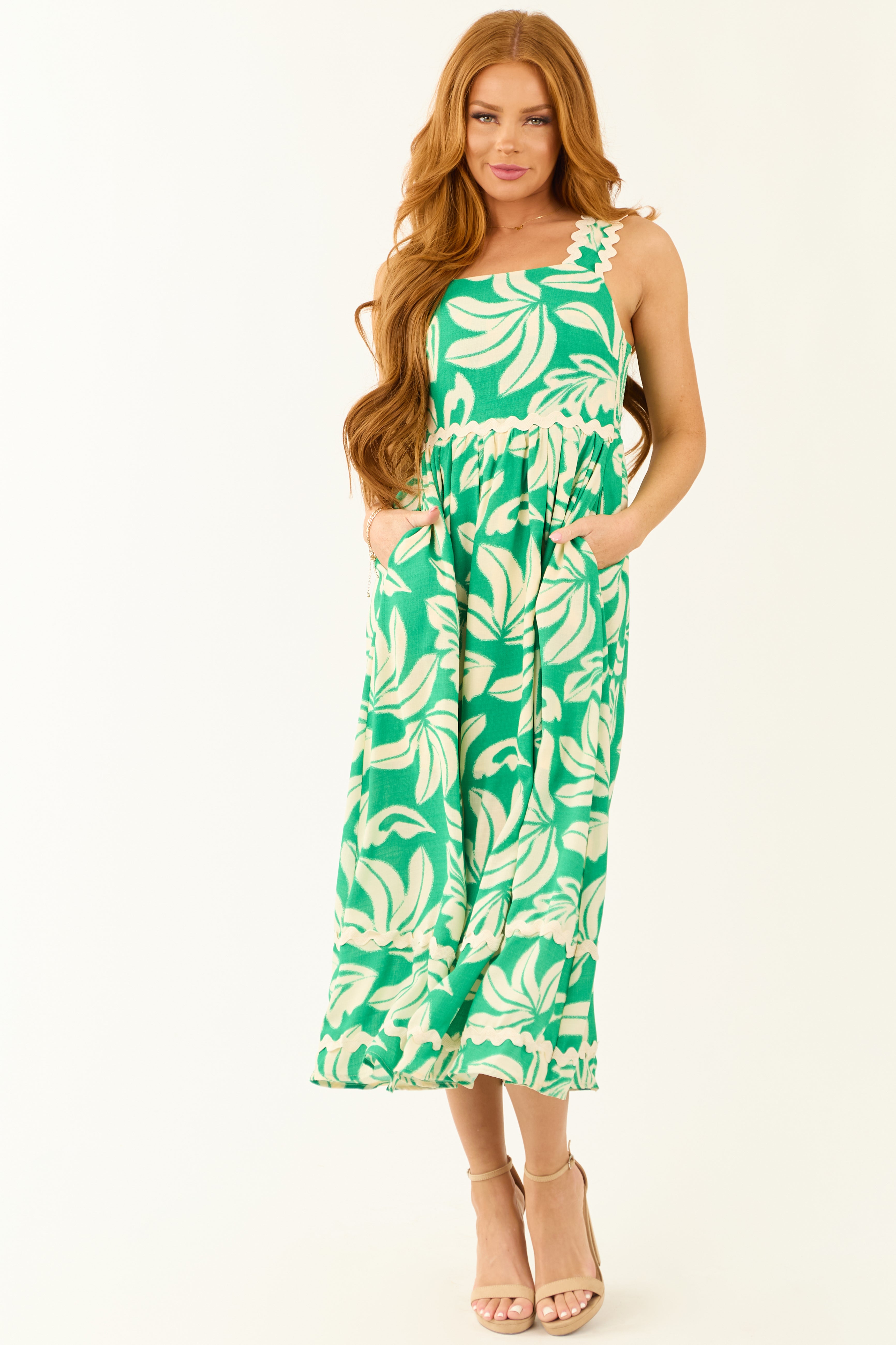 This stunning Tropical Leaf Print Midi Dress in Kelly Green and Cream offers a stylish and comfortable option for any casual or daytime event. With wavy cream strap, waist, and skirt contrast detail, square neckline, and sleeveless design, this dress is the perfect blend of fashion and comfort. Made from 100% Polyester with a 100% Rayon lining, it features dart seams, pockets, and a smocked elastic back for a flattering fit. Keep it looking fresh by hand washing cold and line drying. Feel confident and chic in this dreamy dress that fits true to size.