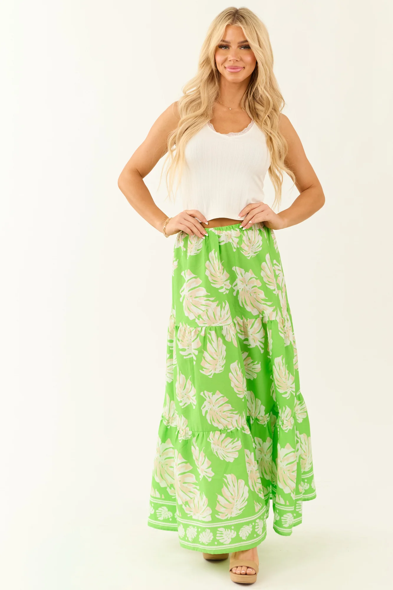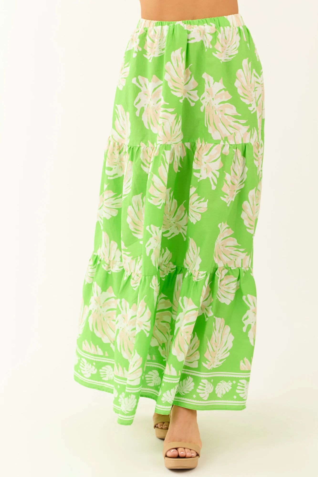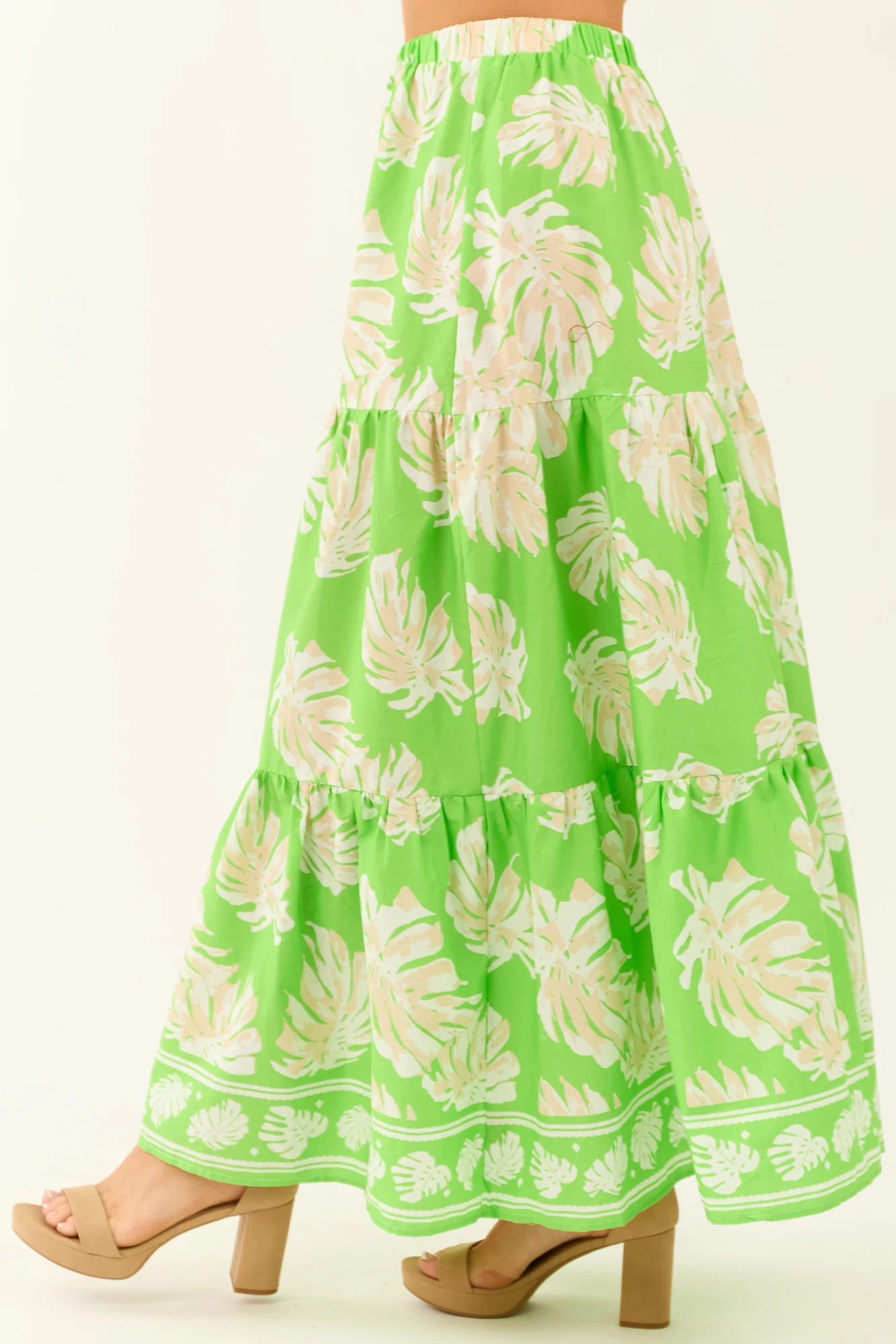 Embrace tropical vibes with our vibrant Cotton Maxi Skirt in shades of Lime, Ivory, and Taupe. Available in sizes S, M, L. This non-stretchy woven skirt features an elastic waistband for a comfortable fit and extra room. Its intricate tiered print adds a playful touch to your wardrobe. Perfect for daytime or party wear, this skirt pairs beautifully with our matching top. Hand wash cold, lay flat to dry. Please note each piece is unique due to the cutting and sewing process. Model is wearing size Small.