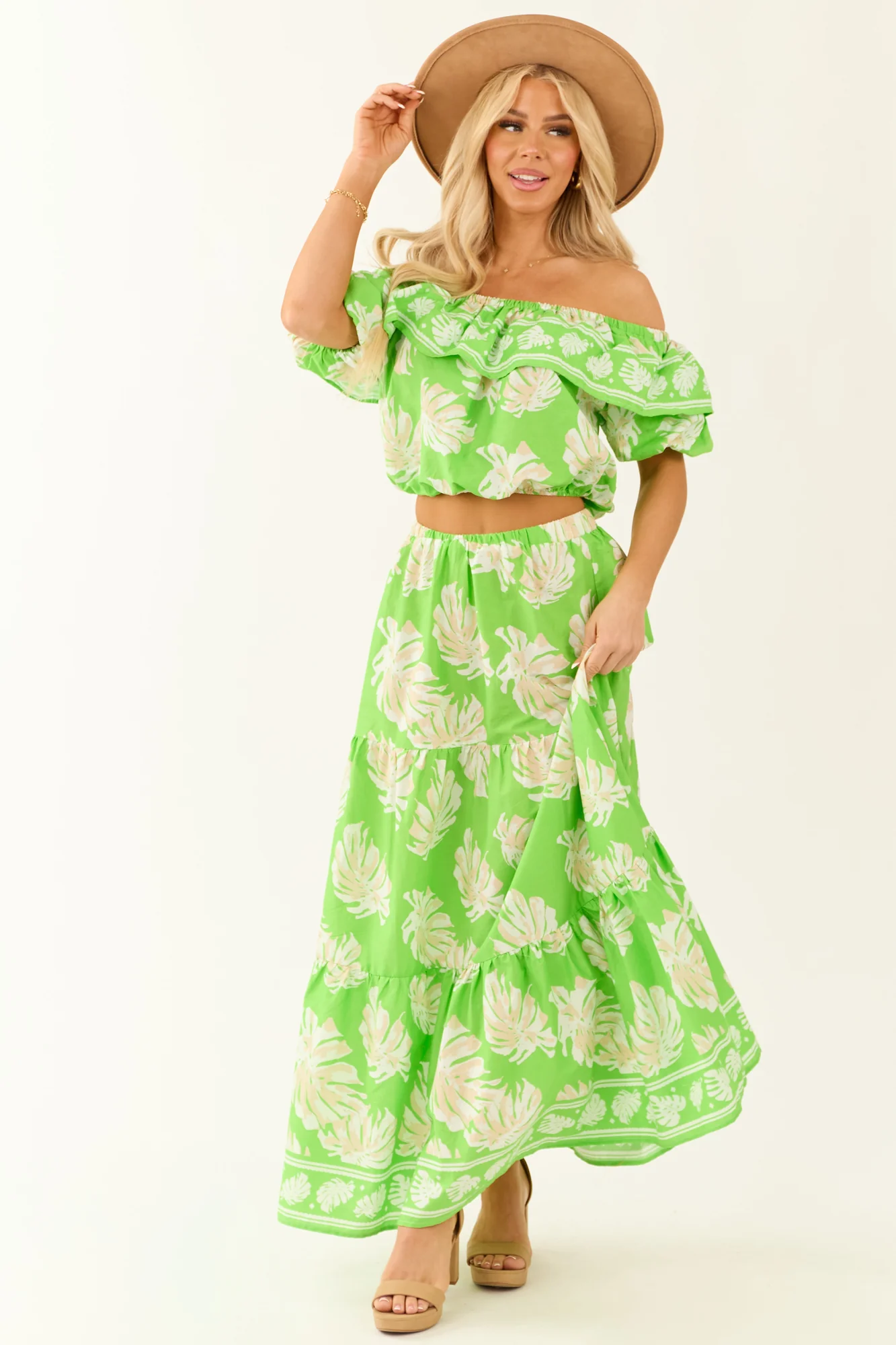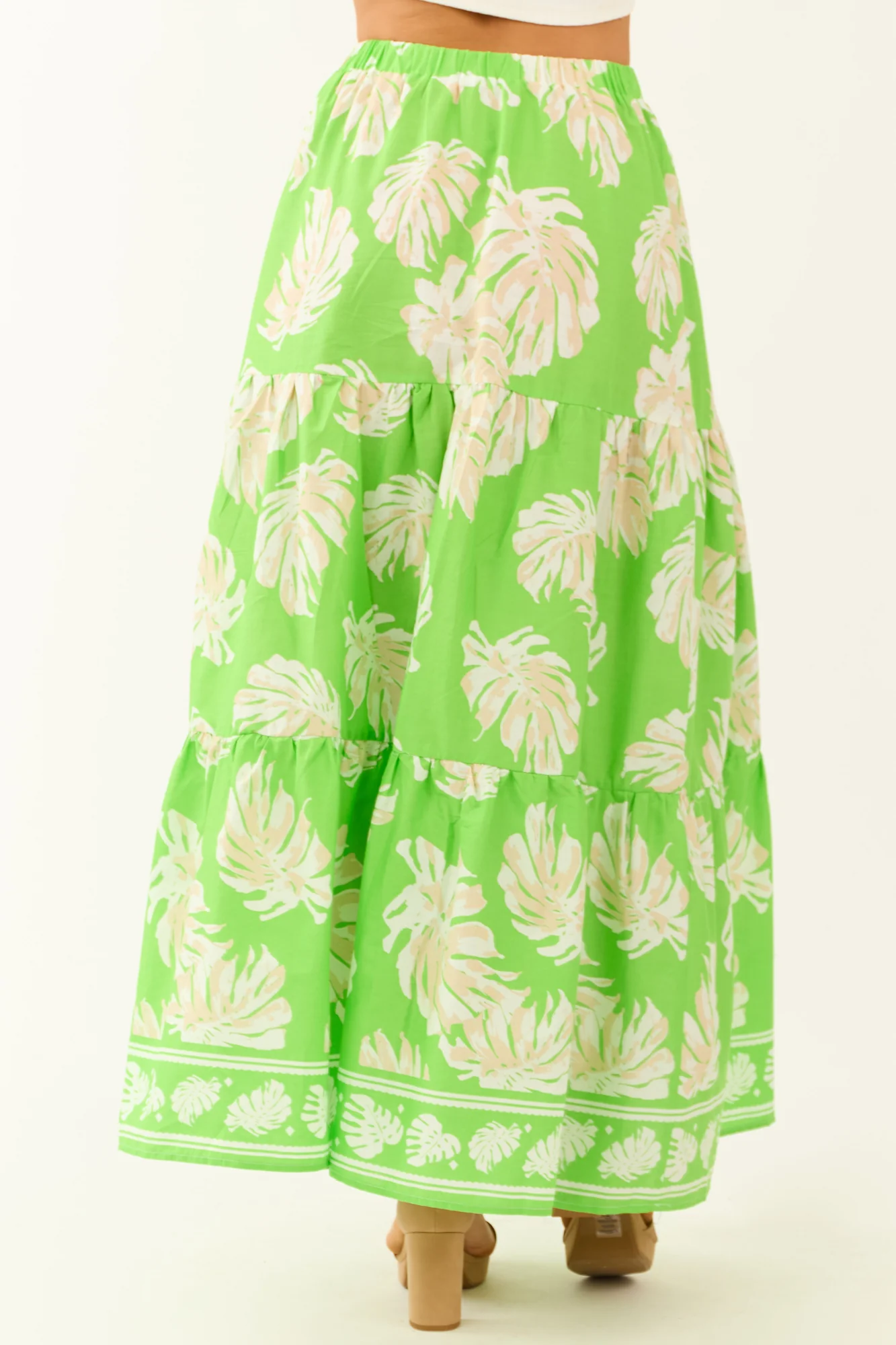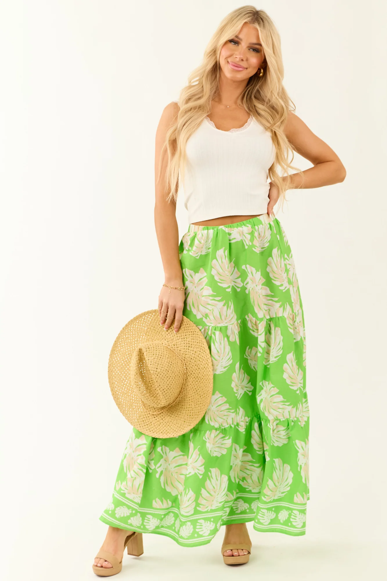 Embrace tropical vibes with our vibrant Cotton Maxi Skirt in shades of Lime, Ivory, and Taupe. Available in sizes S, M, L. This non-stretchy woven skirt features an elastic waistband for a comfortable fit and extra room. Its intricate tiered print adds a playful touch to your wardrobe. Perfect for daytime or party wear, this skirt pairs beautifully with our matching top. Hand wash cold, lay flat to dry. Please note each piece is unique due to the cutting and sewing process. Model is wearing size Small.