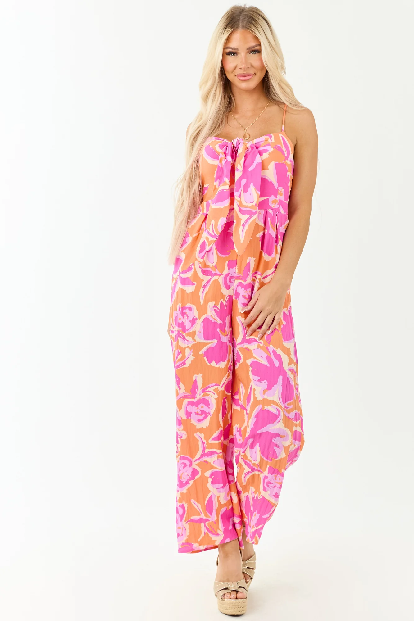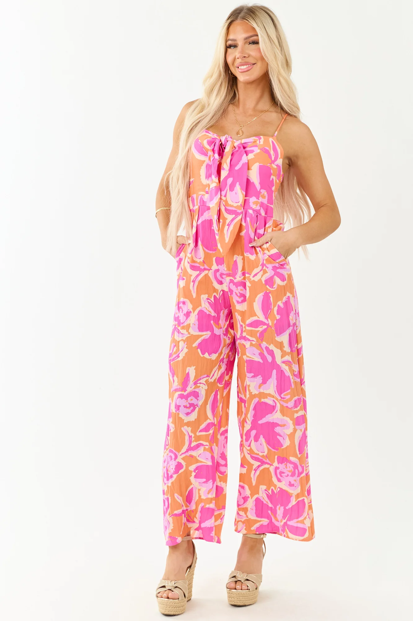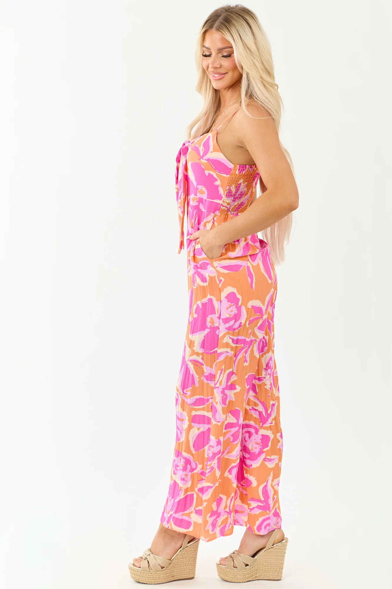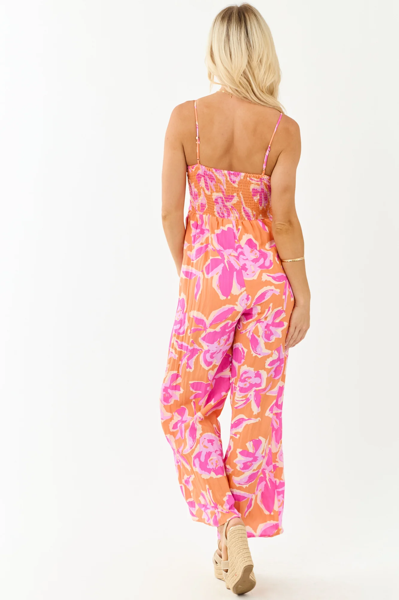 This vibrant jumpsuit brings vacation vibes to your wardrobe with its Papaya, Magenta, Iris, and Cream colors. Lightweight and tropical, this jumpsuit features a fitted bust, smocked back, wide legs, and side pockets. Perfect for sunny days and warm nights, this jumpsuit is made of 95% Rayon and 5% Nylon with a 100% Polyester lining. Available in sizes XS to XL. Embrace the floral variations that make each piece unique and stylish. Order now and stand out with this stunning outfit!