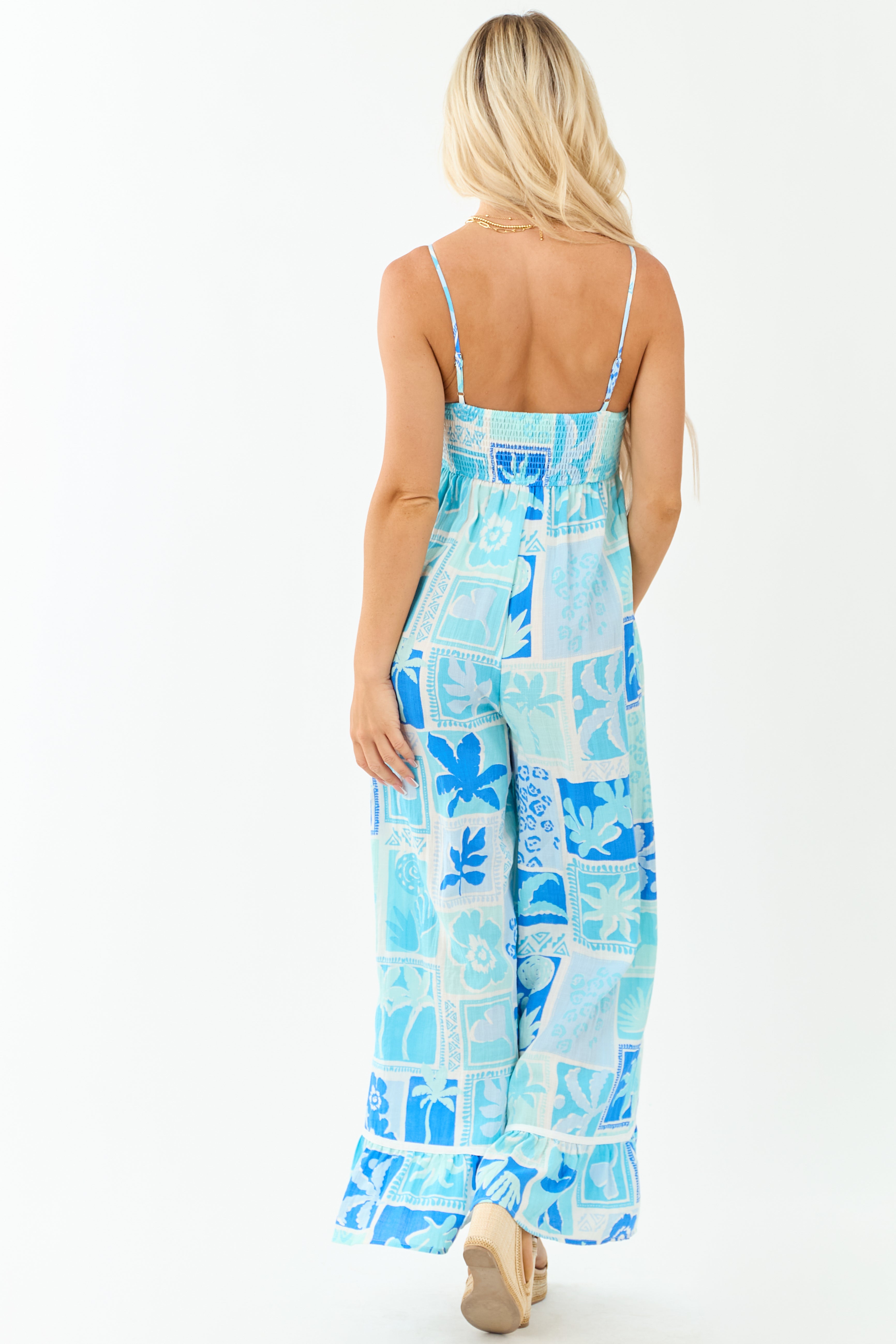 Indulge in tropical vibes with this souvenir print jumpsuit in shades of Off White, Azure, Sapphire, Slate Blue, and Arctic Blue. Perfect for everyday wear with adjustable spaghetti straps, side pockets, and a stretchy smocked back for a comfortable fit. Capture the essence of summer in this unlined jumpsuit made of 80% Rayon and 20% Polyester. Available in sizes XS, S, M, L, and XL. Embrace relaxation and style with this postcard-perfect outfit inspired by travel.