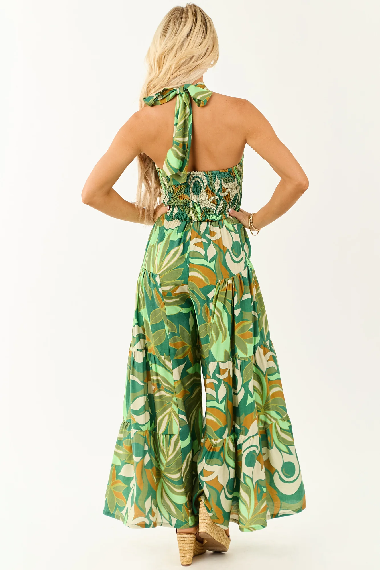 Express your tropical flair with our Kiwi, Pine, Olive Printed Halter Front Tie Jumpsuit. Perfect for sunset dinners and beach getaways, this jumpsuit features a wide palazzo leg, an adjustable halter neck tie, and side pockets. Stay fresh and fierce wherever you go! Available sizes: XS, S, M, L, XL. Fits true to size. Garment measurements for size small: Bust – 32″, Waist – 26″, Torso Length – 25″. Made of 82% Rayon, 18% Nylon; lined bodice: 100% Rayon. Disclaimer: Due to the cutting process, print placement may vary. Model is wearing a size Small – Height: 57″, Bust: 34″, Waist: 26″.