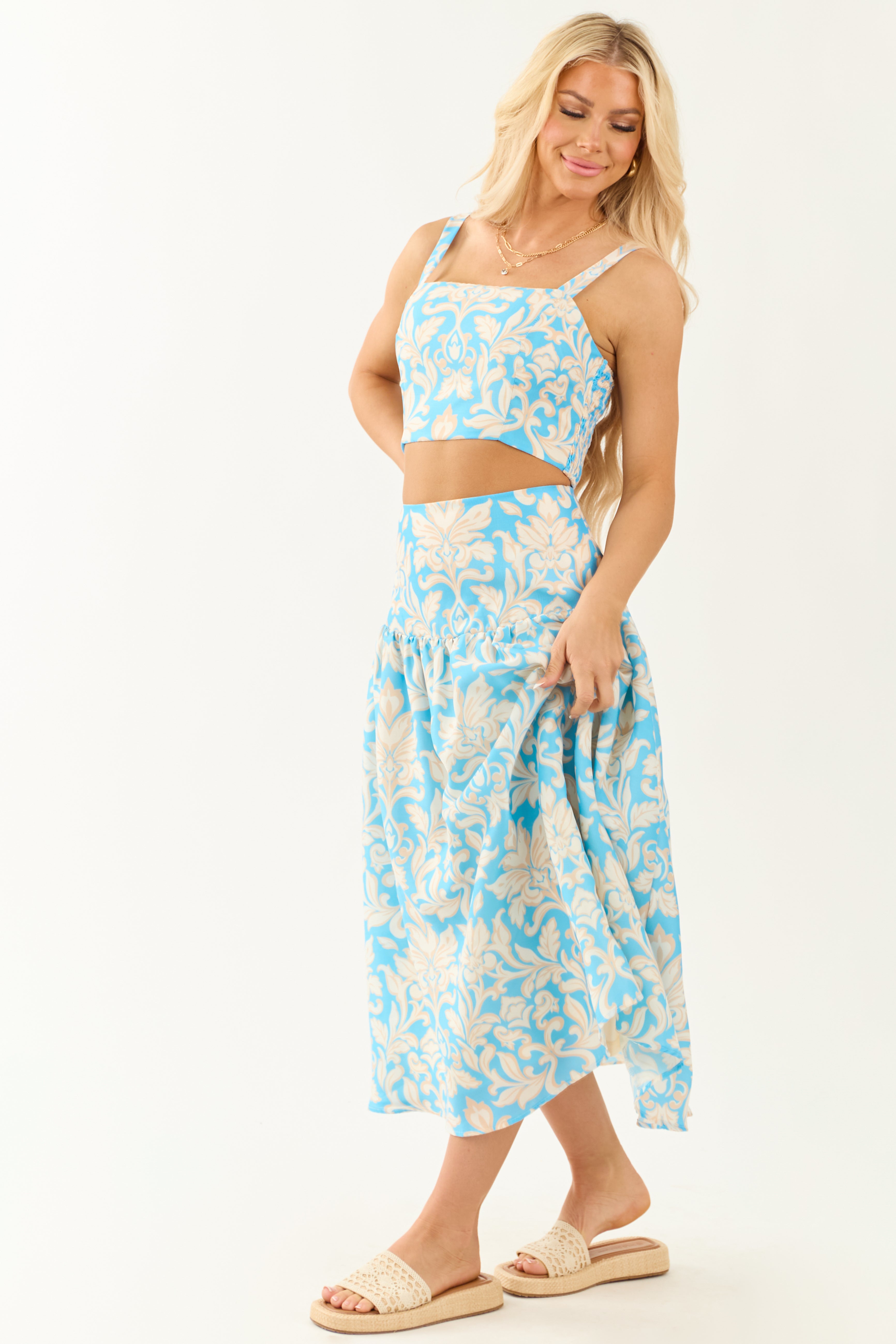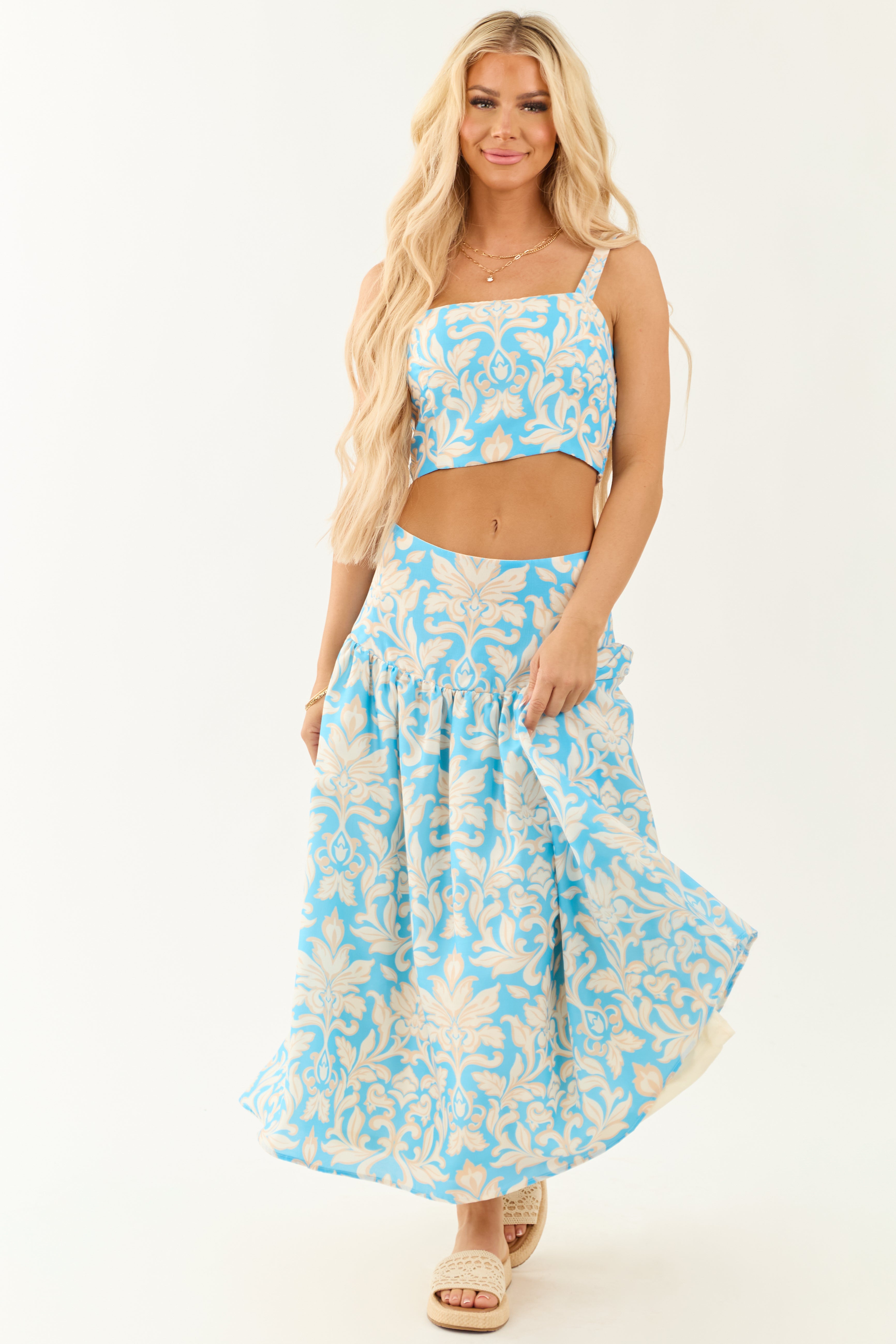 Indulge in the elegance of our Turquoise Damask Crop Top and Midi Skirt Set designed for sophistication and comfort. The set features a square neck, sleeveless crop top with adjustable spaghetti straps and a smocked elastic back. The matching midi skirt, with hidden back zipper and hook closure, flows gracefully for a chic look. Crafted in non-stretchy woven fabric in shades of Turquoise, Cream, and Almond. Perfect for a stylish day out or a special event. Hand wash cold, lay flat to dry. Exude timeless beauty with this Damask set!