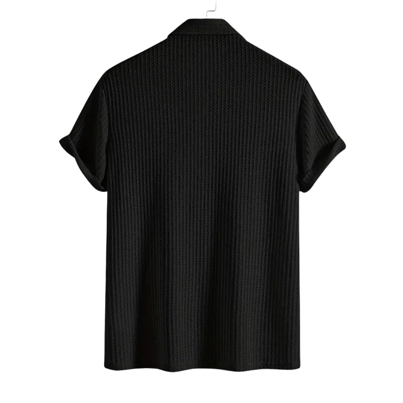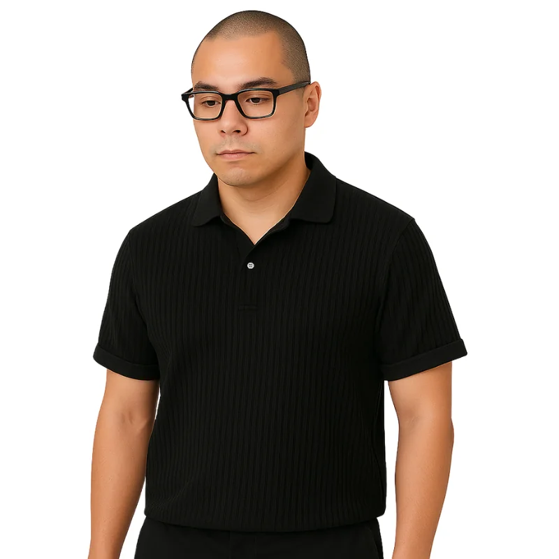 Unleash the essence of the night with the Urban Nights Black Cotton Polo Shirt . This shirt captures the allure of urban evenings with its deep black color and subtle textured pattern, making it a staple for any wardrobe looking for a touch of retro sophistication. Crafted from 100% premium cotton, it offers breathability and comfort for all-day wear. The distinct textured vertical stripe adds depth and character to the classic black polo. Styled with a sleek point collar and a practical three-button placket, the shirt provides a clean, versatile look. Available in a standard fit that complements any body type for a balance of comfort and style. Ideal for casual gatherings and semi-formal settings, easily paired with jeans or dress pants. Available in sizes ranging to XXL to cater to diverse body shapes and preferences.