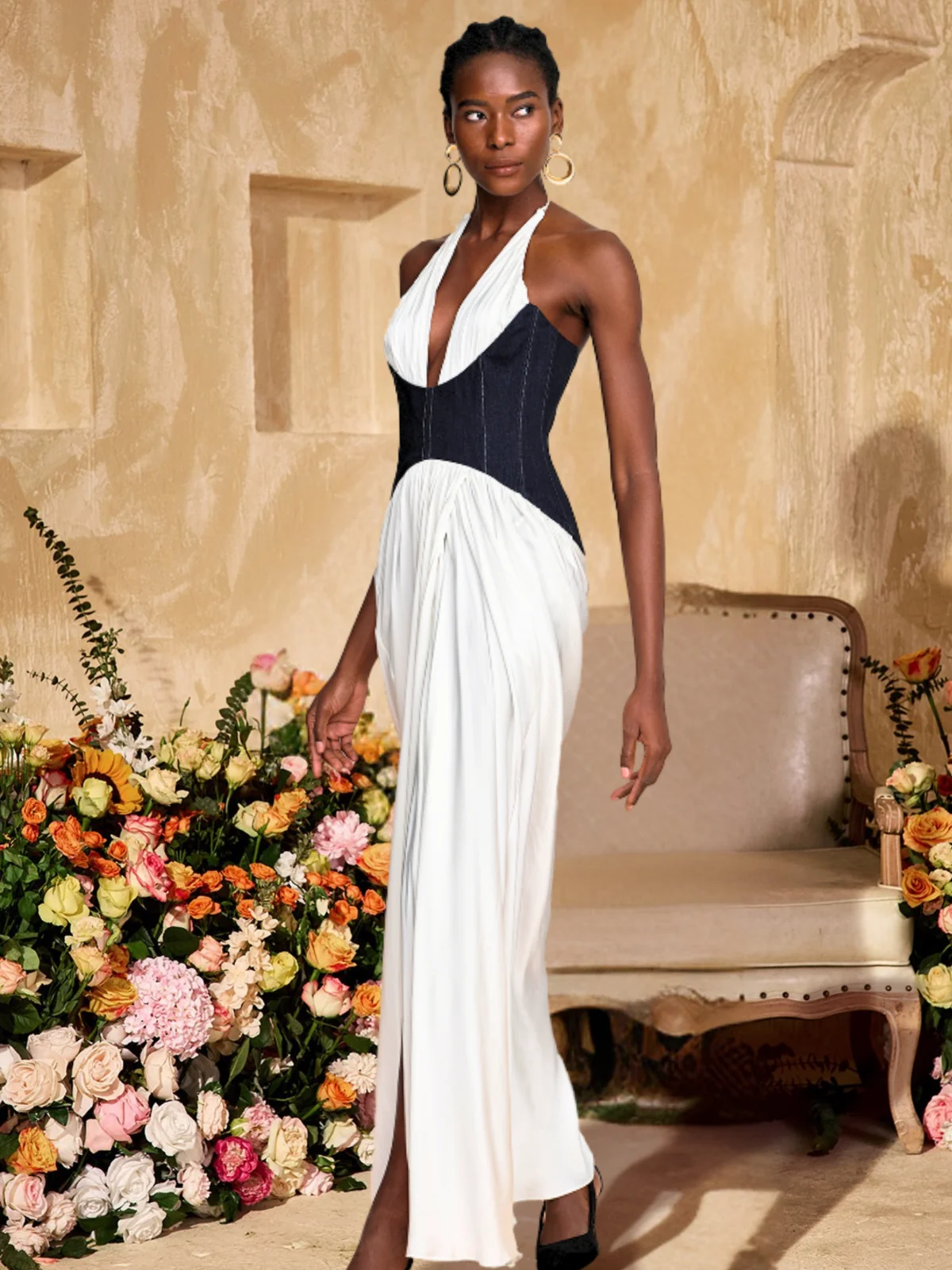 Elevate your style with our stunning V-neck ruched maxi dress featuring an alluring thigh-high split. This dress enhances your silhouette with its elegant design, perfect for special occasions or evening events. The flowing maxi length ensures graceful movement and timeless sophistication. Feel confidently chic wherever you go. Crafted from 100% Polyester with a zippered opening at the back. Care: Dry clean only. Please note, color may vary due to lighting. Model is wearing size S.