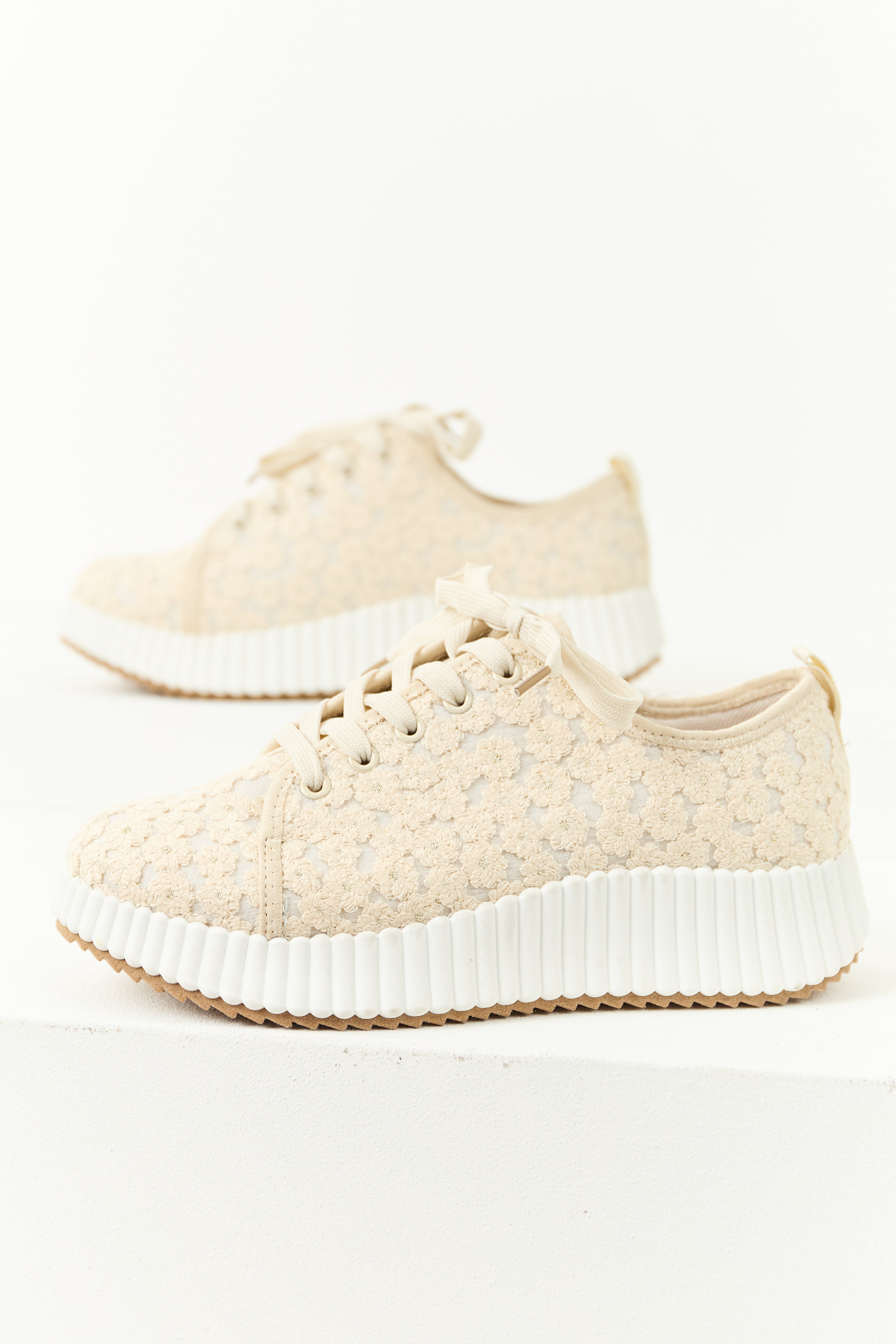 Elevate your style with these lace-up sneakers adorned with floral embroidery in Almond and Gold shades. Enjoy comfort with a lightly cushioned insole and a 1″ platform. Perfect for any occasion. Imported.