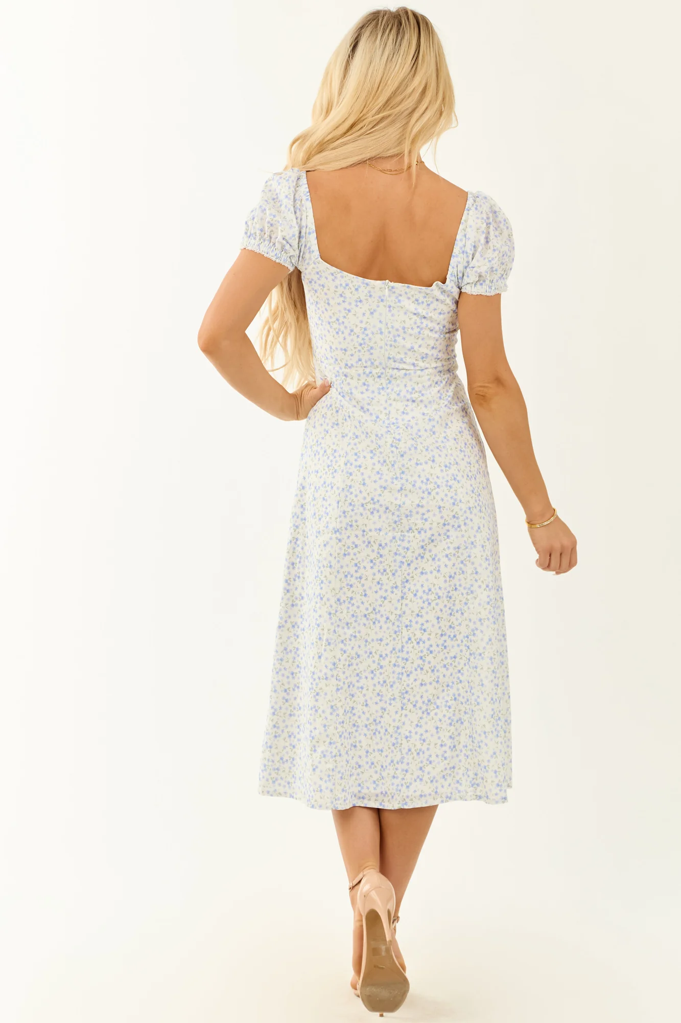 Channel delicate charm with the Vanilla Floral Peasant Style Midi Dress. This soft, sweet, and endlessly feminine dress features floral prints in Vanilla, Cornflower, Sapphire, and Sage colors. Made from a non-stretchy breezy cotton linen blend, it includes a back zipper with hook and eye closure, cinching bust tie, elastic cuffs and shoulders, and short sleeves with lace trim. Lined with 100% polyester, this dress is perfect for spring and summer. Model is wearing a size Small. Size S: Bust 33-35″, Waist 26″, Length 46″. Size M: Bust 35-37″, Waist 28″, Length 46.5″. Size L: Bust 37-39″, Waist 30″, Length 47″.