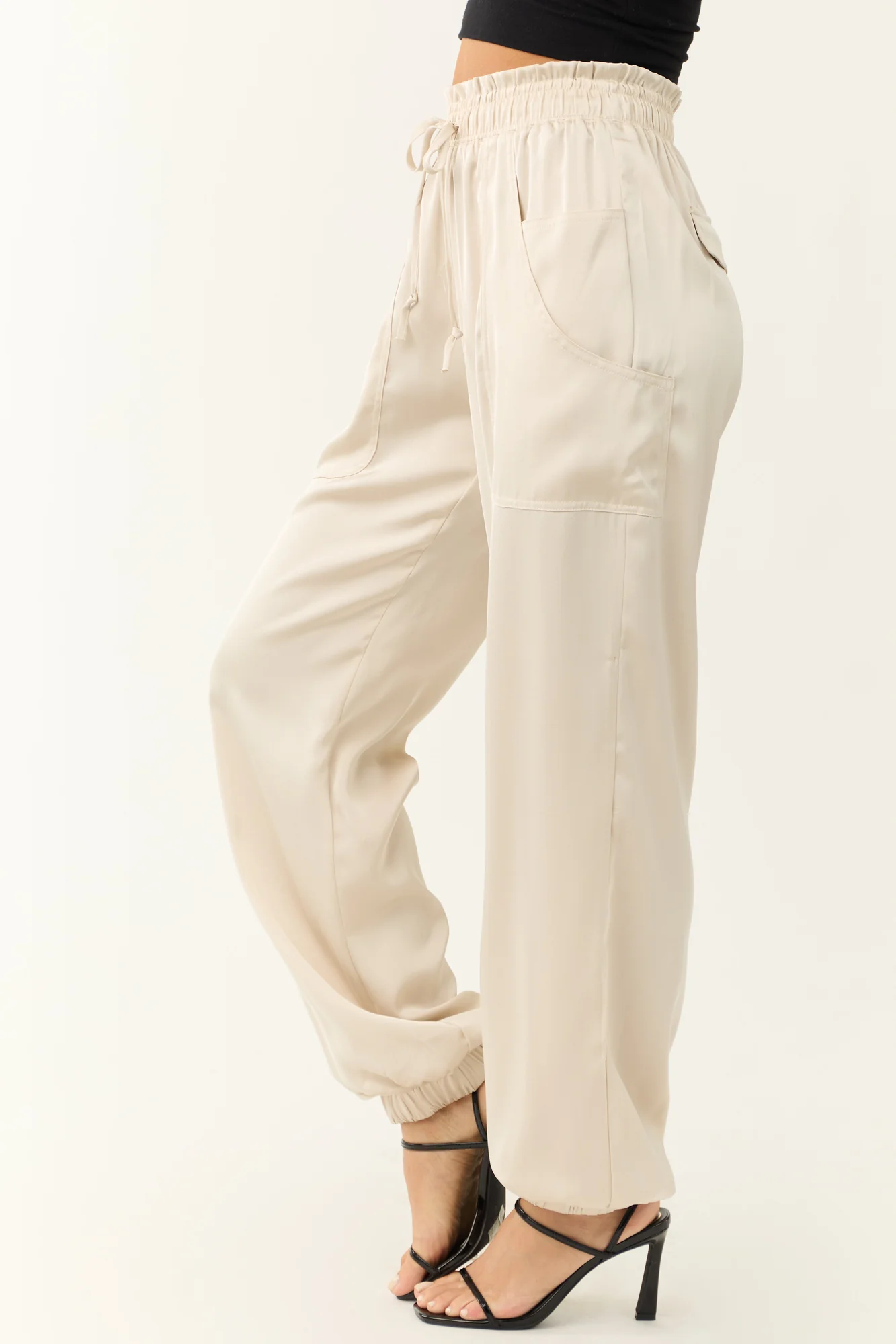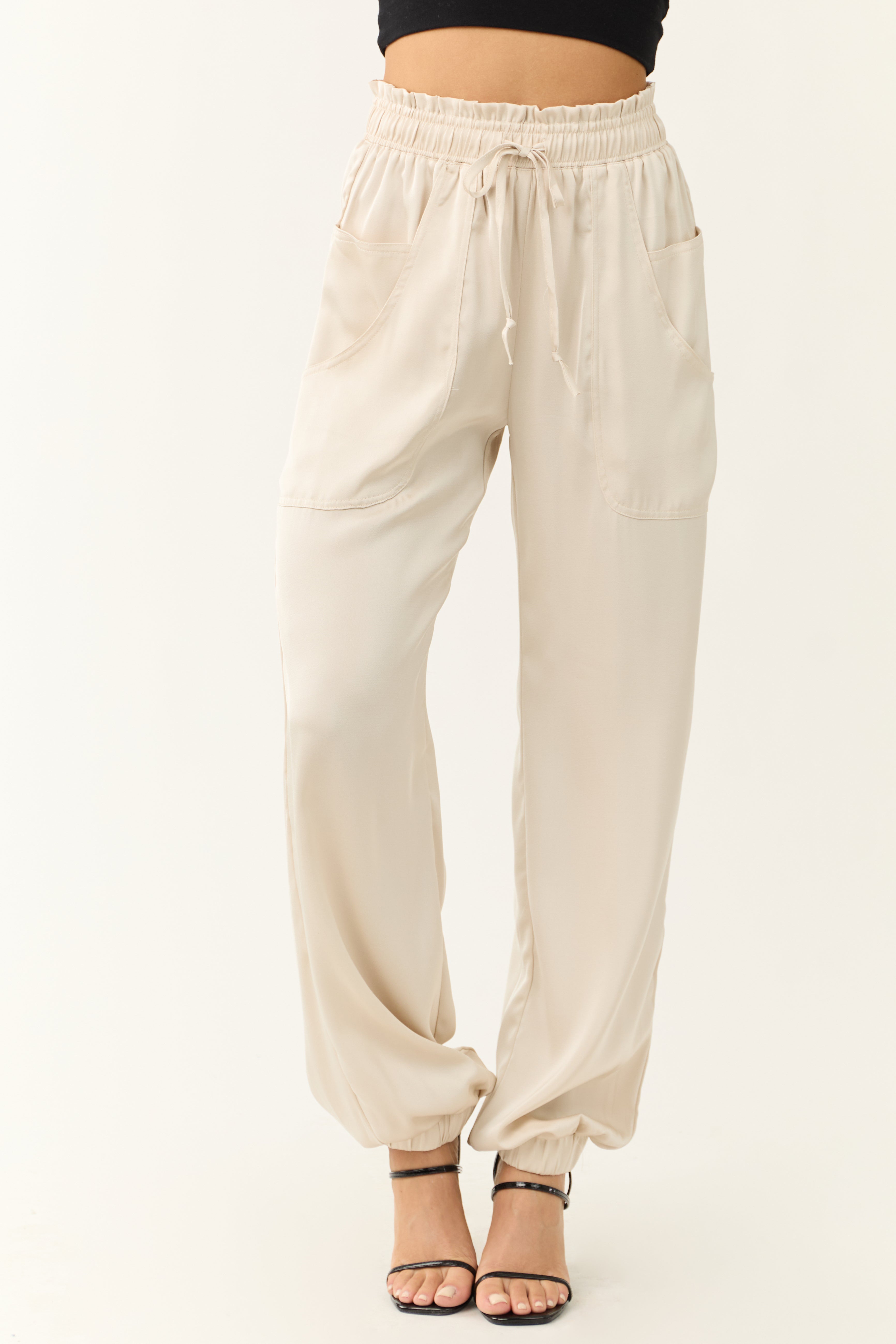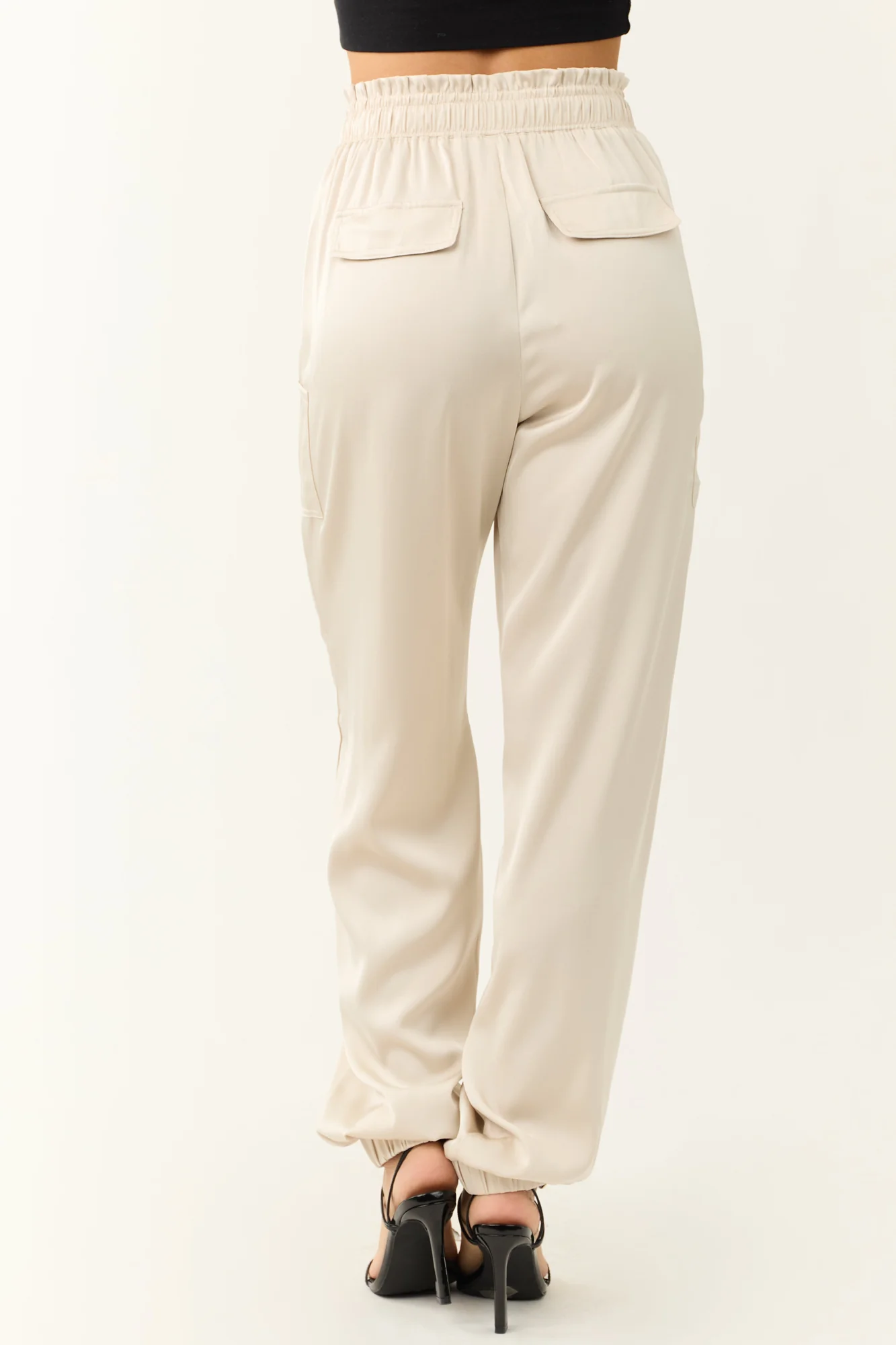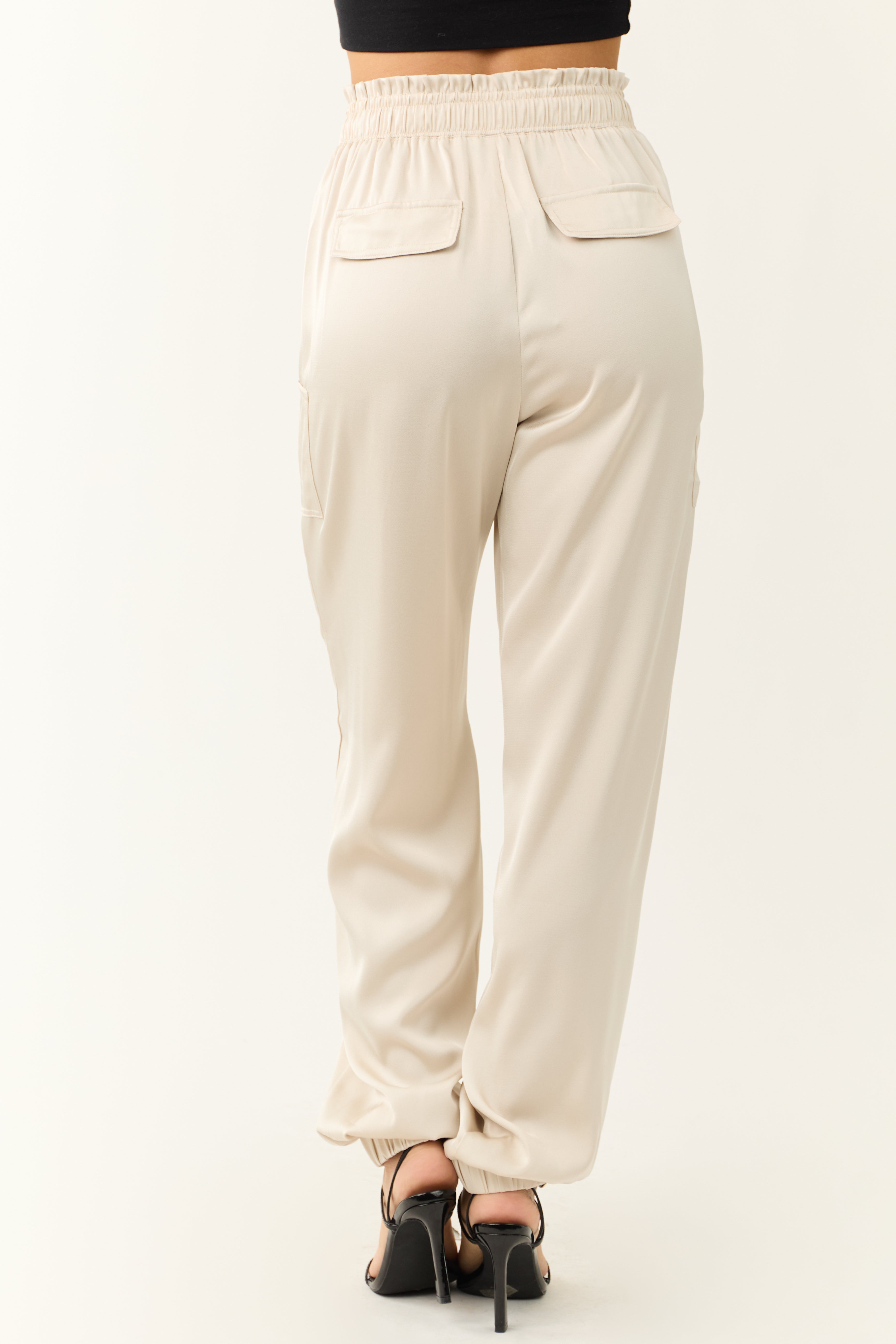 Experience luxury and style with our Vanilla Satin Paper Bag Joggers. Crafted from non-stretchy satin, these high-waisted joggers feature a chic paper bag style waist, double side pockets, and decorative back pockets. The elastic drawstring waist and cuffs ensure a comfortable fit. Made of 100% Polyester. Available in sizes S (2-4), M (6-8), and L (10-12). Inseam lengths vary from 30″ to 31″. Imported. Care instructions: Do not bleach, low iron, dry flat. Model is wearing a size Small. Model’s Profile: Size 1, Height 55″, Bust 31″, Waist 24″.