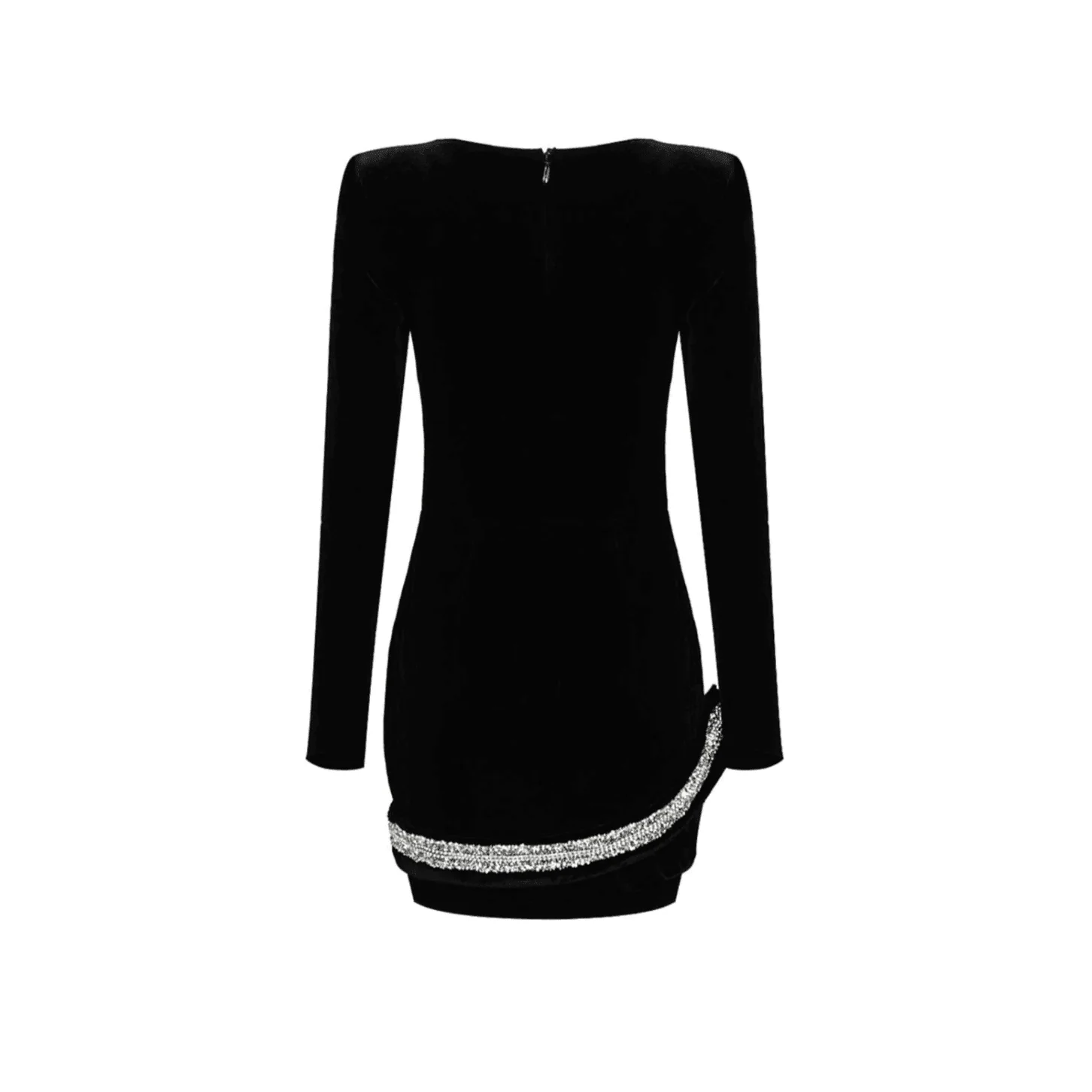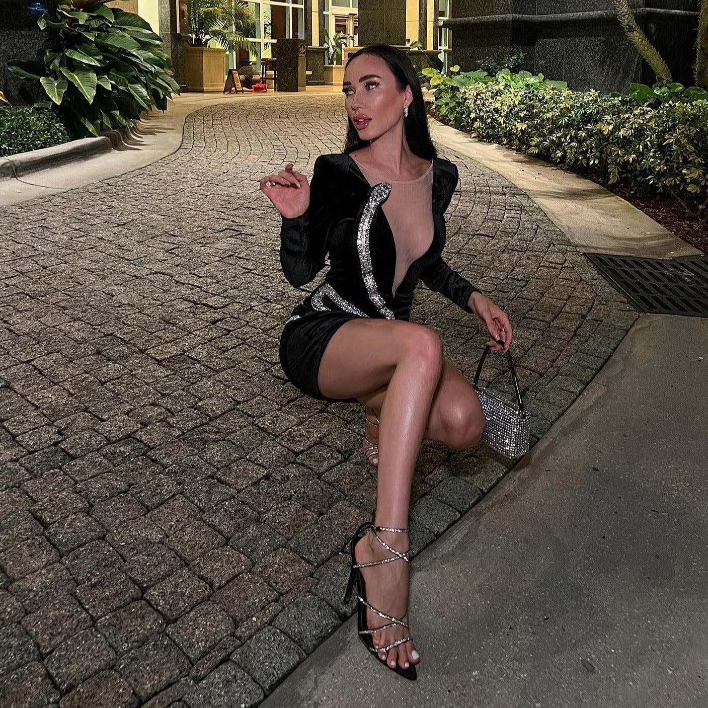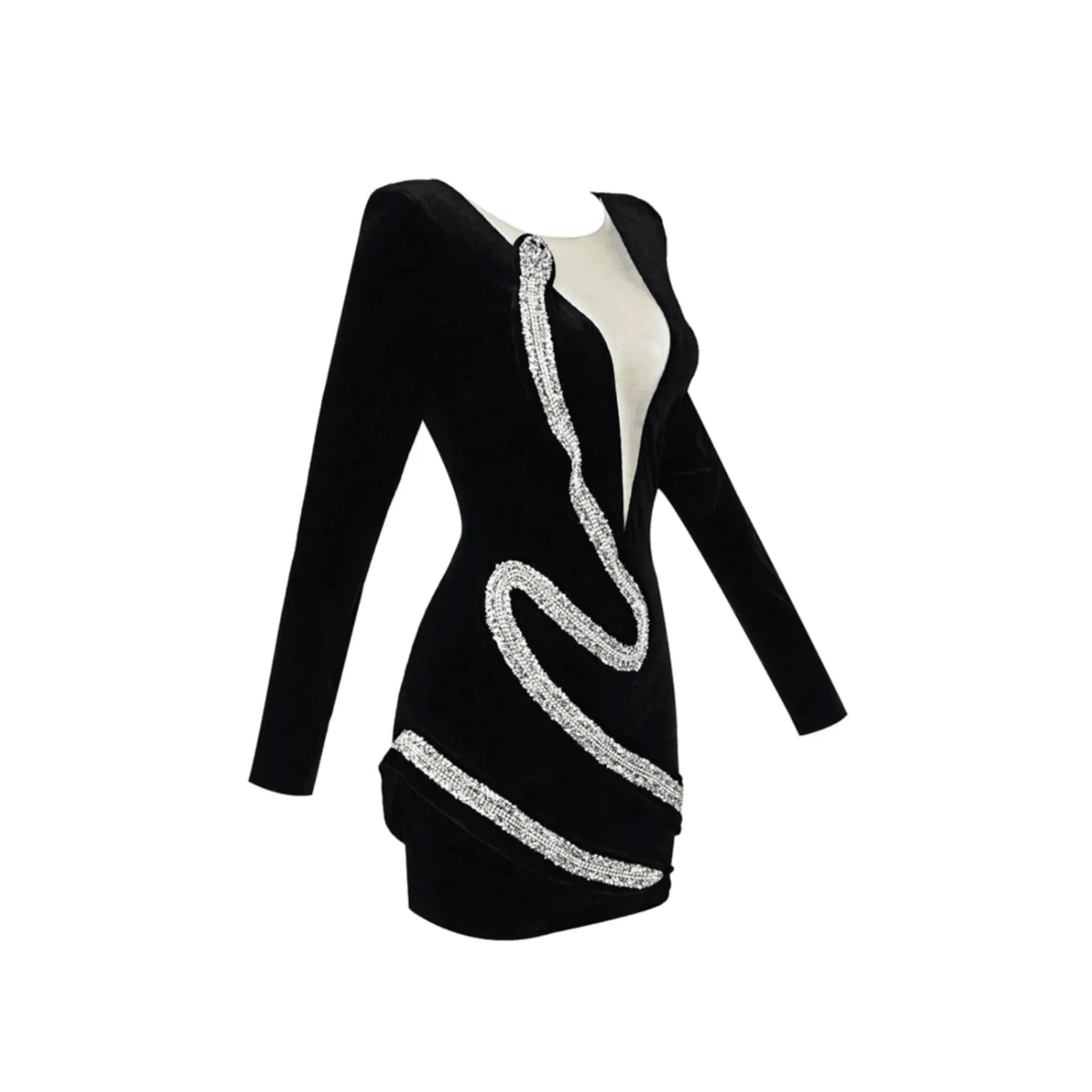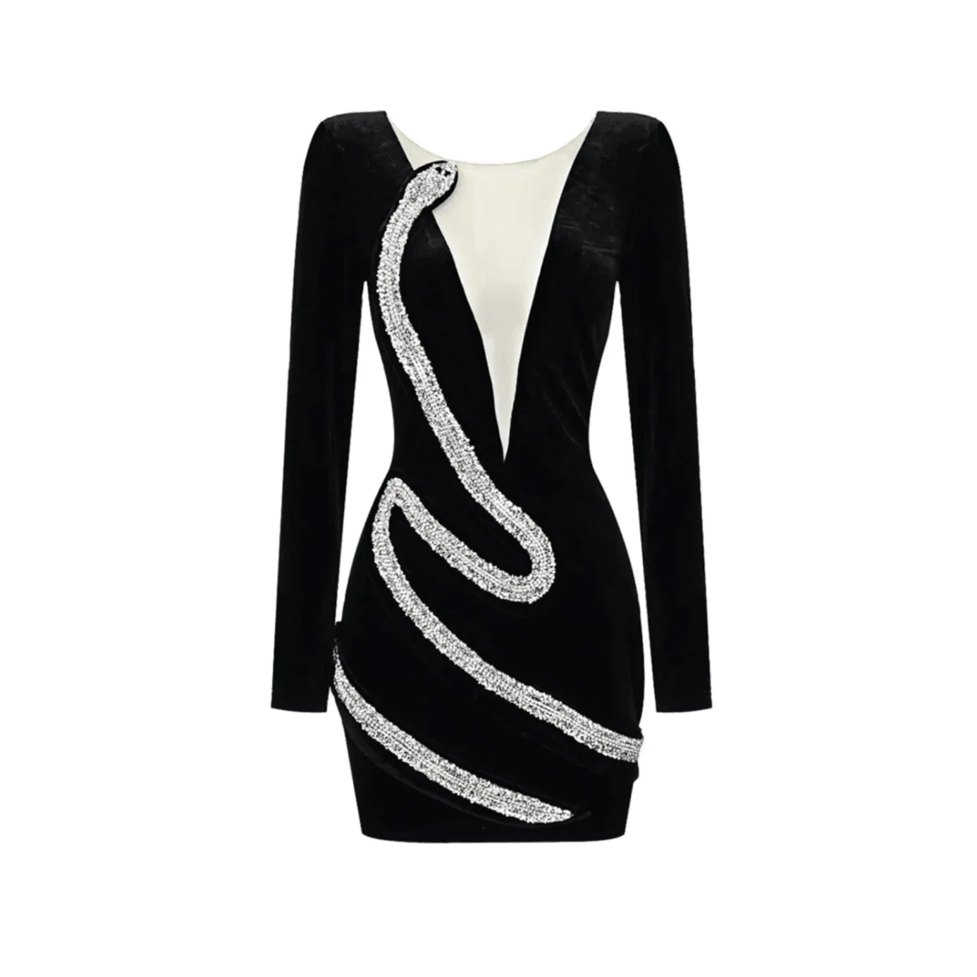 Elevate your style with our Velvet Diamond Snake Mini Dress in black. This cocktail attire features stunning diamond snake embellishments on soft velvet, enhancing your elegance. The figure-hugging design accentuates your curves for a glamorous look while ensuring comfort and mobility. Perfect for special events, this dress ensures you steal the spotlight. Embrace sophistication and leave a lasting impression with this exquisite velvet mini dress. Enjoy stress-free sizing with our complimentary exchange policy. Follow us on Instagram @mermaid_way for more fashion inspiration.