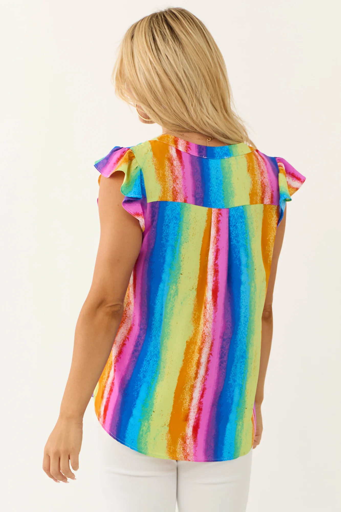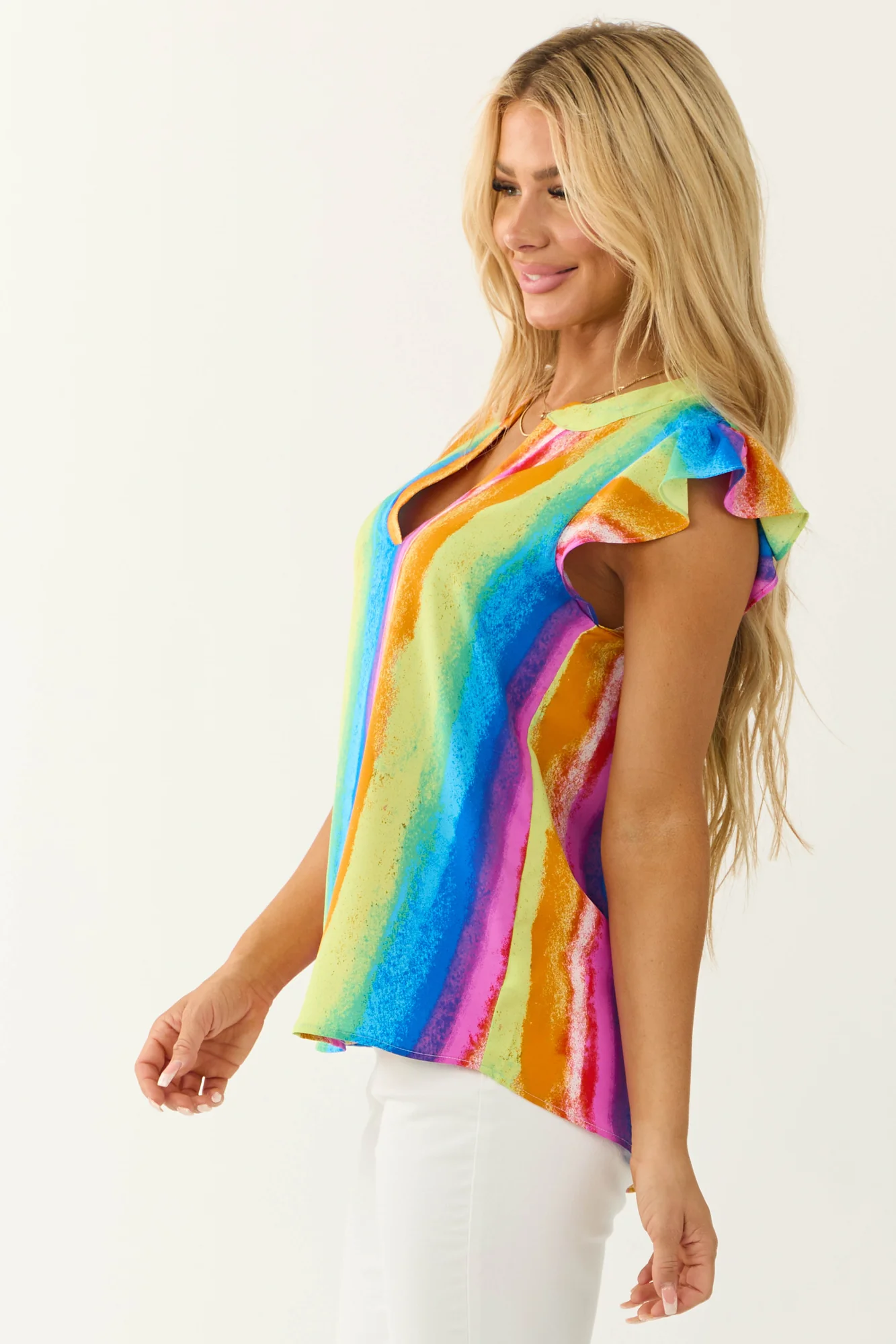 Elevate your style with our colorful V-notch neck ruffle sleeve top for women. This trendy top features a relaxed A-line fit and is made of non-stretchy woven fabric. The striking rainbow-inspired print in Tangerine, Lime, Jade, Sky Blue, Cobalt, Plum, Fuchsia, Cherry, and White hues adds a fun touch to your outfit. Perfect for daytime wear in spring and summer. Hand wash cold for best care. Please note that due to the unique fabric print, each piece may vary slightly in appearance. Model in image is wearing a size Small, with height 57″, bust 34″, and waist 26″.