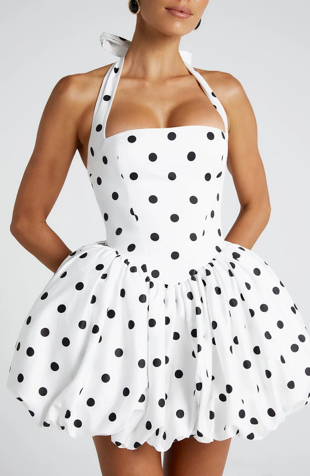 The Vintage Black Polka Dot Mini Dress is a timeless flirty piece perfect for any occasion. This dress features a square neckline with halter straps and a voluminous puffball skirt, combining vintage charm with a modern twist. The princess seams enhance the silhouette, while the shirred back panel and lace-up detail ensure a flattering fit. Made of non-stretch cotton, nylon, and elastane voile, this mini length dress is fully lined with an invisible zipper closure. Embrace classic elegance with a touch of modern flair in this stunning Black Polka Dot Mini Dress.