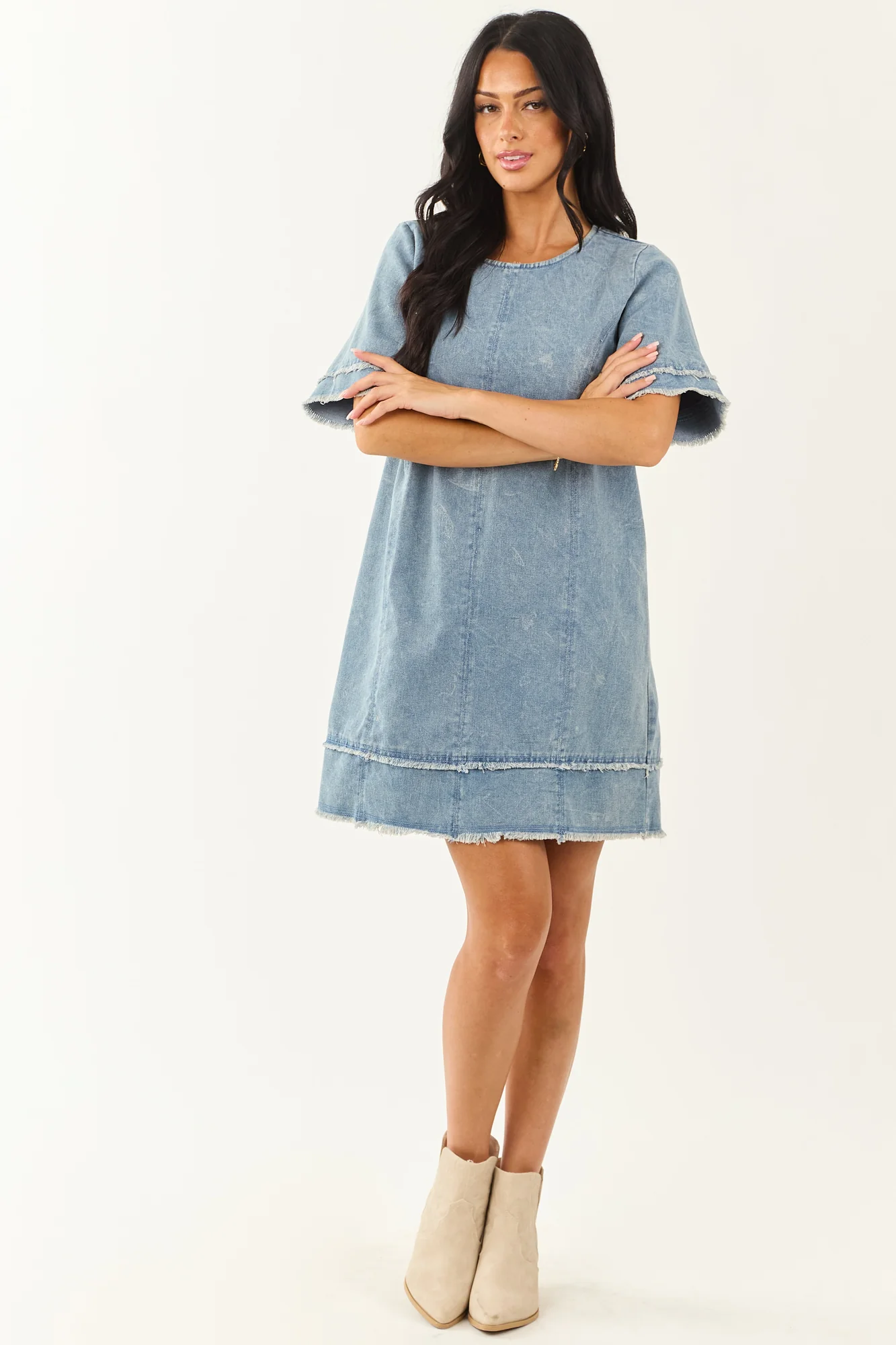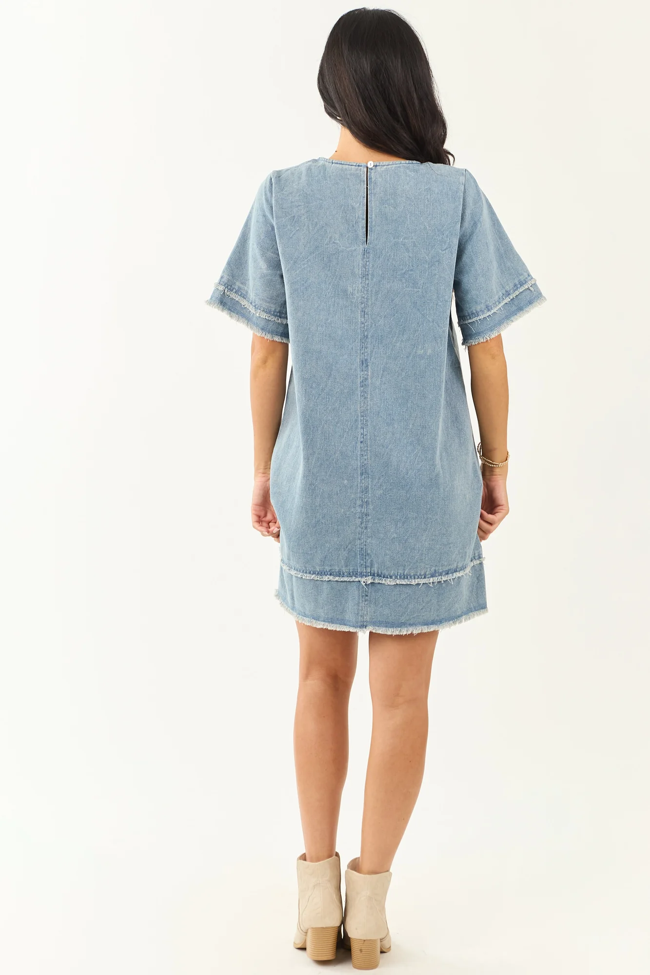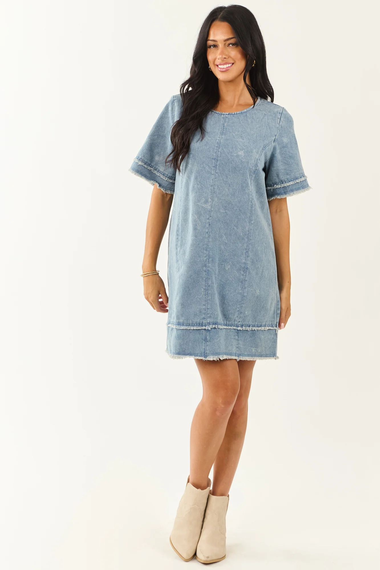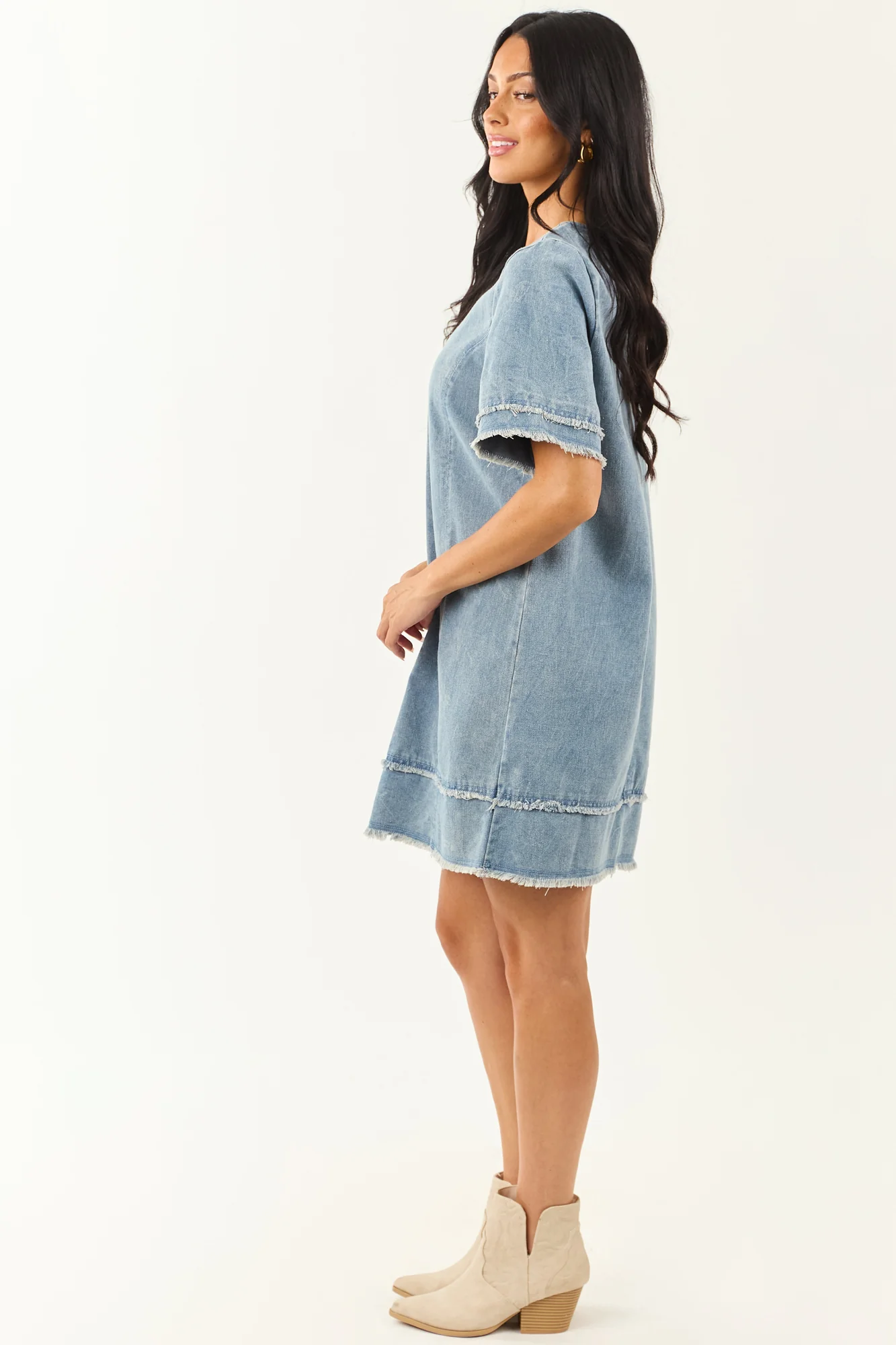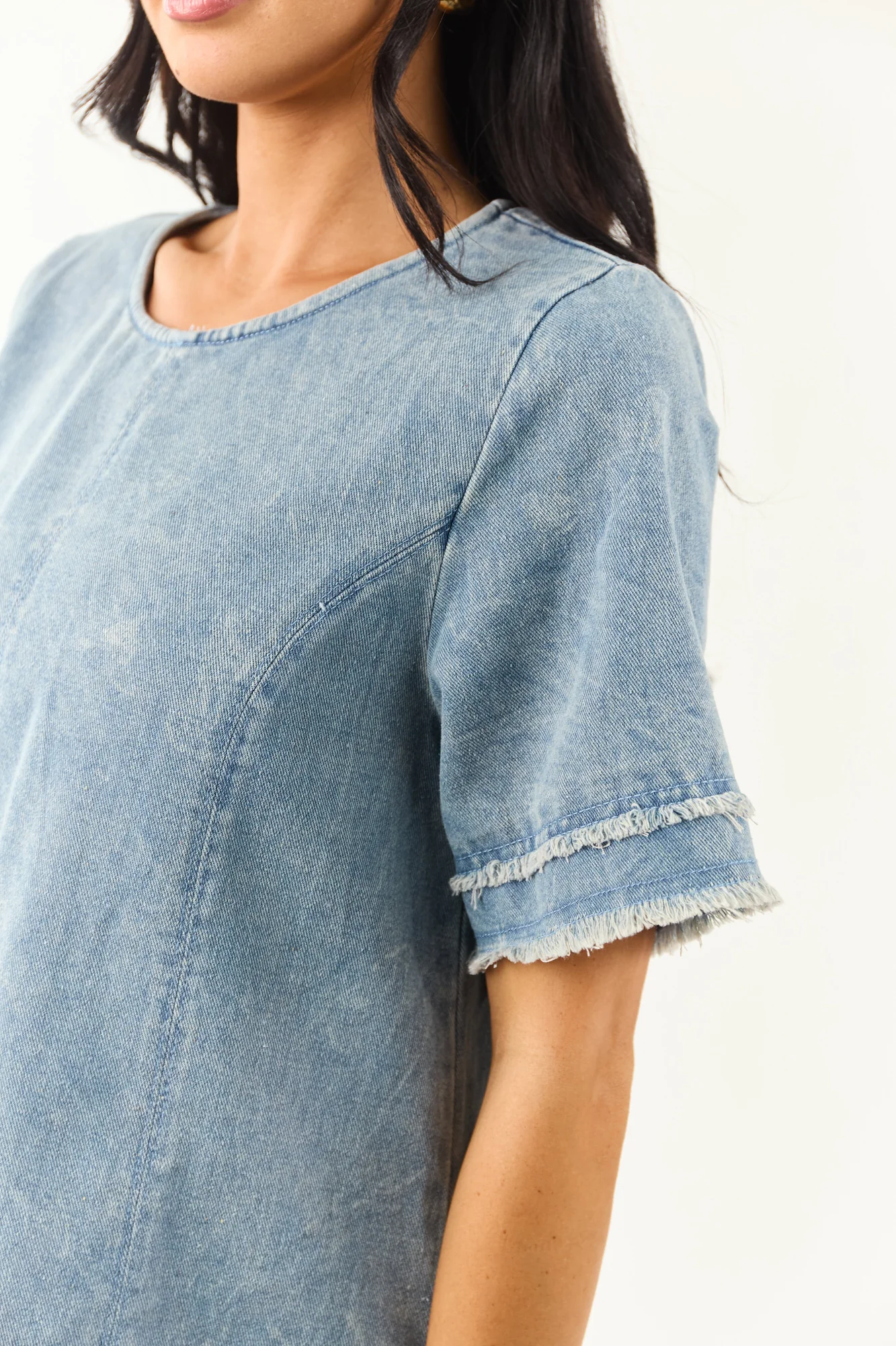 Embrace casual elegance with our vintage denim shift mini dress featuring frayed trim for a lived-in look. This dress boasts a relaxed fit, back keyhole closure, and is unlined for comfort. Crafted from 65% Cotton and 35% Polyester blend. Stay fashionable with this must-have wardrobe piece. Size Chart: XS – XL. Bust: 31-40″, Waist: 23-32″. Model is 59″ and wearing a size Small. Feel trendy and comfortable in this stylish denim dress.