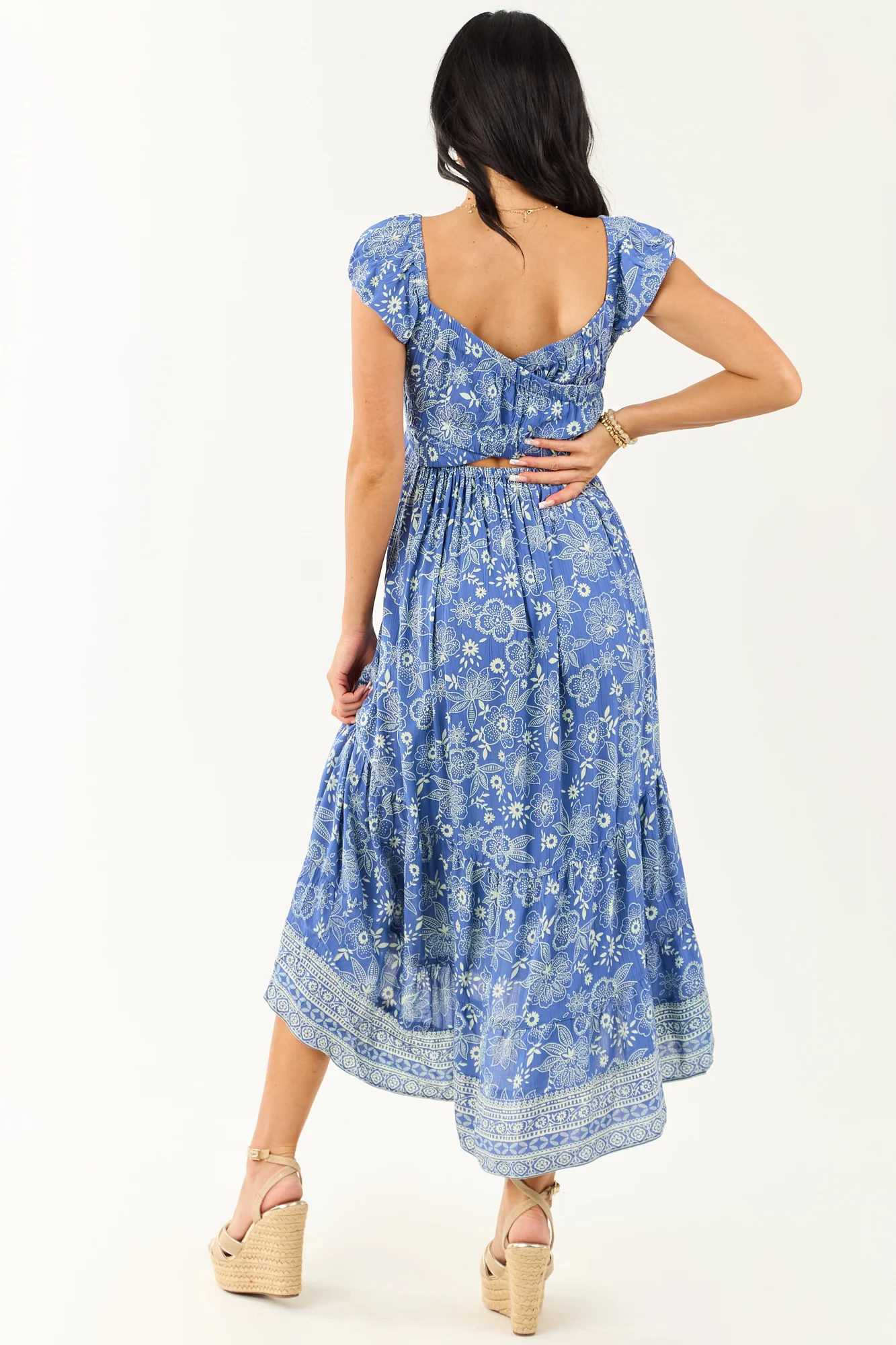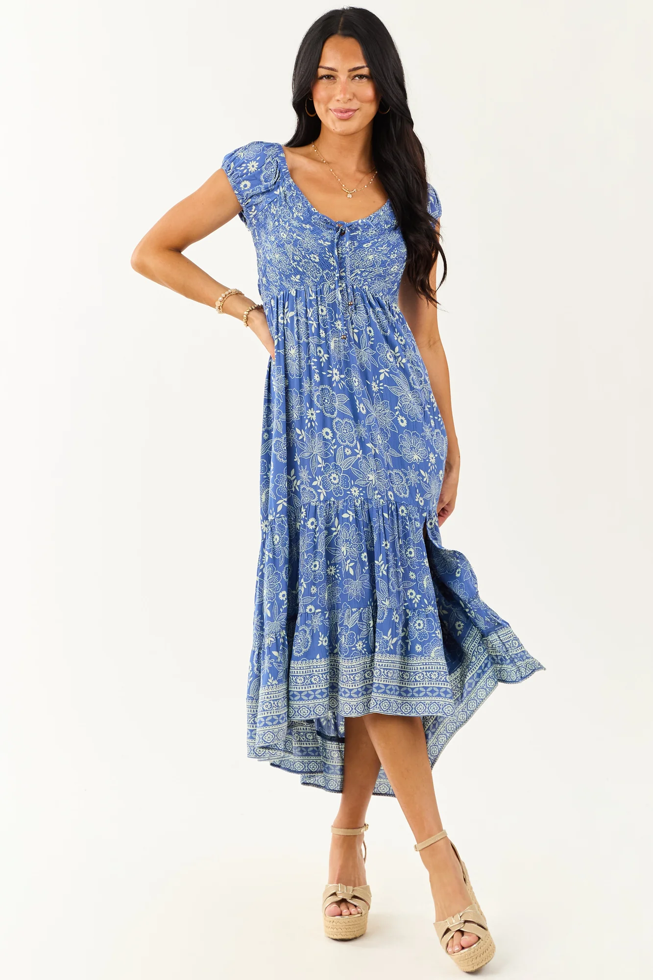 Elevate your style with this vintage-inspired Dusty Blue Midi Dress . Designed with a smocked bust for a comfortable fit, elasticized back details, cut-out back, and a cinching tie front. Perfect for day-to-night wear, the high-low hemline adds a modern touch. This dress is unlined, made of 100% Rayon, and features a flattering silhouette. Step out in elegance and charm with this timeless piece. Available in sizes XS to XL.