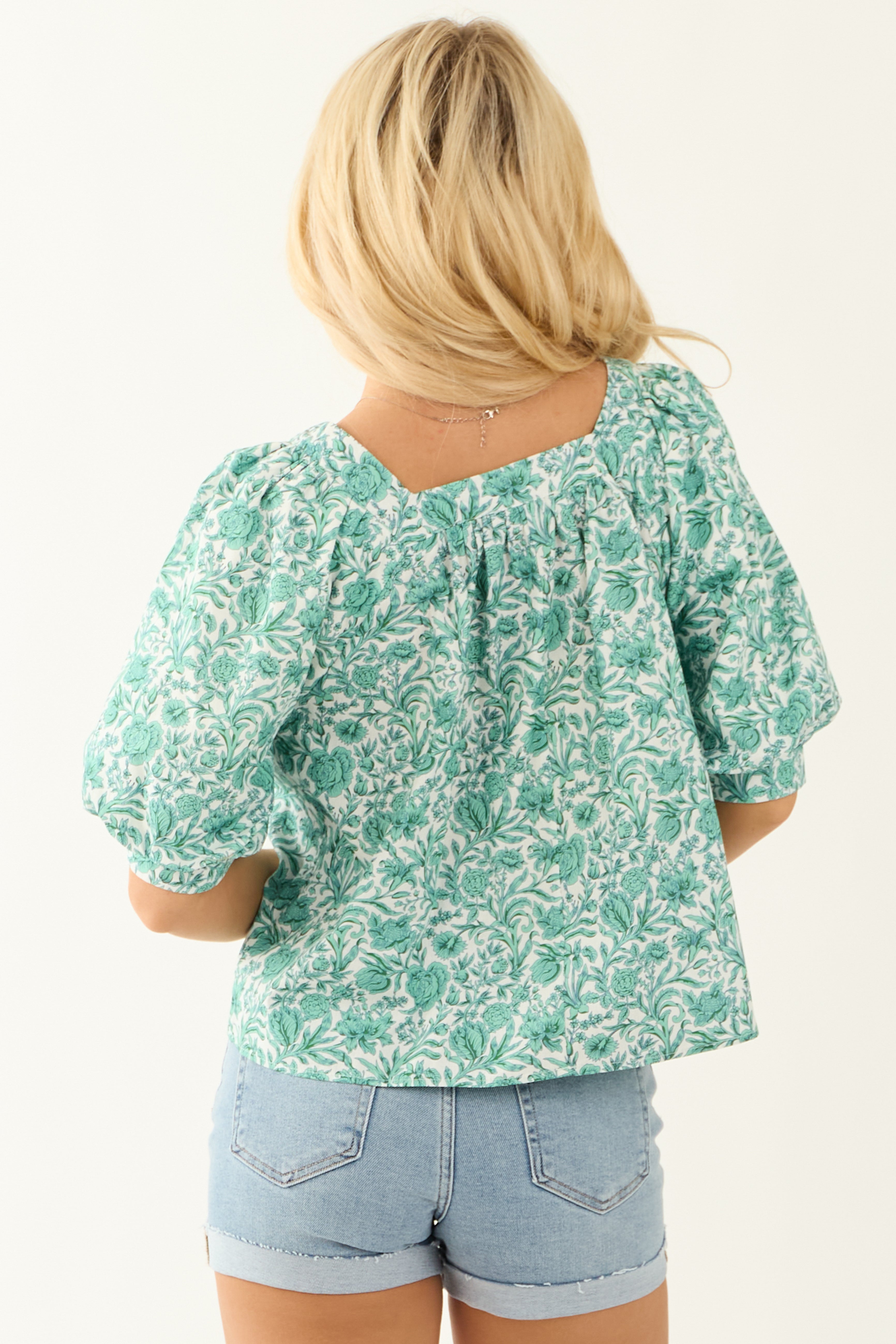 Step into Spring confidently with our stylish Jungle Green Floral Print Blouse. This classic yet trendy top features a relaxed boxy fit, ruched square neckline, stiff Raglan sleeves, and banded cuffs for a polished look. Made of 100% cotton with polyester lining, this blouse in shades of Jungle Green, Jade, and White is a must-have for the season. Hand wash cold for best care. Model is wearing size Small.