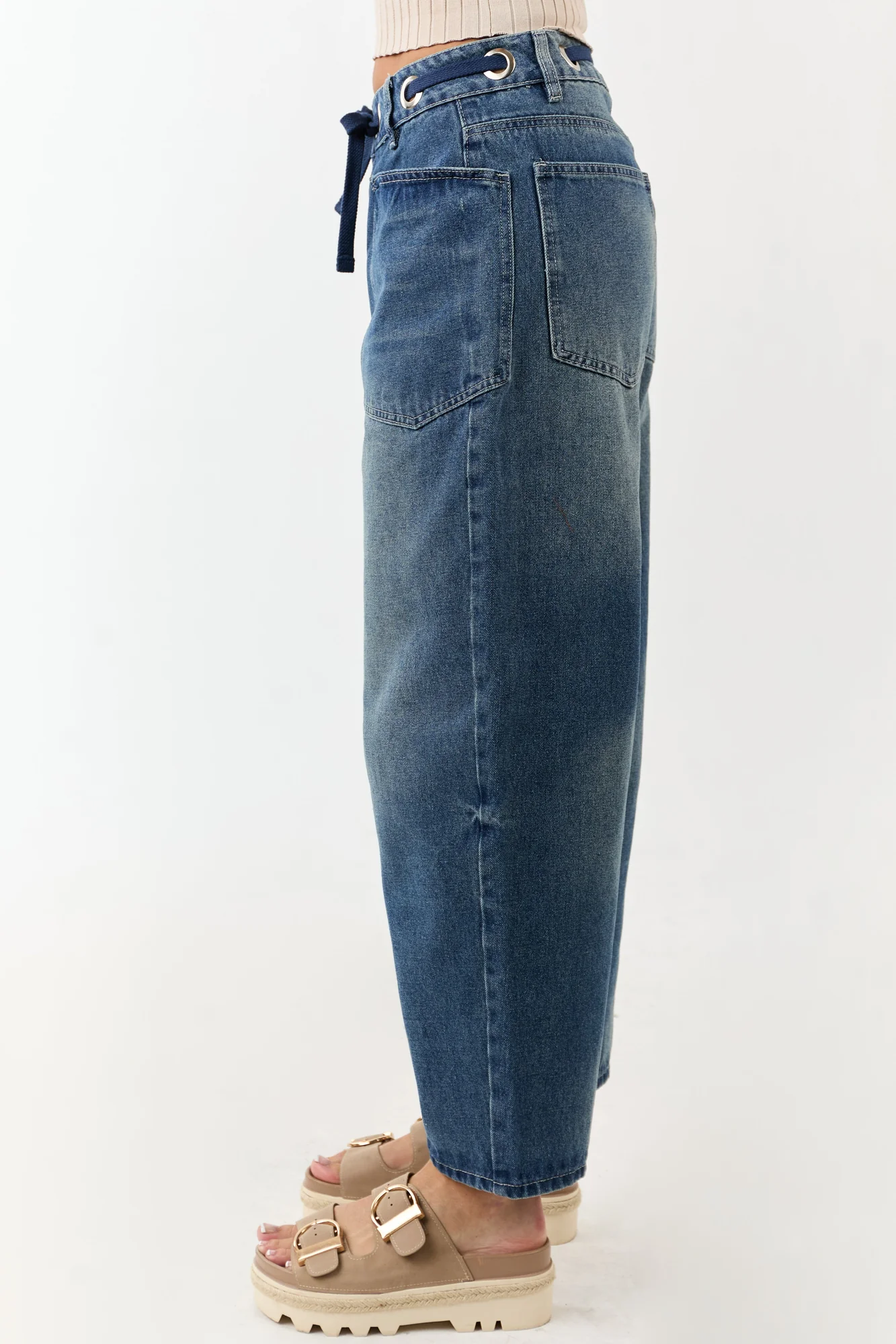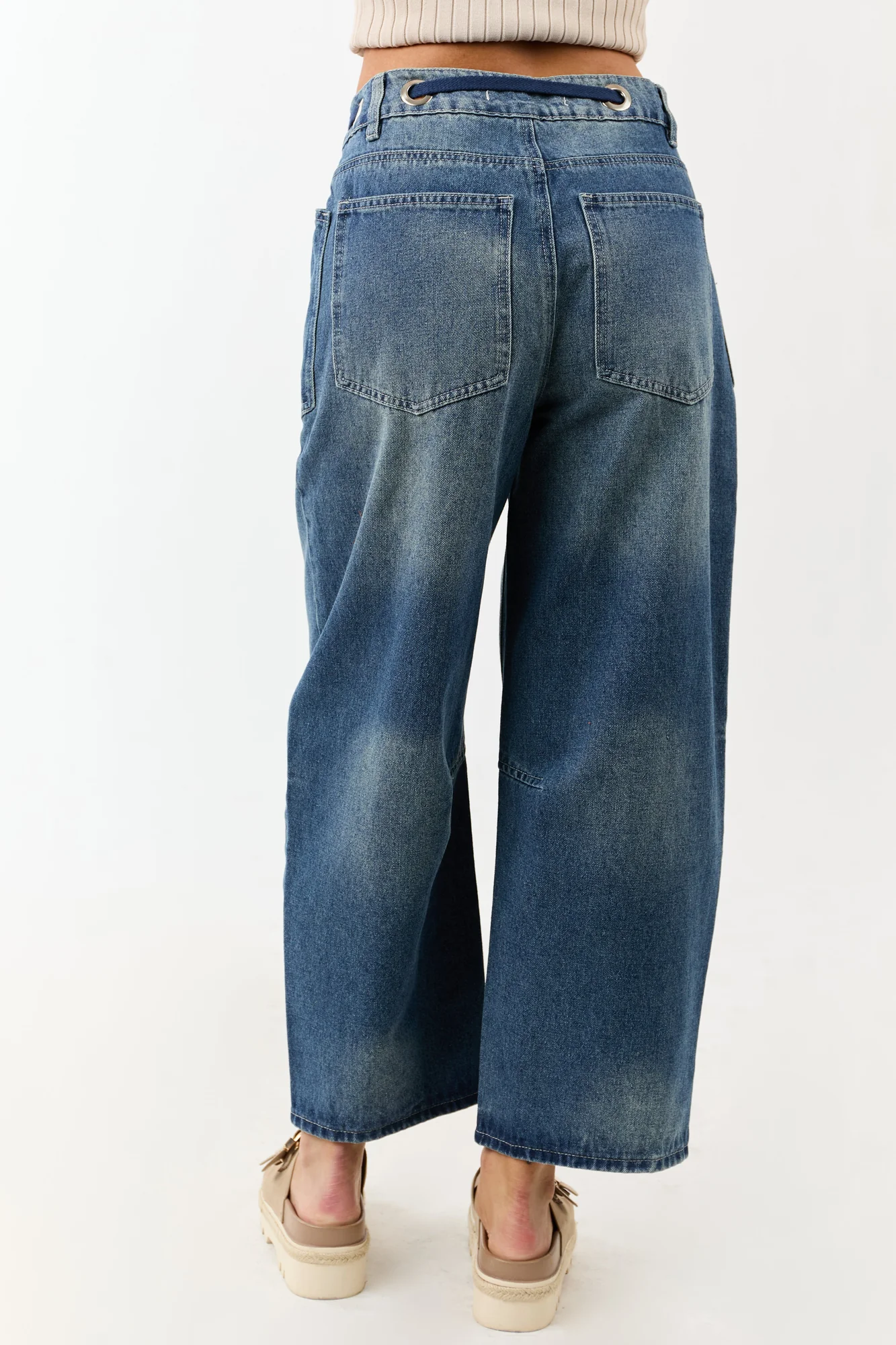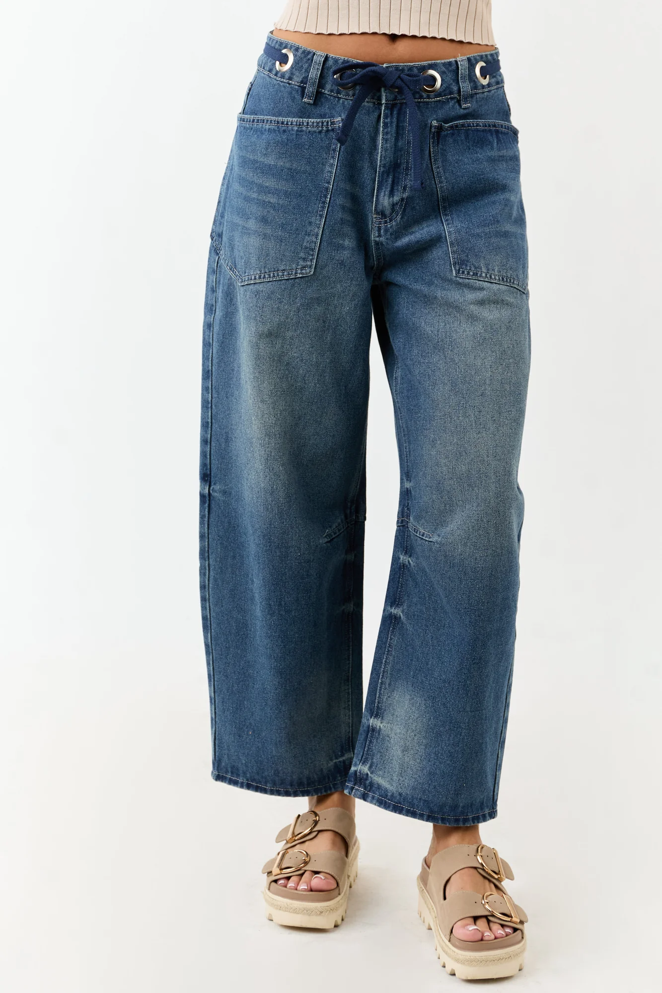 Discover ultimate comfort and style with our Vintage High Rise Drawstring Barrel Jeans. Crafted from non-stretchy denim, these jeans feature a relaxed barrel fit, high rise design, and adjustable grommet drawstring waistband for a personalized fit. With a zipper fly, button closure, and roomy patch pockets, these ankle-length jeans exude timeless charm. Made of 75% Cotton and 25% Polyester for lasting quality. Dress up or down effortlessly. Model is wearing size 28, adding both height and comfort to your wardrobe musts.