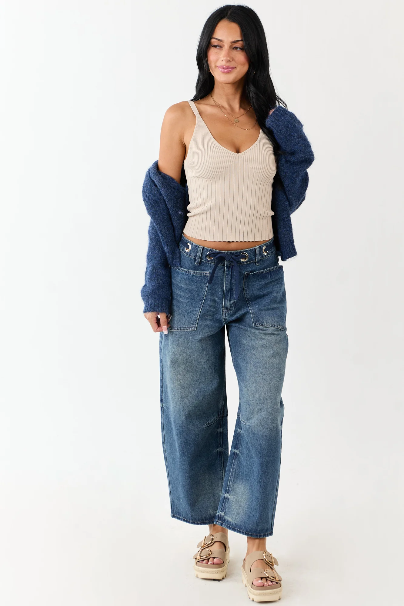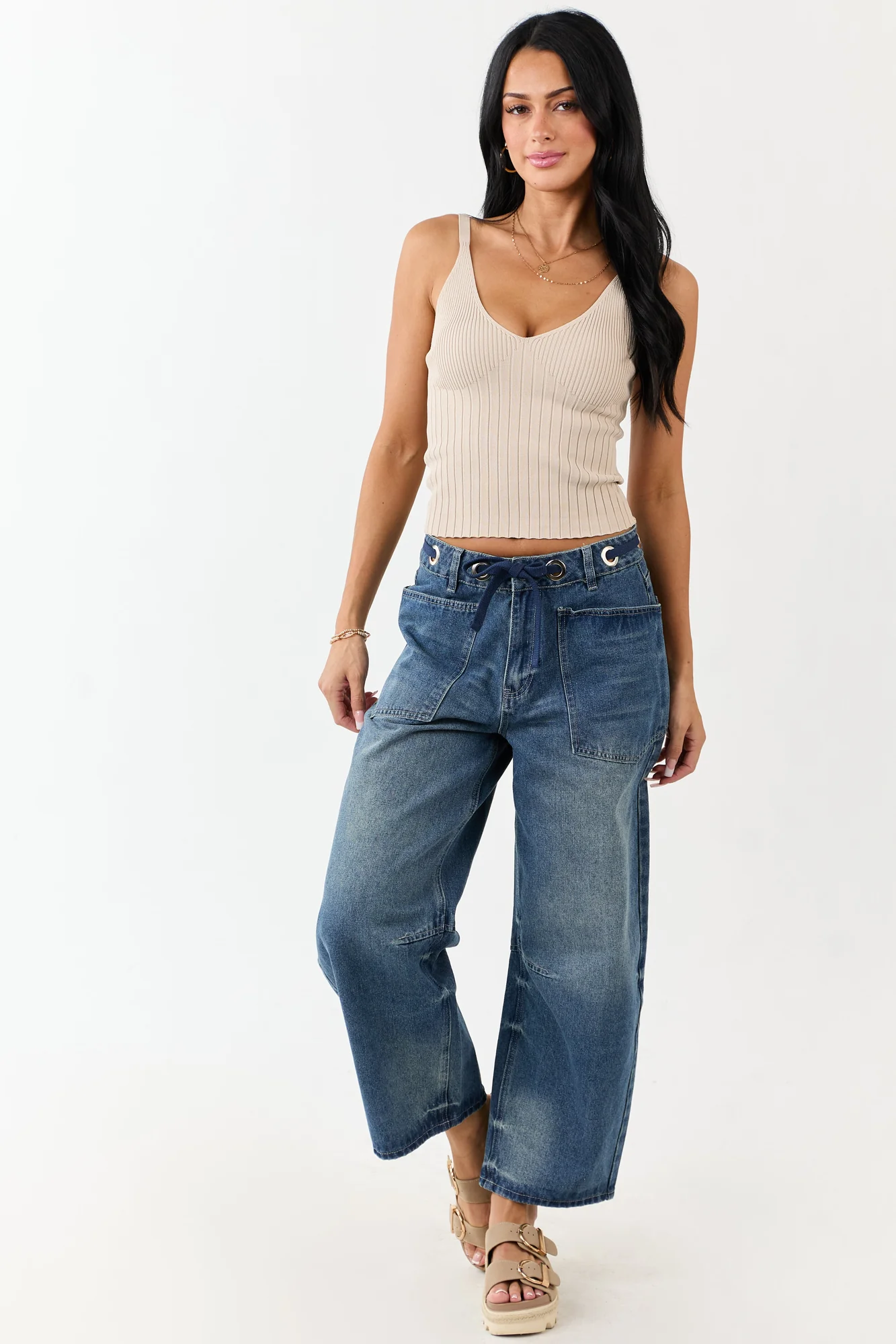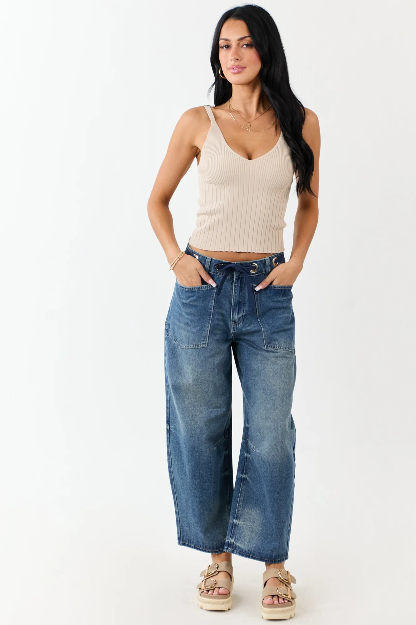 Discover ultimate comfort and style with our Vintage High Rise Drawstring Barrel Jeans. Crafted from non-stretchy denim, these jeans feature a relaxed barrel fit, high rise design, and adjustable grommet drawstring waistband for a personalized fit. With a zipper fly, button closure, and roomy patch pockets, these ankle-length jeans exude timeless charm. Made of 75% Cotton and 25% Polyester for lasting quality. Dress up or down effortlessly. Model is wearing size 28, adding both height and comfort to your wardrobe musts.