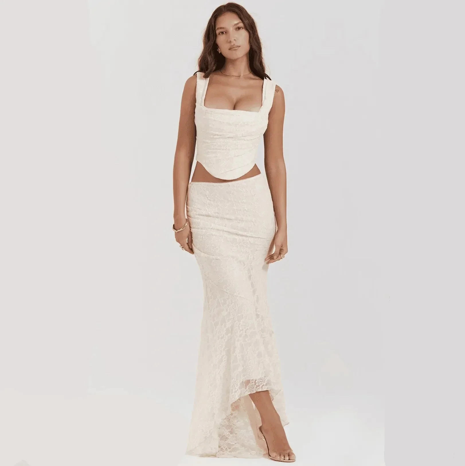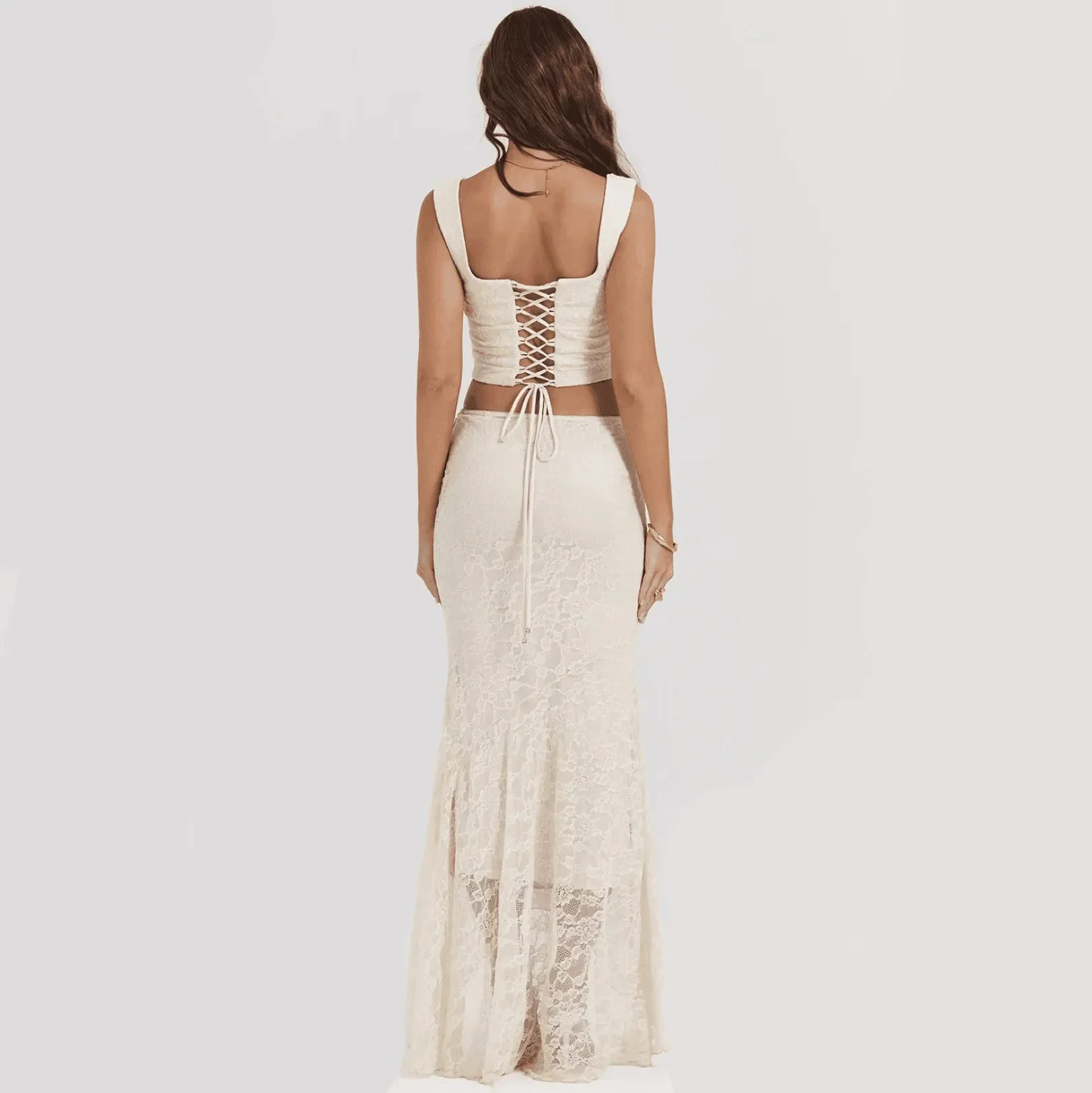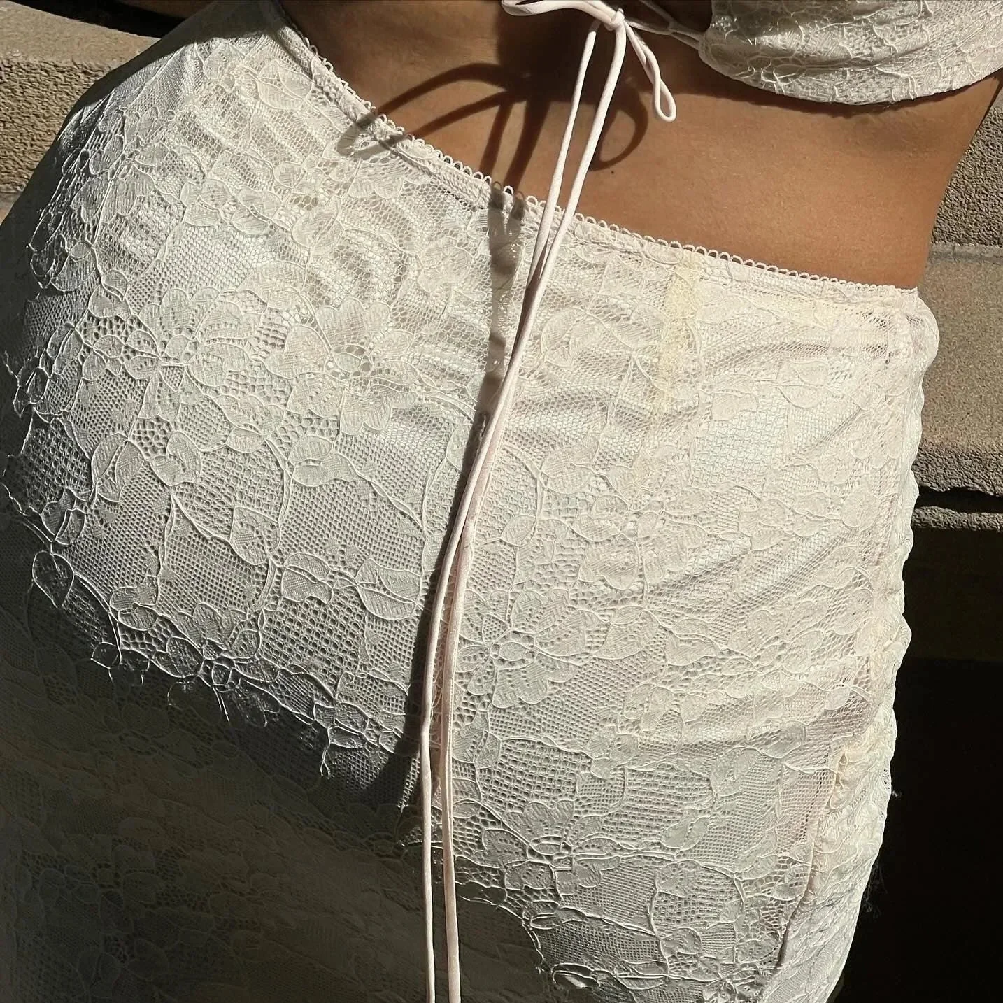 Indulge in elegance with our Ivory Lace Two Piece Set. This exquisite ensemble features a meticulously crafted lace crop top and a matching skirt, tailored for any special occasion. The intricacy of the lace overlay imbues a sense of romance in the top, while the skirt guarantees a snug, graceful fit for fluid movements. Combining style with comfort, the Lace Two Piece Set is your go-to choice for a night out or a fashionable gathering. Its enduring design exudes sophistication, ensuring you stand out with a touch of vintage charm. Elevate your style game and leave a lasting impression with this exquisite Lace Two Piece Set! Explore more trends on Instagram @mermaid_way. MATERIALS: Stretch Floral Lace, Stretch Woven If sizing is not ideal, we gladly provide a free exchange for another size.