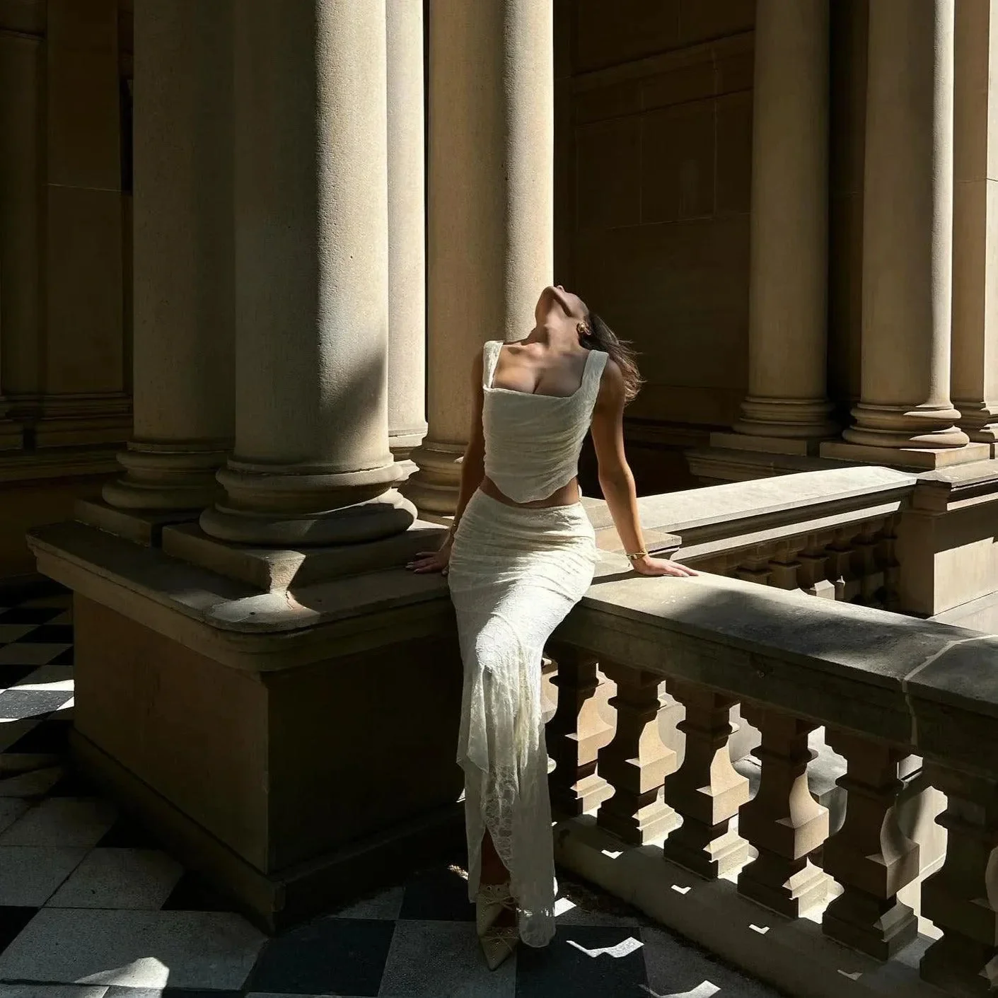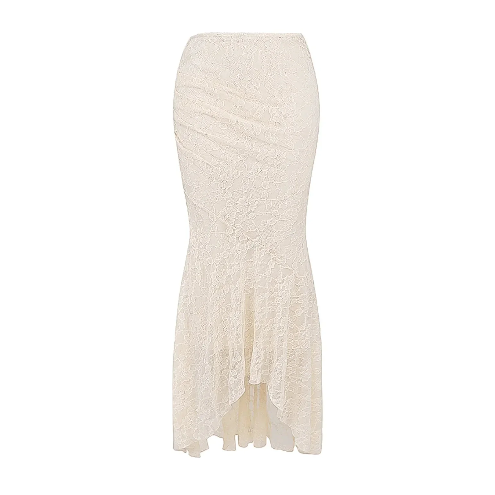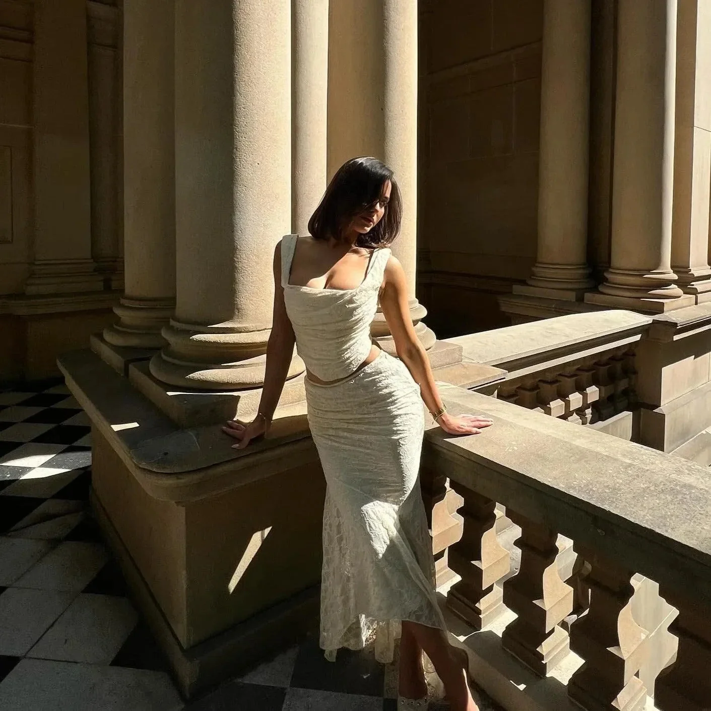 Indulge in elegance with our Ivory Lace Two Piece Set. This exquisite ensemble features a meticulously crafted lace crop top and a matching skirt, tailored for any special occasion. The intricacy of the lace overlay imbues a sense of romance in the top, while the skirt guarantees a snug, graceful fit for fluid movements. Combining style with comfort, the Lace Two Piece Set is your go-to choice for a night out or a fashionable gathering. Its enduring design exudes sophistication, ensuring you stand out with a touch of vintage charm. Elevate your style game and leave a lasting impression with this exquisite Lace Two Piece Set! Explore more trends on Instagram @mermaid_way. MATERIALS: Stretch Floral Lace, Stretch Woven If sizing is not ideal, we gladly provide a free exchange for another size.