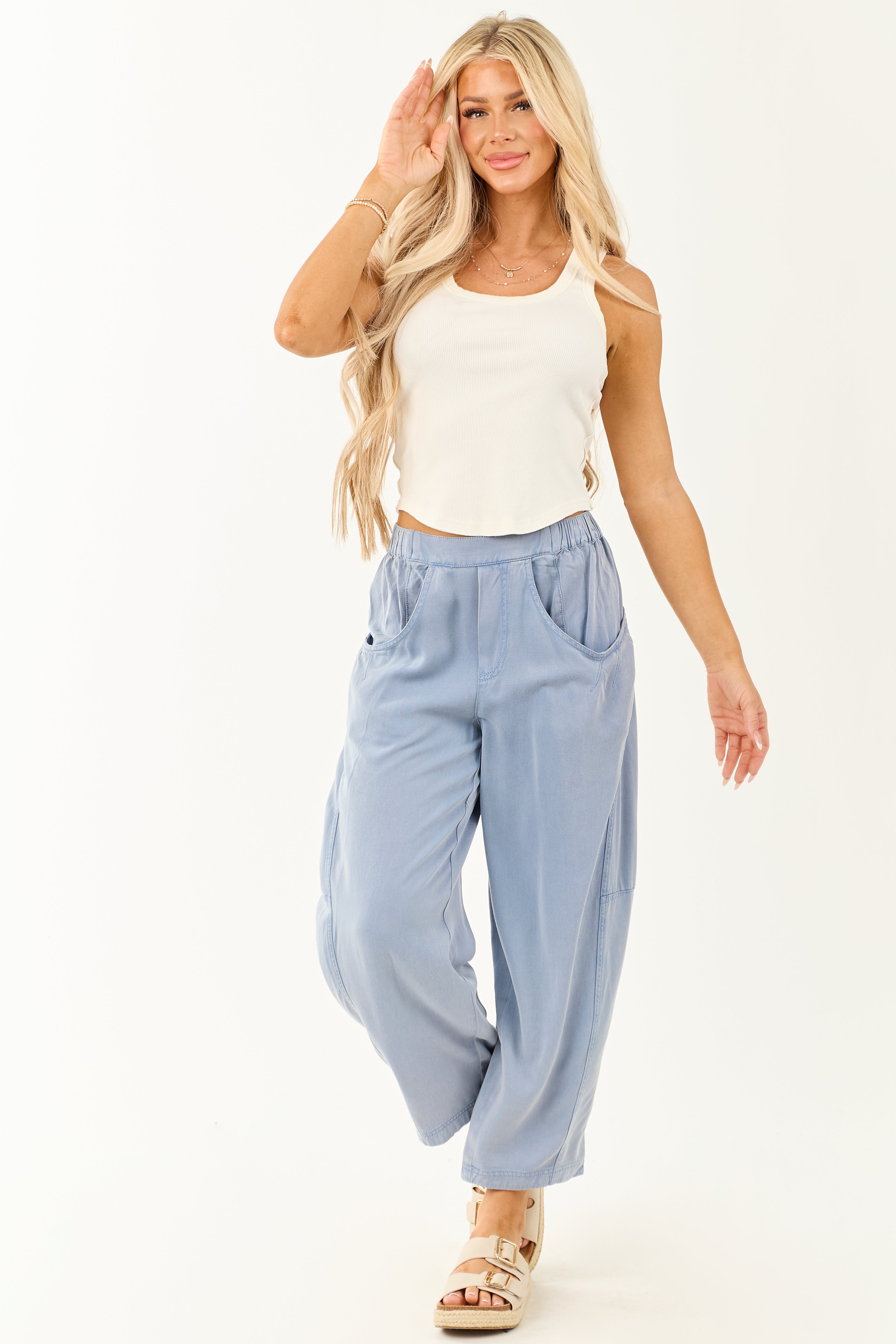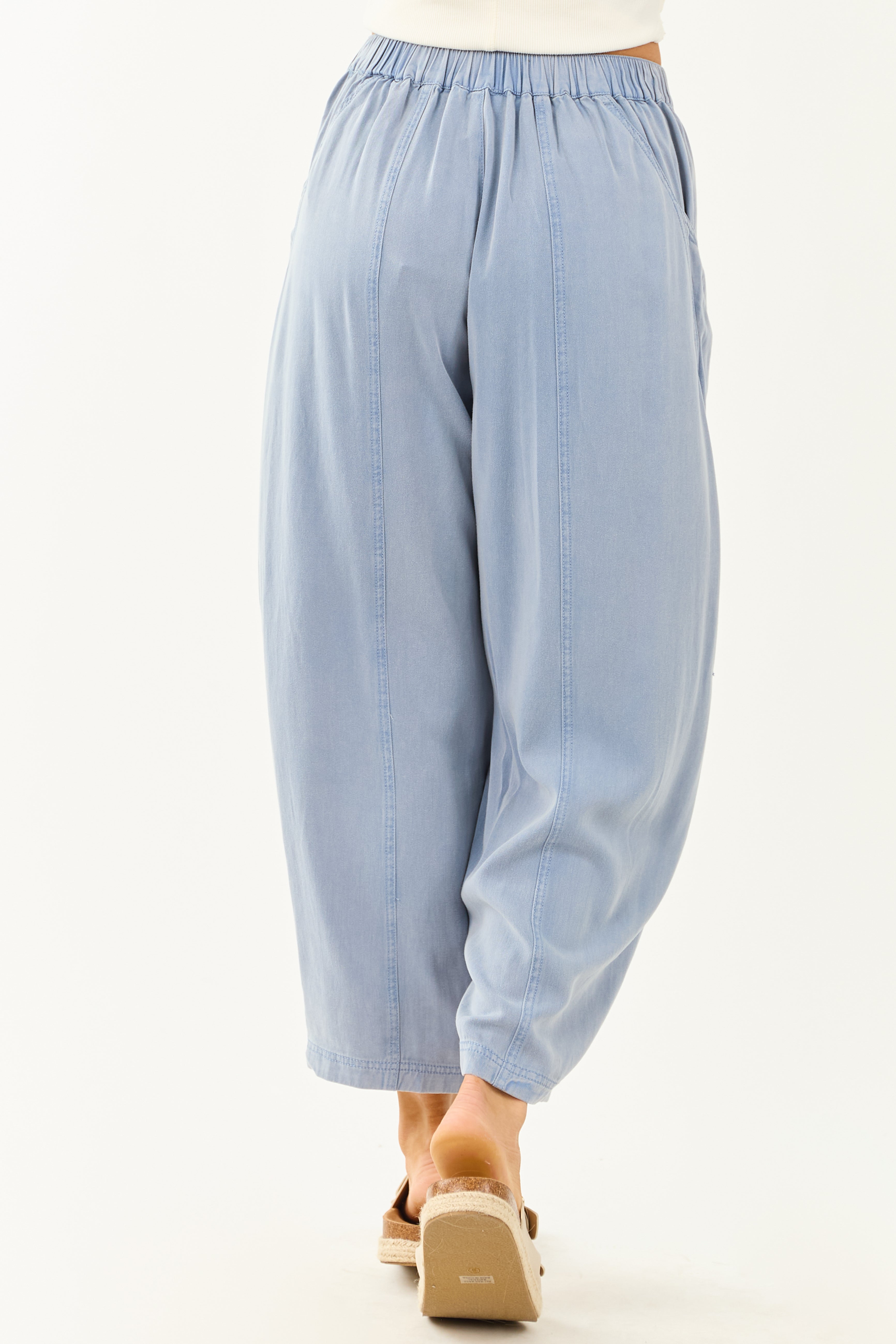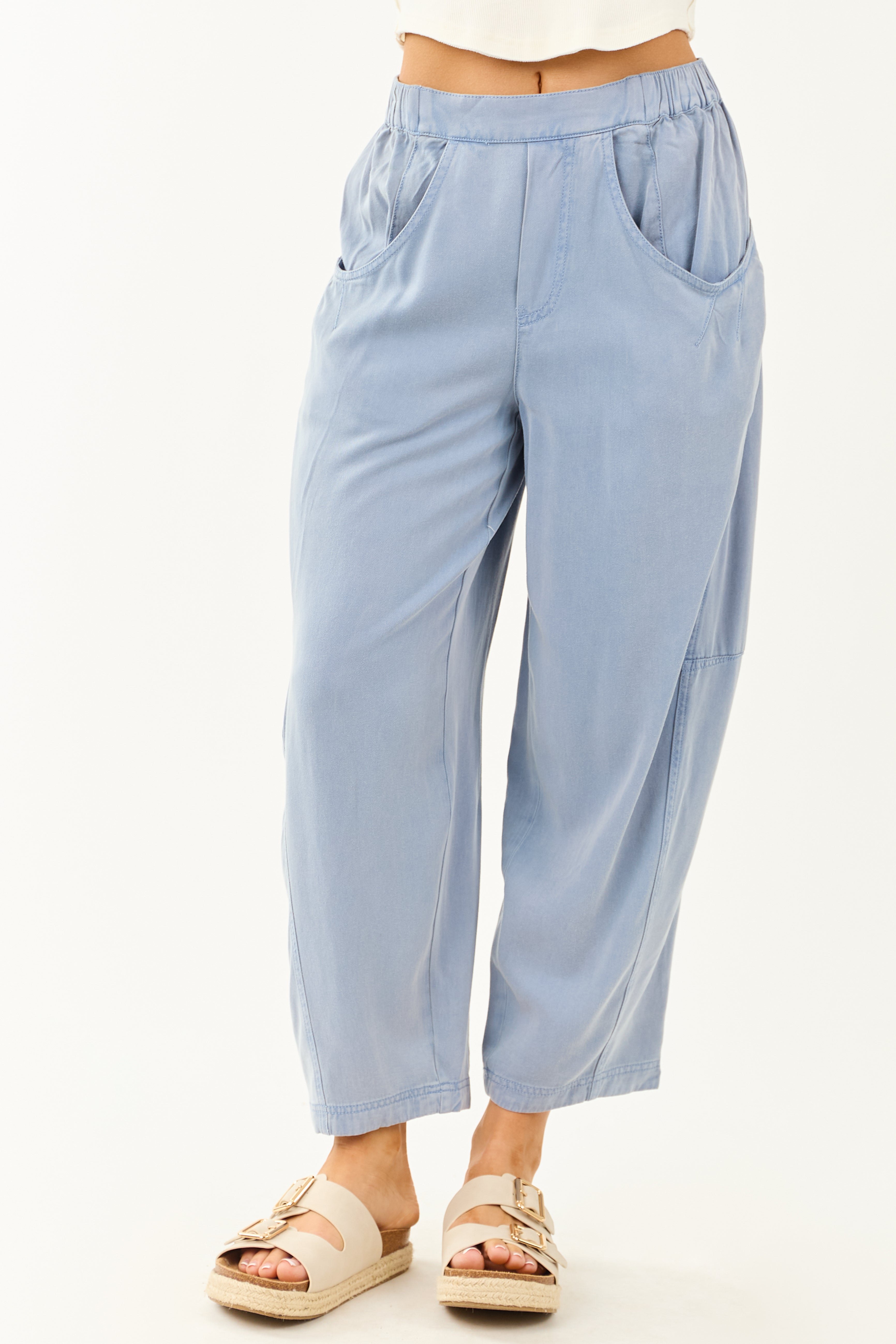 Experience ultimate comfort and style with our Vintage Wash Blue Lightweight Barrel Pants. Featuring a soft fabric with a laid-back vintage wash, these pants offer a relaxed fit in the waist and hips. Ideal for effortless style and lasting comfort, these pants come with a stretchy waist, cropped length, two functional front pockets, and are made of 70% Rayon and 30% Lyocell. Perfect for all-day wear, our pants are a go-to choice for any casual occasion. Hand wash cold, color separate, and line dry. Model is wearing size Small.