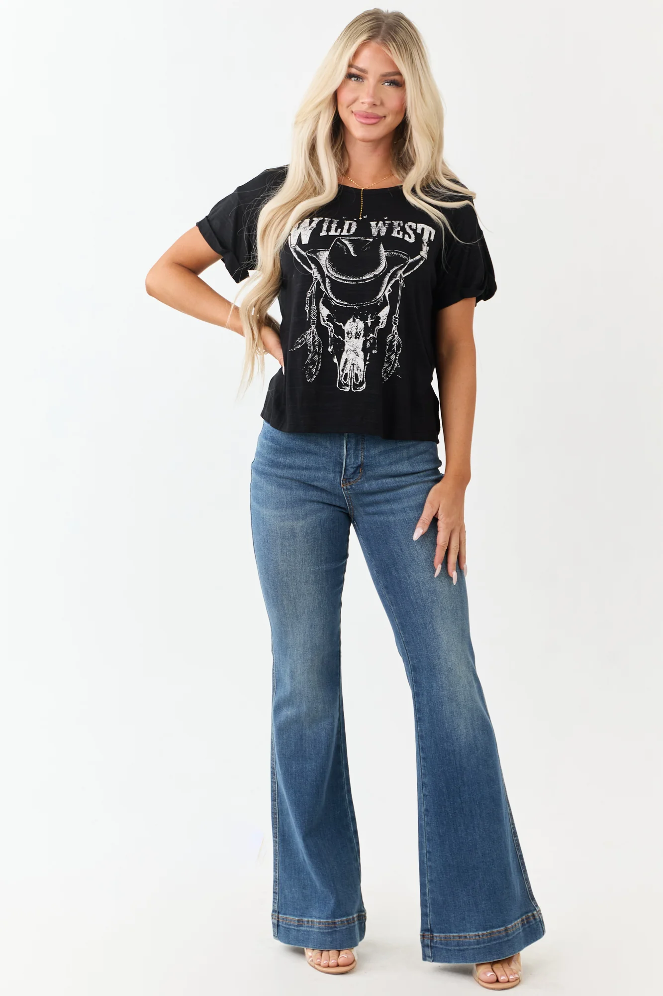 Channel vintage western vibes with ourWild Westgraphic tee featuring a relaxed boxy fit. Crafted from soft 100% cotton knit material, this top is stretchy, slightly sheer, and detailed with sewn cuffs. Made in the USA. Perfect for adding a touch of nostalgia to your wardrobe. Available in sizes S, M, and L.