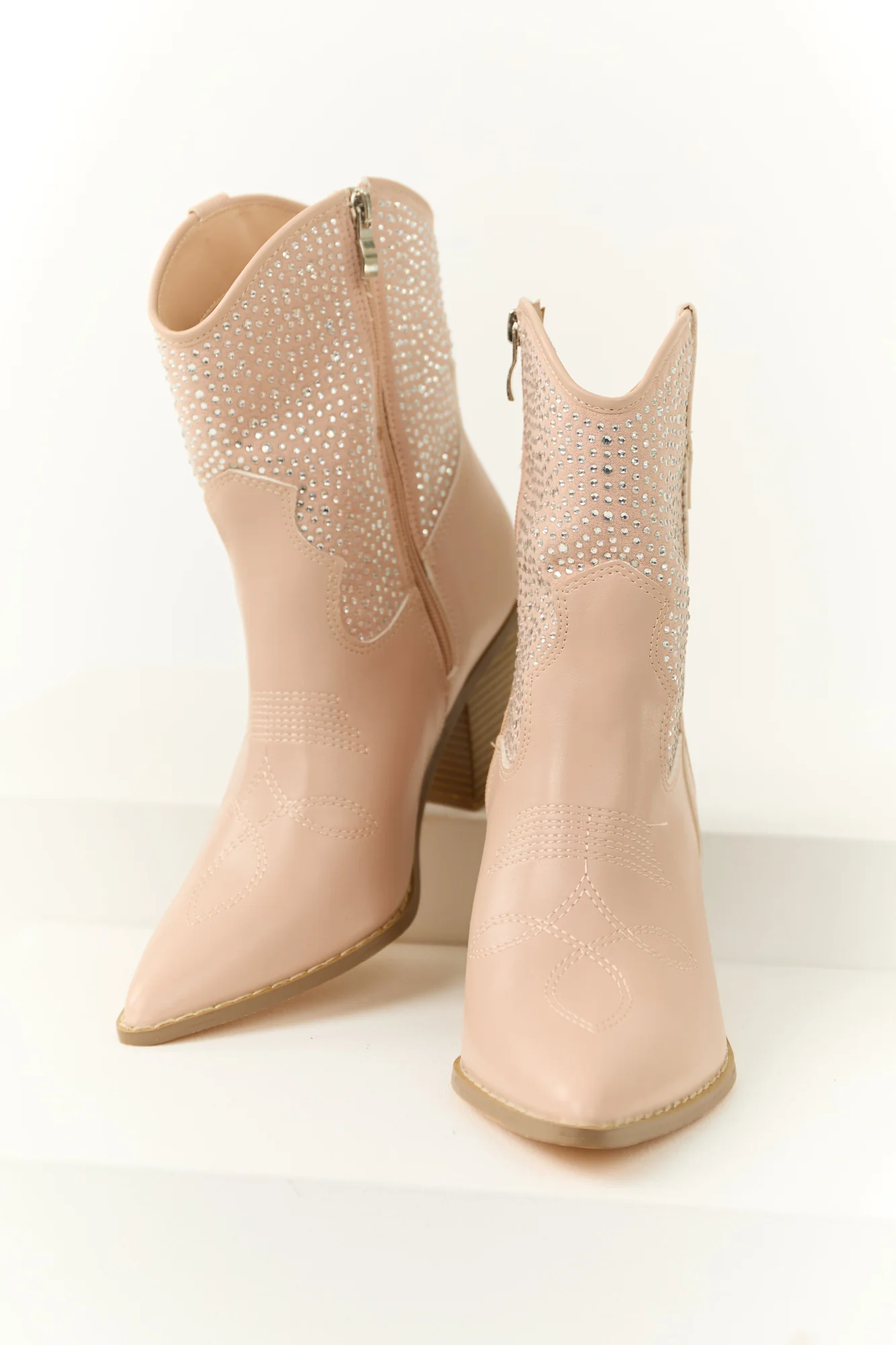 Step out in style with these faux leather Western-inspired booties. Designed with a pointed toe, stacked block heel, and zippered side for easy wear. Featuring rhinestone embellishments throughout for a touch of glam. The lightly cushioned insole ensures all-day comfort. Shaft measures 8.5″ with a circumference of 12.5″ and a 3.25″ heel height. Imported. Available in various sizes.