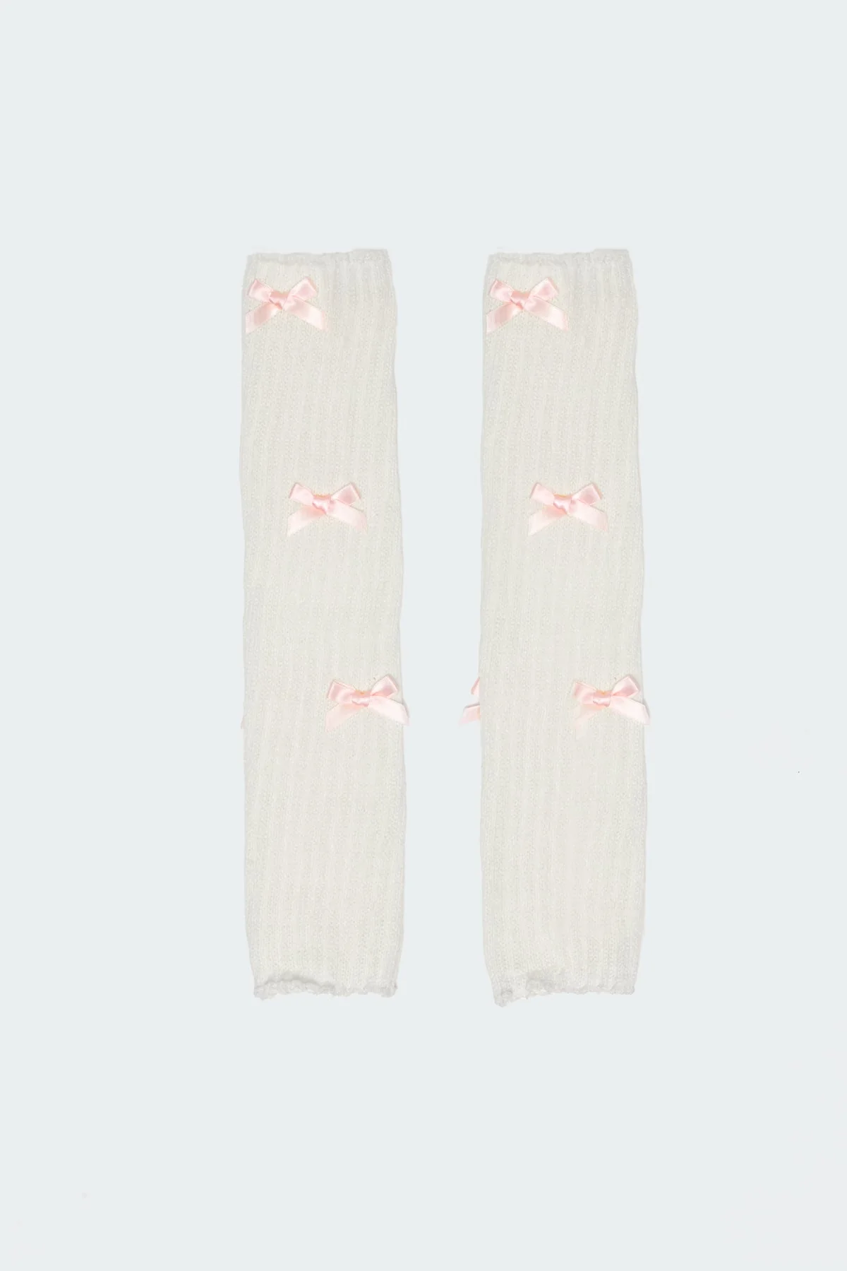 Stay cozy and stylish with our white and pink knit leg warmers featuring elegant satin bow detailing. Made of cotton and spandex blend for ultimate comfort. Measurements (In): Length 15.9. Care instructions: Wash with similar colors. Add a touch of flair to your outfit with these fashionable leg warmers.
