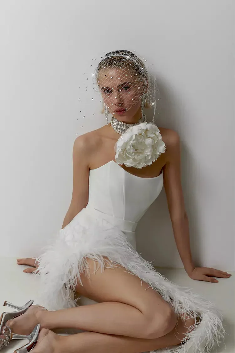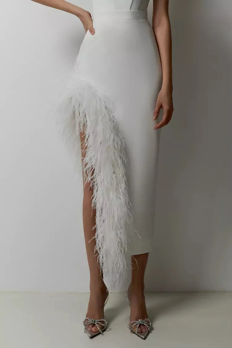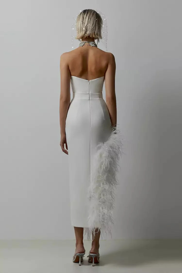Step out in style with our exquisite White Bandage Feather Strapless Dress by Night Novas. Made from high-stretch bandage fabric (95% Polyester, 5% Spandex), this dress boasts an alluring asymmetric hem and a striking feather trim that adds a touch of elegance. The invisible zipper at the back ensures a seamless fit. Please be advised that the color may vary slightly due to lighting, and some feathers may shed. This statement piece is perfect for evenings out. Accessorize with your favorite heels for a complete look.