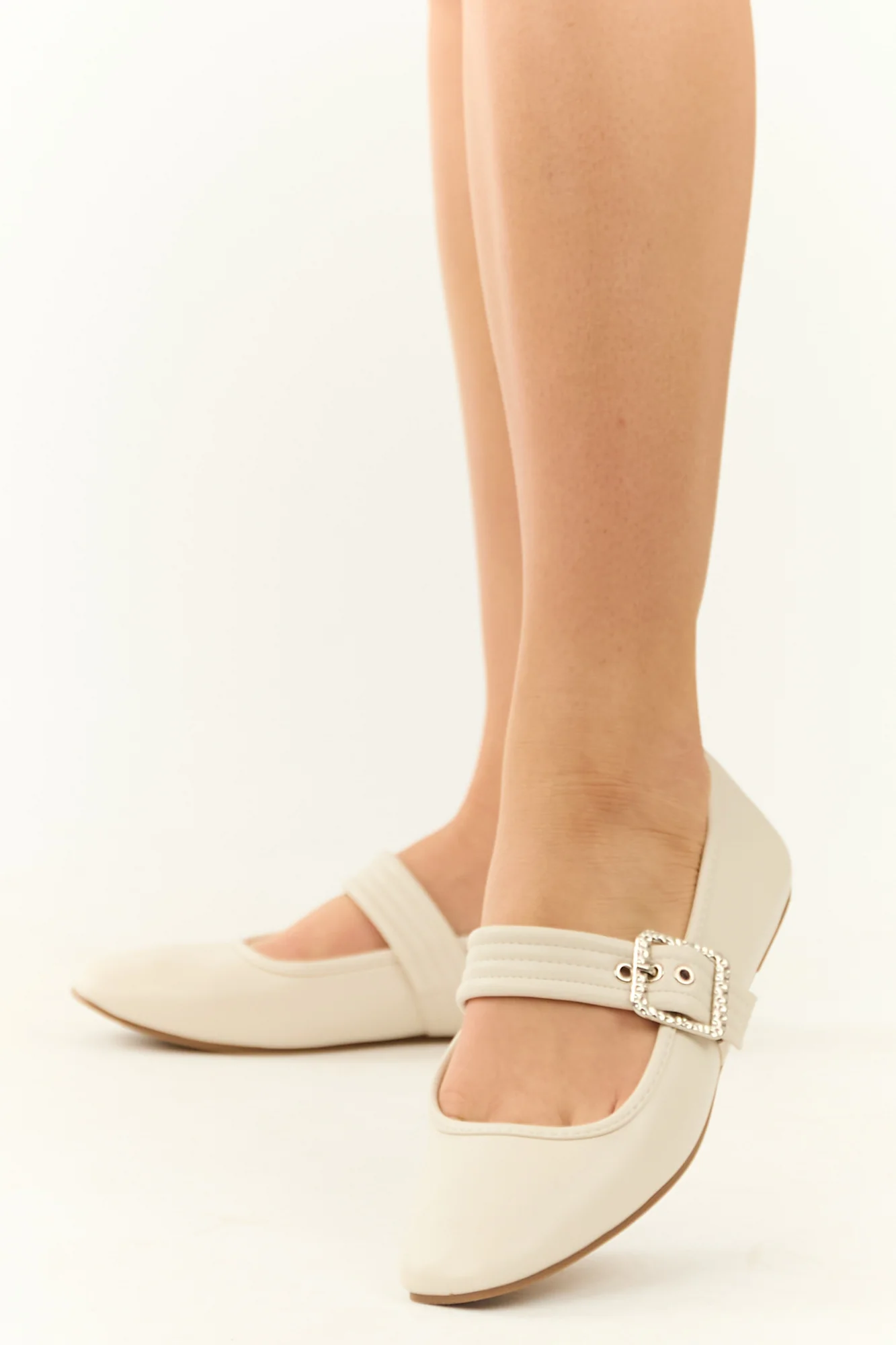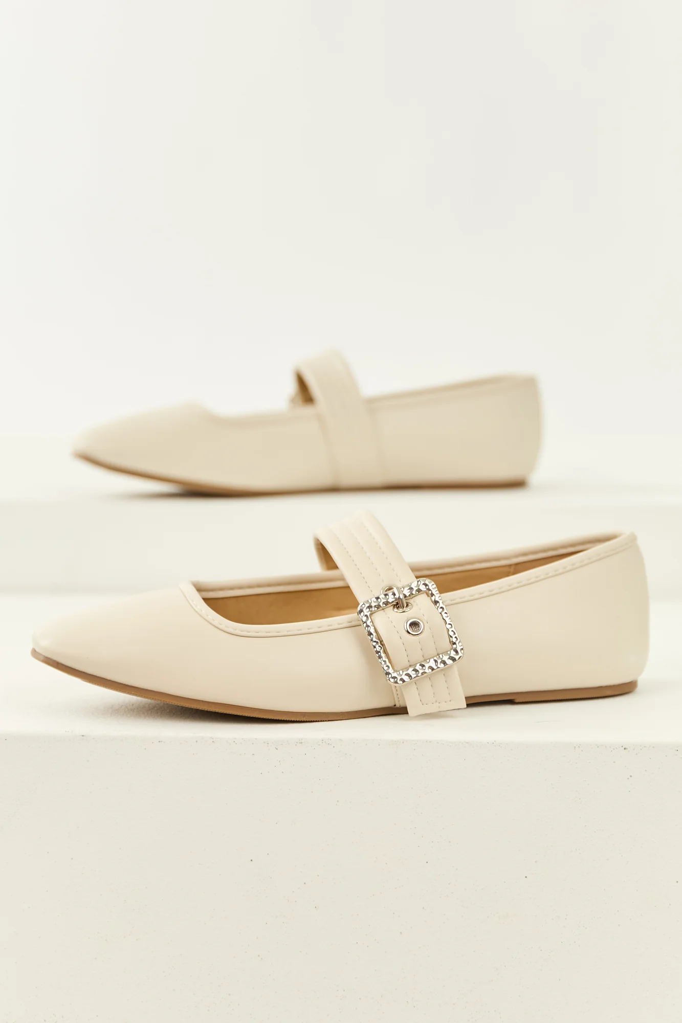 Step out in style with these elegant white patent leather flats featuring a silver buckle detail, slightly cushioned insole, and a comfortable heel height of 0.25 inches. The adjustable circumference strap adds a modern touch to these versatile shoes. Product measured on size 8 for the perfect fit and feel.