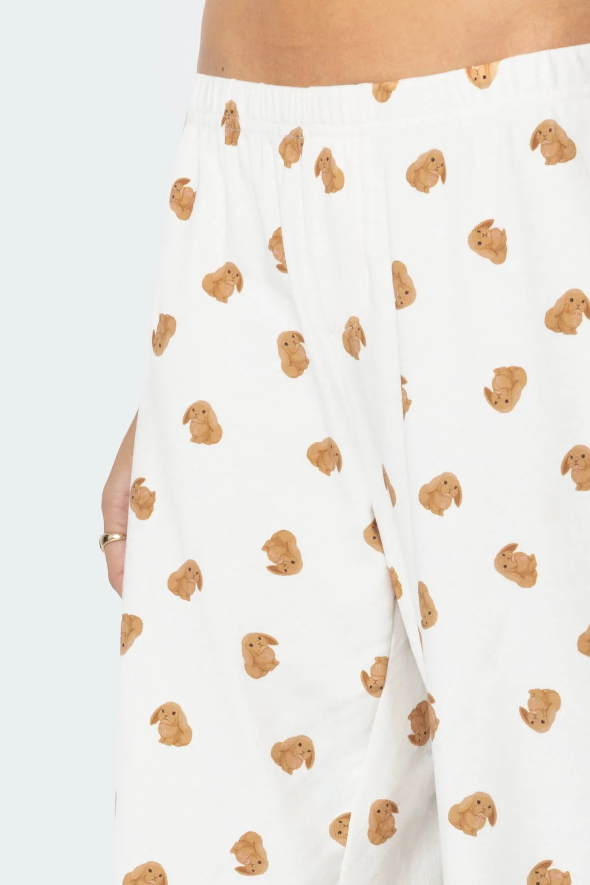 Indulge in comfort with our white bunny print sleep pants made of Cotton and Spandex. These stylish pants feature an elastic waistband for a snug fit. The cute bunny printed fabric adds a touch of fun to your loungewear collection. The model in the image is wearing size S with an inseam of 31.9 inches, pairing style with comfort. Care instructions: Machine wash at maximum 30ºC, tumble dry low, iron at a maximum of 110ºC. Enhance your bedtime routine with these cozy pants!