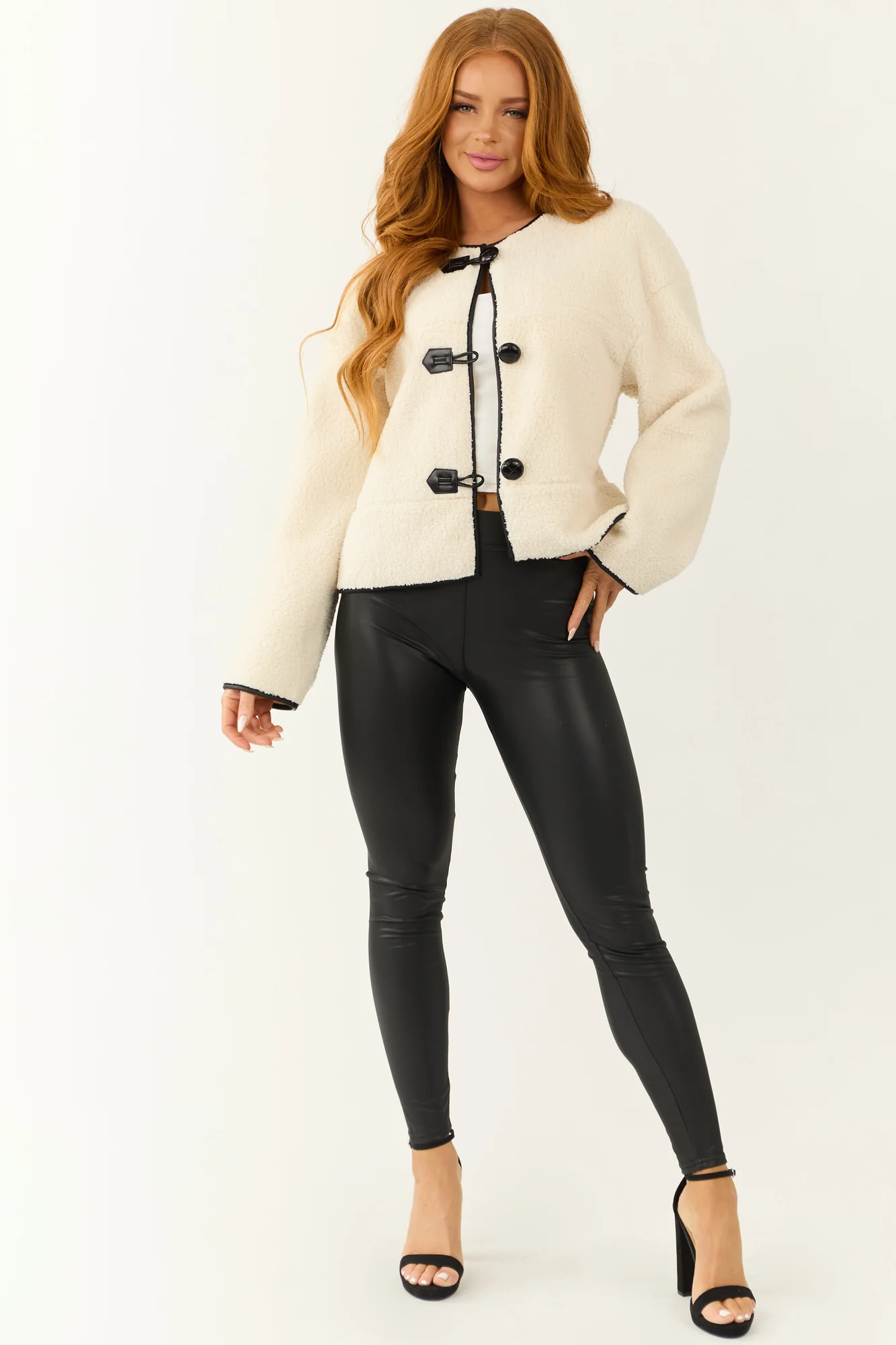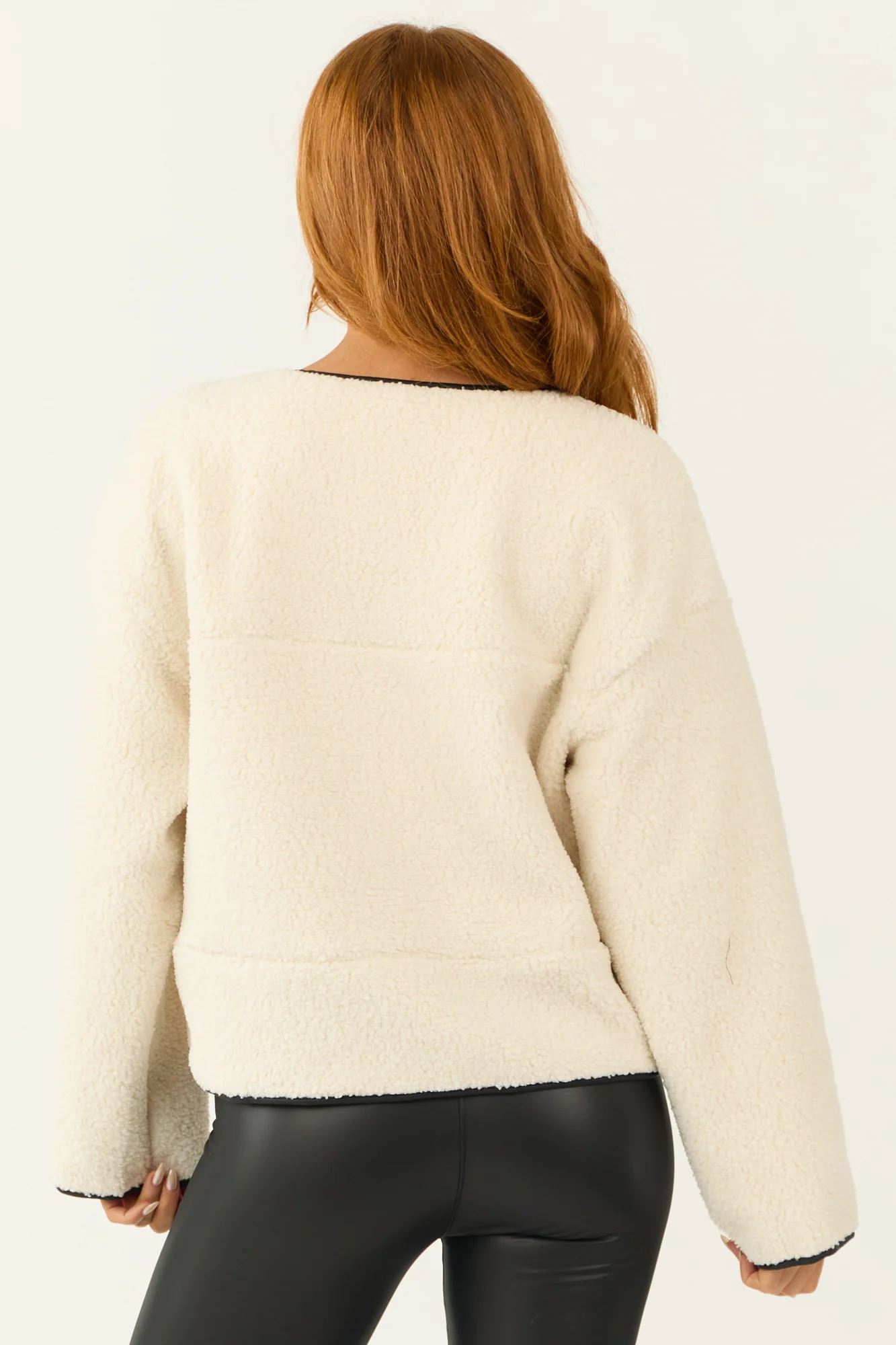 Stay cozy and stylish with our White Button Up Shearling Trim Jacket. This versatile jacket features a semi-stretchy woven sherpa construction with a contrasting black trim. It has long sleeves, drop shoulder design, and three buttons with loop closures for a fashionable look. The faux leather trim detail and fleece inner shell provide warmth and comfort. Perfect for daytime or workwear, this jacket is a must-have addition to your fall and winter wardrobe. Care instructions: Hand wash cold, line dry, iron on low. Available in sizes S, M, and L.