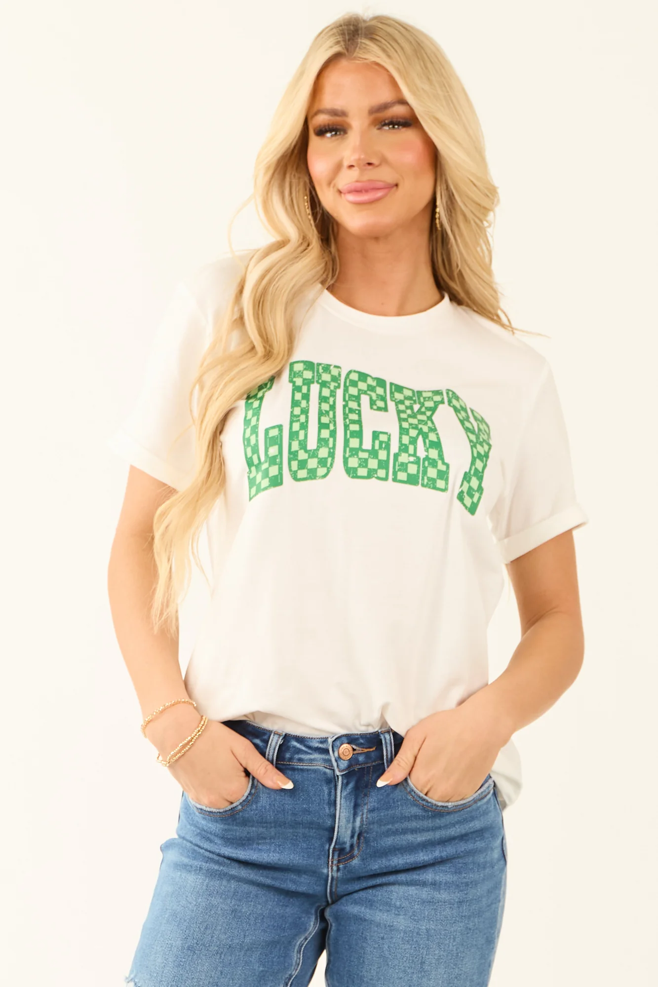 This White Checkered Graphic Short Sleeve Top is a versatile addition to your wardrobe. Featuring a stretchy knit fabric with a trendy graphic design in Sage and Jade shades, this top offers a stylish look with a ribbed crew neckline and rolled cuffs. Made of 62% Polyester, 32% Cotton, and 6% Elastane, it provides a comfortable fit. Available in sizes S, M, and L, this top pairs effortlessly with jeans or shorts for a casual yet chic ensemble. Machine washable for easy care.