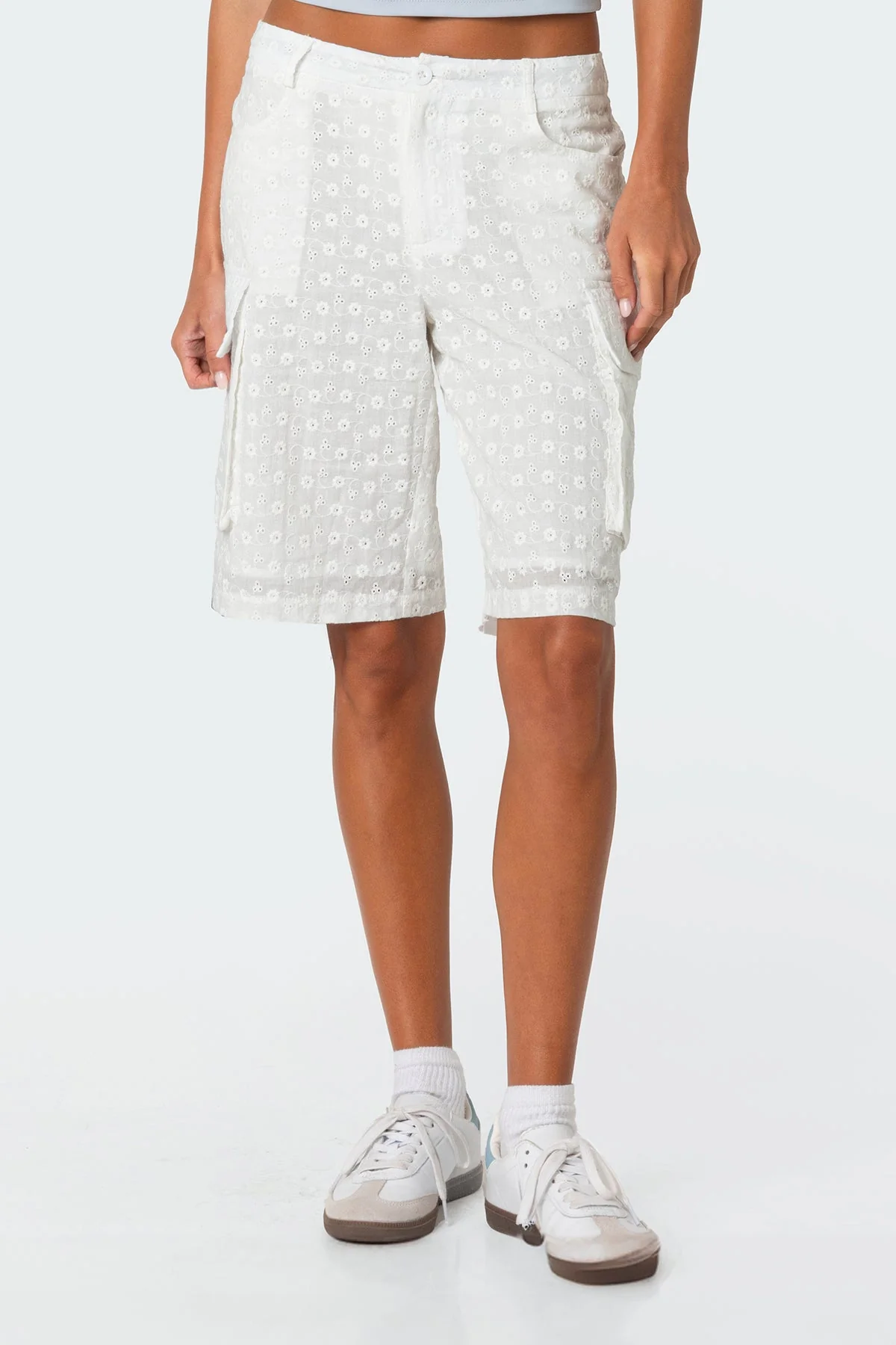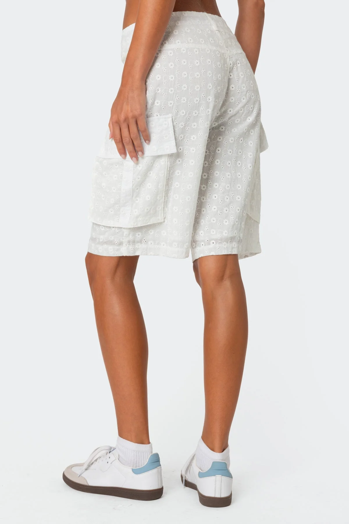 Experience ultimate comfort with our white cotton cargo Bermuda shorts featuring eyelet fabric for a trendy yet practical look. These shorts are made of 100% cotton, ensuring breathability and style. The model wears size S with an inseam of 11.2 inches, suitable for various activities. Easy to care for, machine wash at a maximum of 30°C, tumble dry low, iron at a maximum of 110°C, and avoid dry cleaning. Elevate your wardrobe with these versatile and chic white shorts.