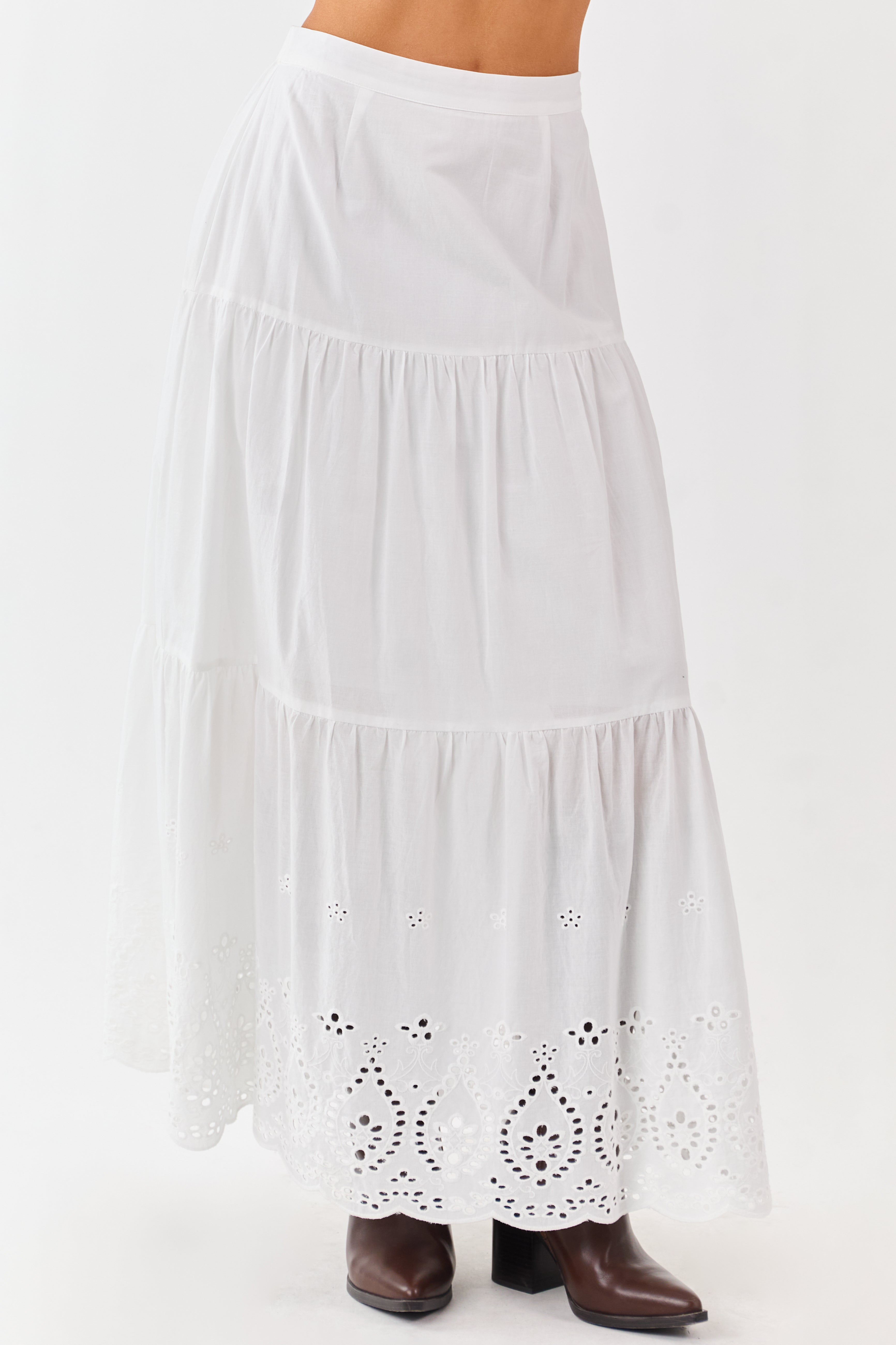 Experience the whisper of summer in every tier with our white cotton eyelet tiered maxi skirt. Crafted from non-stretchy lightweight cotton for ultimate comfort and effortless charm. Features include a slightly loose waistband, elastic back waistband for extra room, hidden side zipper with hook and eye closure, eyelet details throughout, and a scalloped hem. Lined for a luxurious feel. Available in sizes S, M, and L. Model is wearing a size Small.