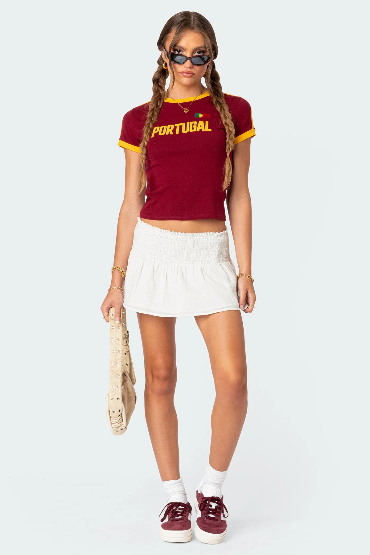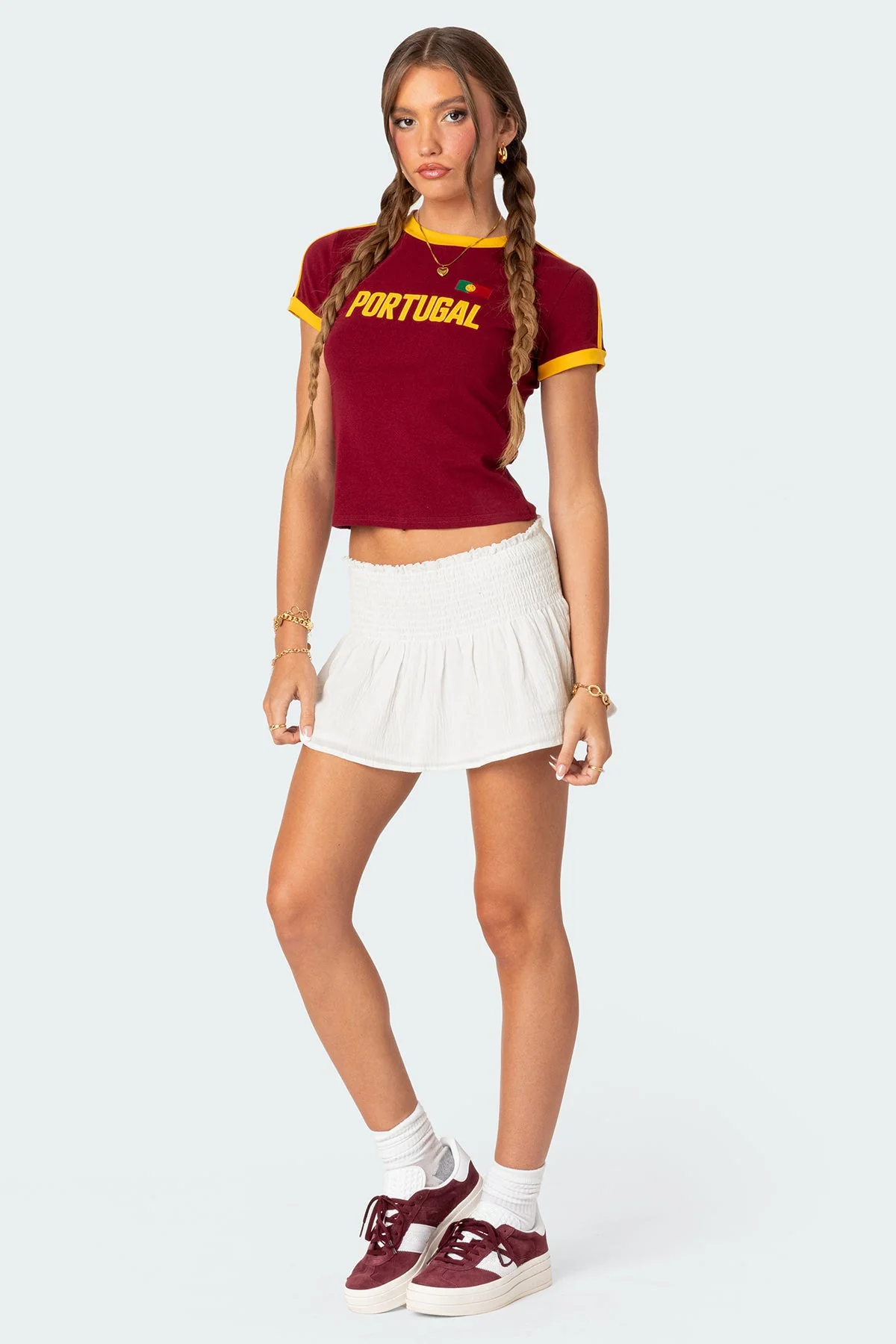 This white cotton mini skirt features a trendy scrunch waist for a fashionable touch. Made from 100% cotton, this skirt offers both style and comfort. The model wears size S and is 58 tall. Care instructions: Machine wash with similar colors for best results. Elevate your wardrobe with this chic white mini skirt today!