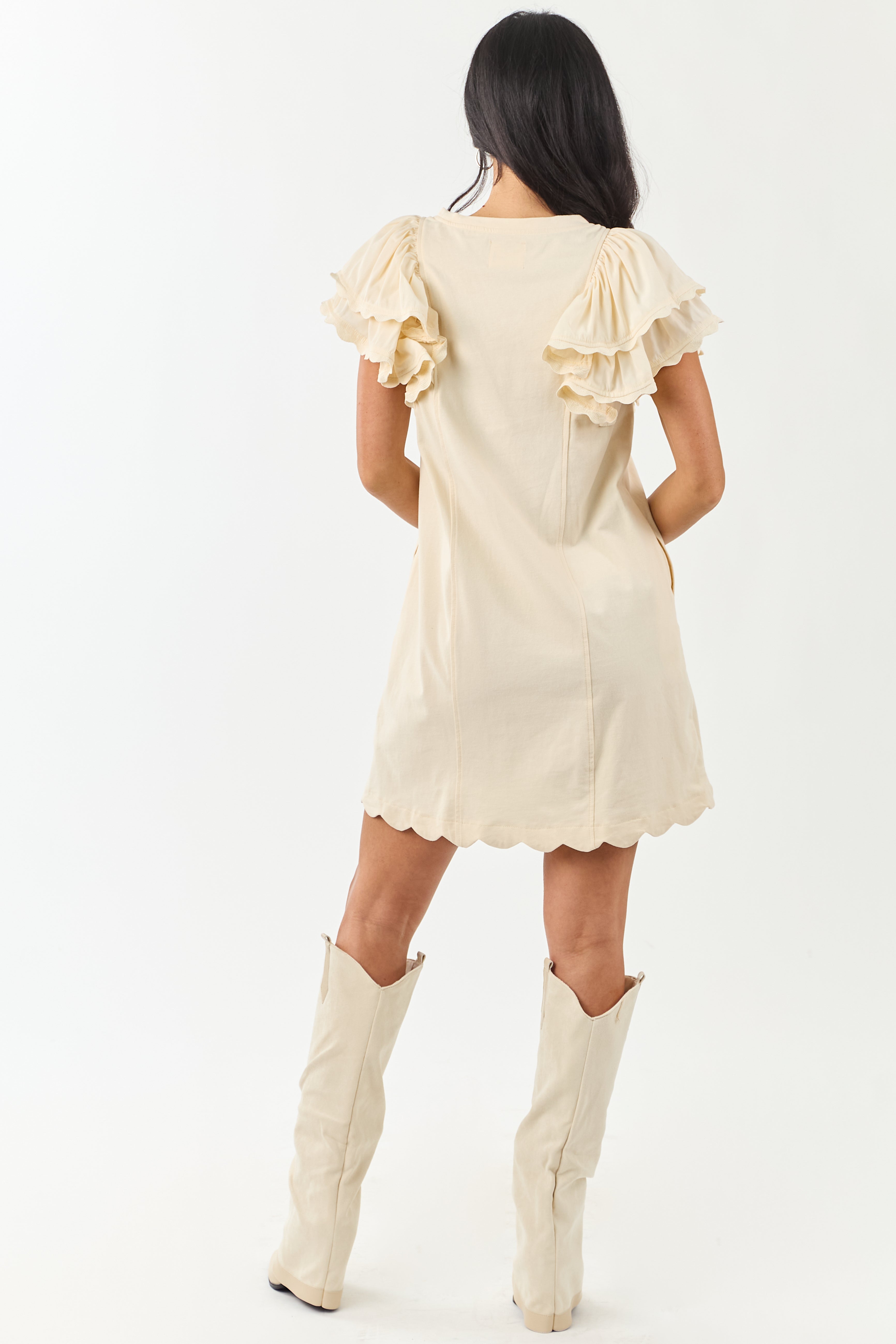 Elevate your style with this white cotton mini dress featuring ruffle tiered sleeves and side pockets. This shift dress offers a semi-stretchy fit with a feminine flair. Crafted from lightweight cotton, this dress ensures comfort and style. Size options: S, M, L.