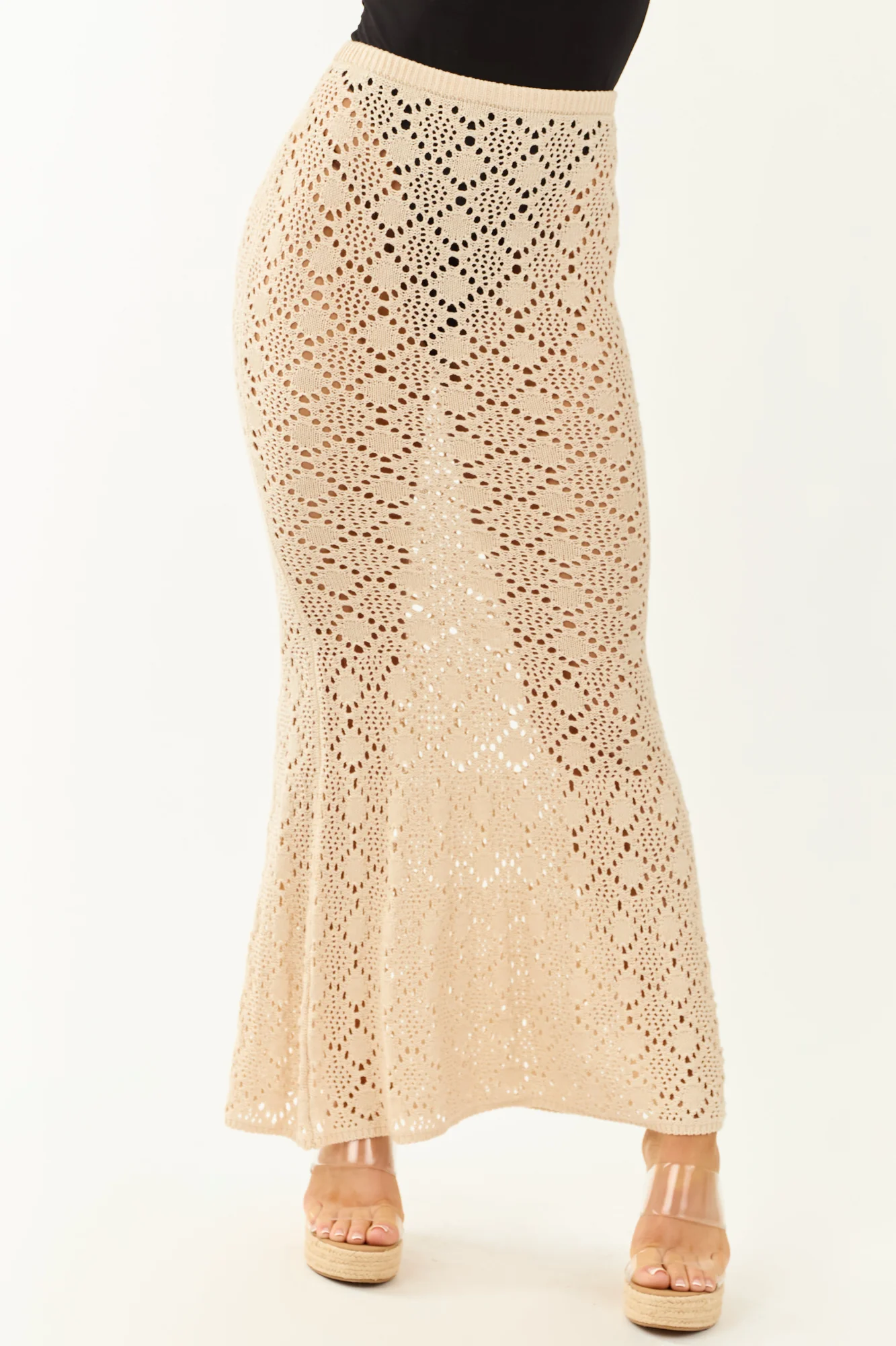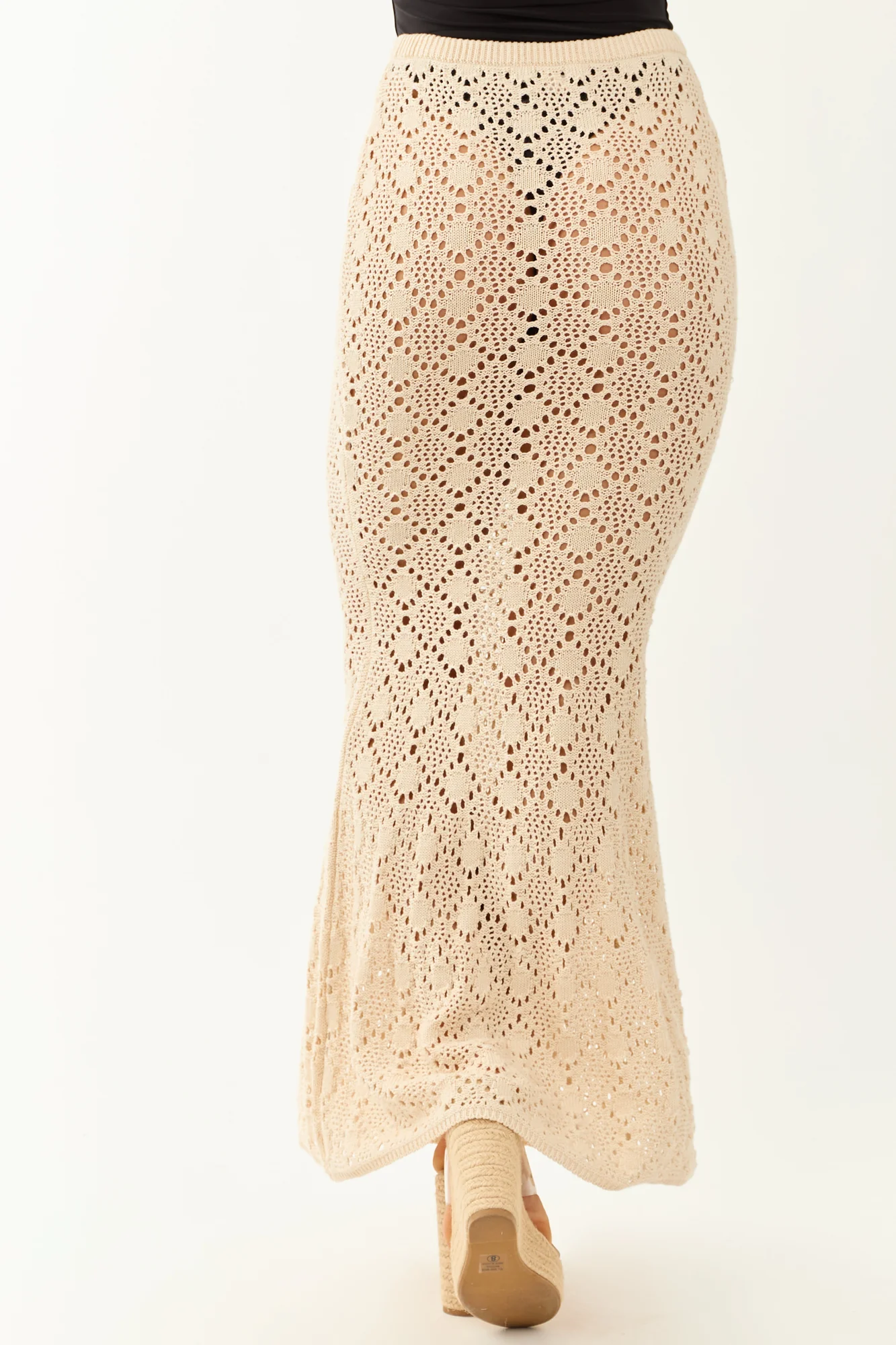 Indulge in breezy boho charm with our white crochet mermaid maxi skirt. Crafted from a stretchy knit blend of 55% acrylic and 45% cotton, this skirt features an elastic waist, ribbed trim, and an unlined design. Whether you choose size S, M, or L, this skirt offers a comfortable and stylish fit. Perfect for spring and summer, this versatile piece is a wardrobe essential. Hand wash cold, dry flat. Model is 57″ and wears a size Small.