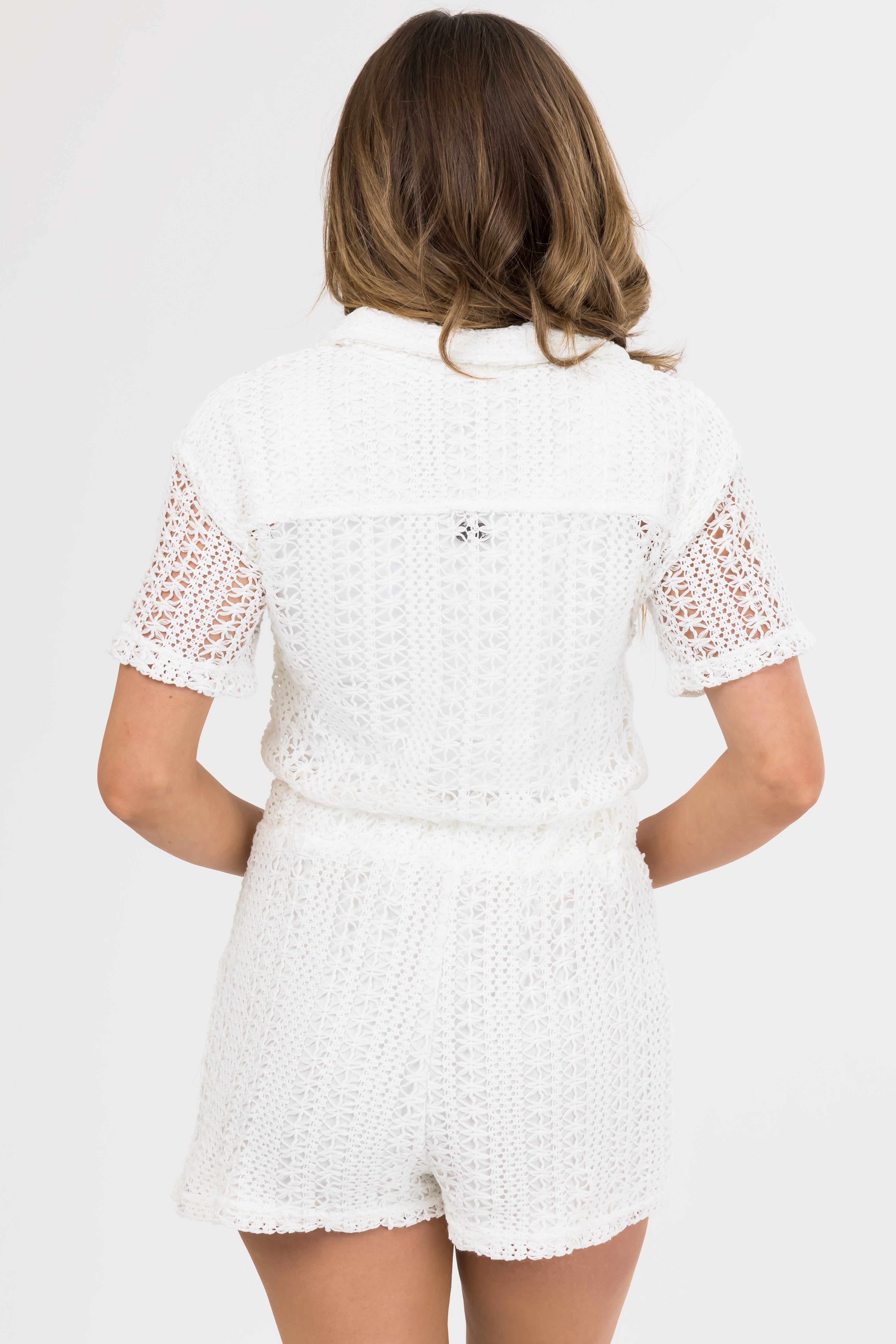Indulge in effortless style with our White Crochet Button Down Romper for women. Made from high-quality 100% Polyester, this romper features short sleeves, chest pocket details with buttons, elastic waistband, and side pockets. The stretchy crochet knit ensures a perfect fit, while the shorts lining adds comfort. Ideal for casual or daytime occasions, this romper is a must-have for the spring and summer season. Hand wash cold water, dry flat. Model is wearing a size Small. Size details: S (Bust: 34″, Waist: 28″), M (Bust: 35″, Waist: 29″), L (Bust: 36″, Waist: 30″).