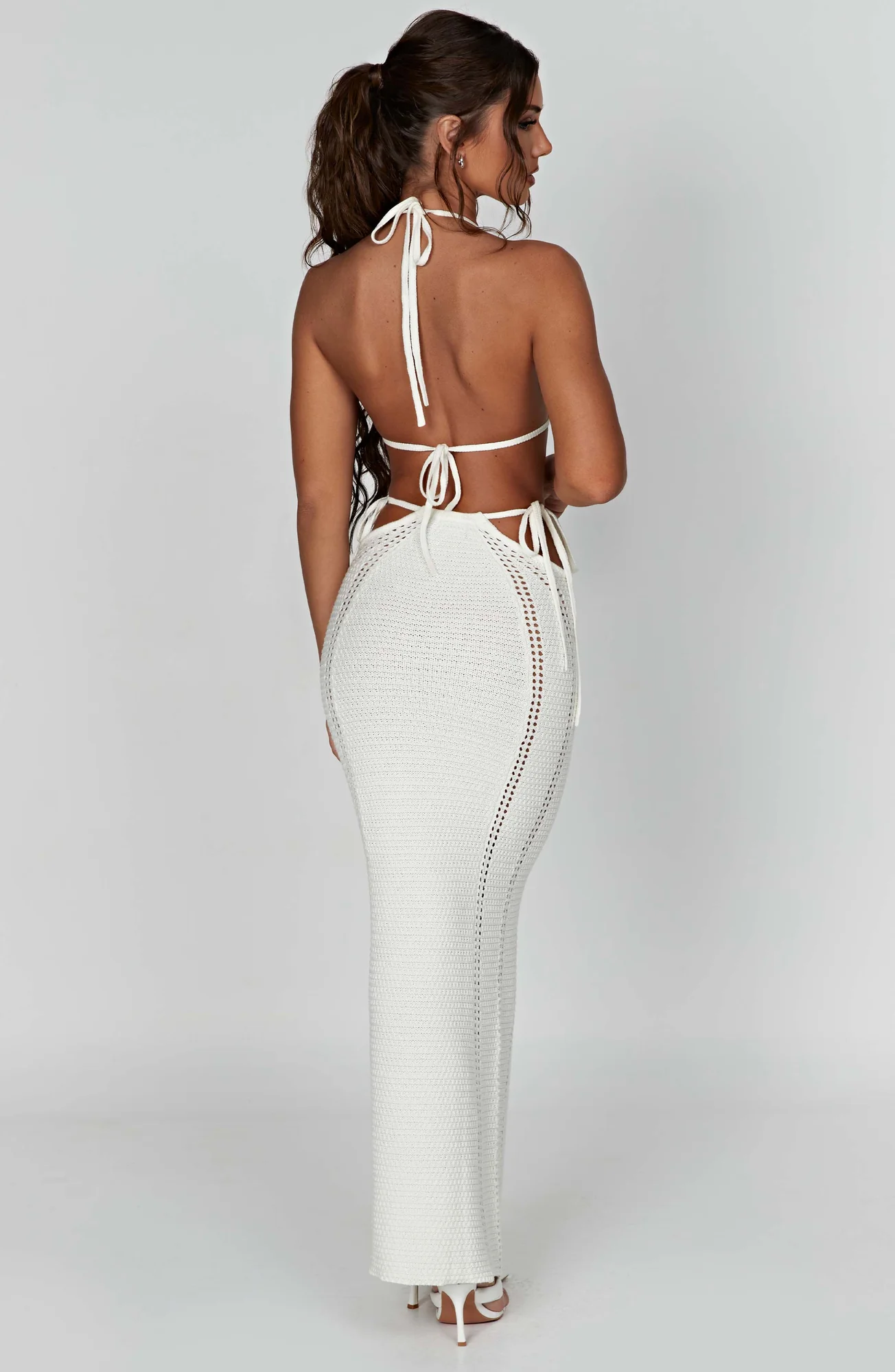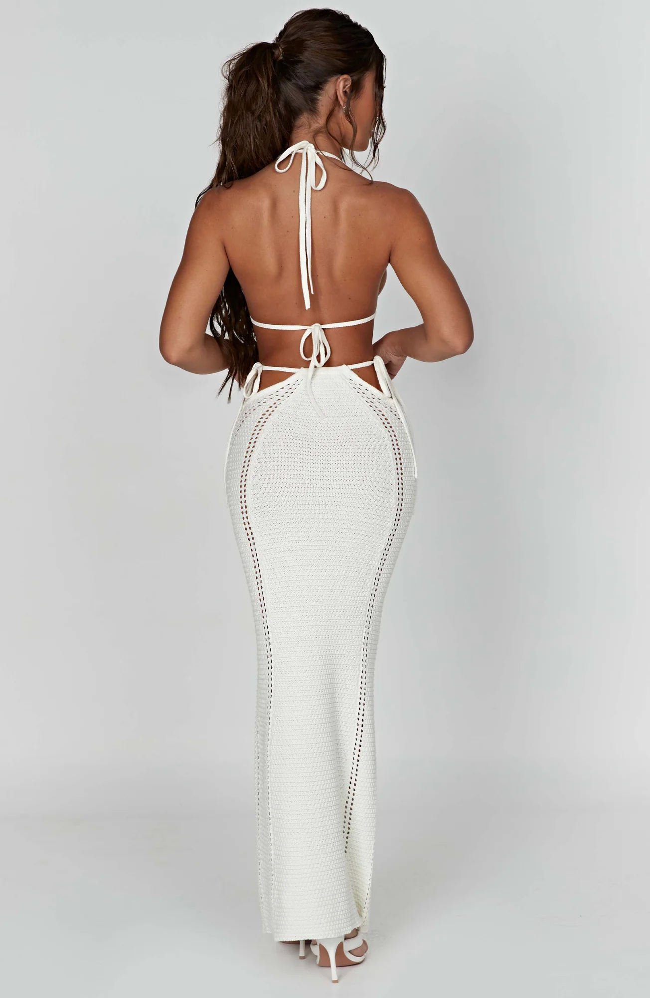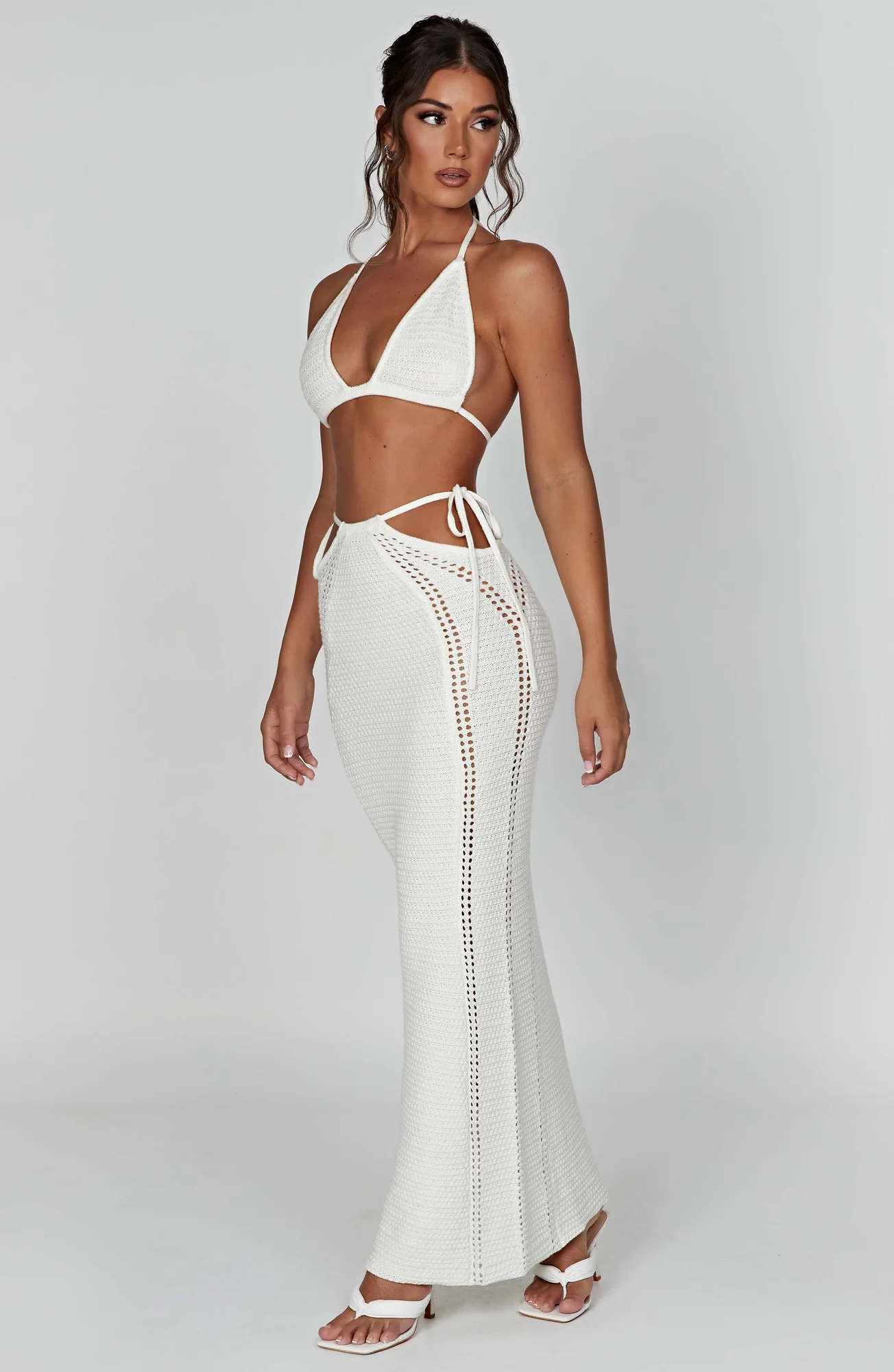 Indulge in sophistication with our premium white crochet maxi skirt, designed to contour and flatter your figure effortlessly. Elevate your style with the sexy cut-out waist detail, ideal for pairing with the matching Jia top. Crafted from high-quality crochet knit material, this stunning maxi skirt in white ensures a body-hugging fit and maximum comfort. Embrace elegance with the floor-sweeping length, perfectly suited for various occasions, making you feel beautiful inside and out. Model showcased in size XS.