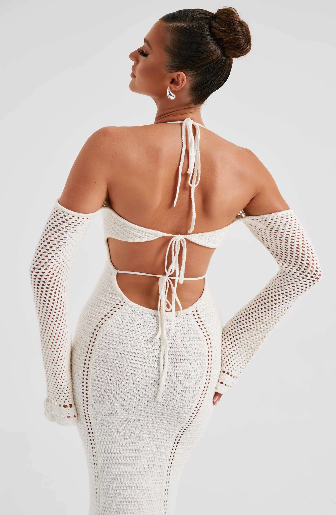 Indulge in the allure of our premium white crochet knit off-shoulder maxi dress. Crafted with a soft crochet knit, this stunning dress features a slight stretch that beautifully molds to your figure. Embrace elegance with long flared sleeves, off-shoulder styling, and a mesmerizing tie detail bust. The maxi length adds a touch of chic sophistication. Perfect for any occasion, from daytime events to evening gatherings. Feel empowered and glamorous effortlessly. Model wearing size XS. Available in sizes XS to XXL. Discover your new favorite dress today!