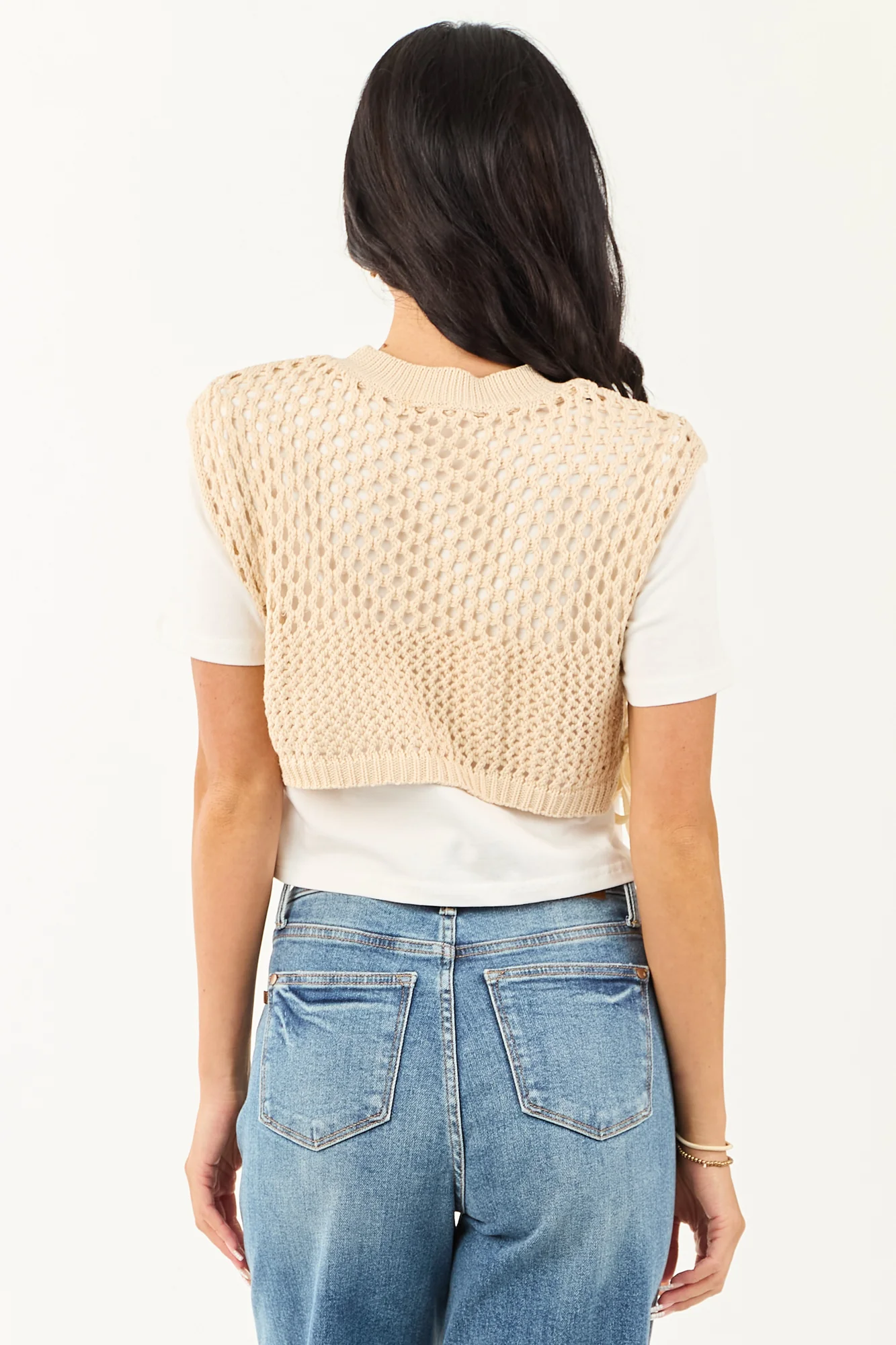 Elevate your style with our white crochet short sleeve crop top. Available in sizes S, M, and L with bust measurements of 36, 38, and 40. This top features a stretchy knit off-white undershirt with adjustable side ties for a customized fit. Made of 80% cotton and 20% polyester, it offers comfort and style in one. Perfect for summer, this top is a versatile addition to your wardrobe. Model is wearing a size Small. Model’s Profile: Size 1, Height 59, Bust 34, Waist 26.