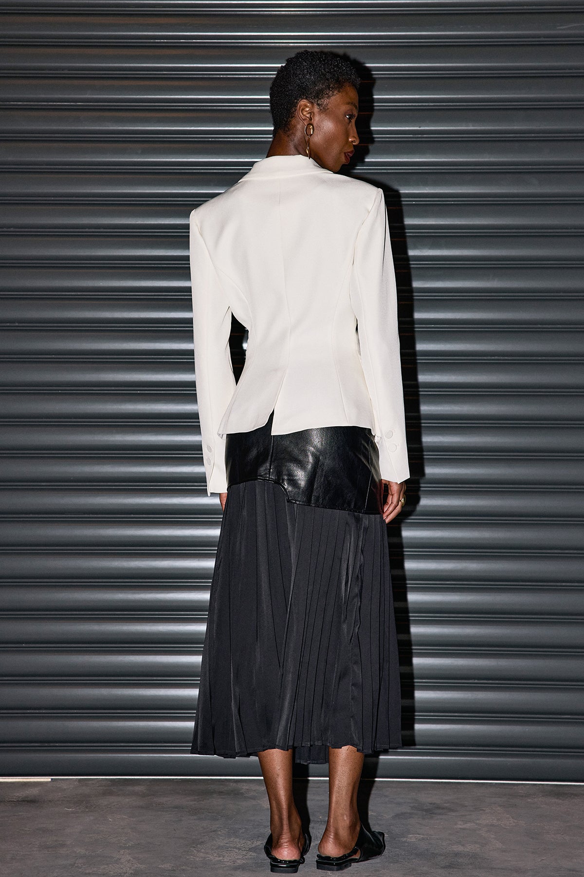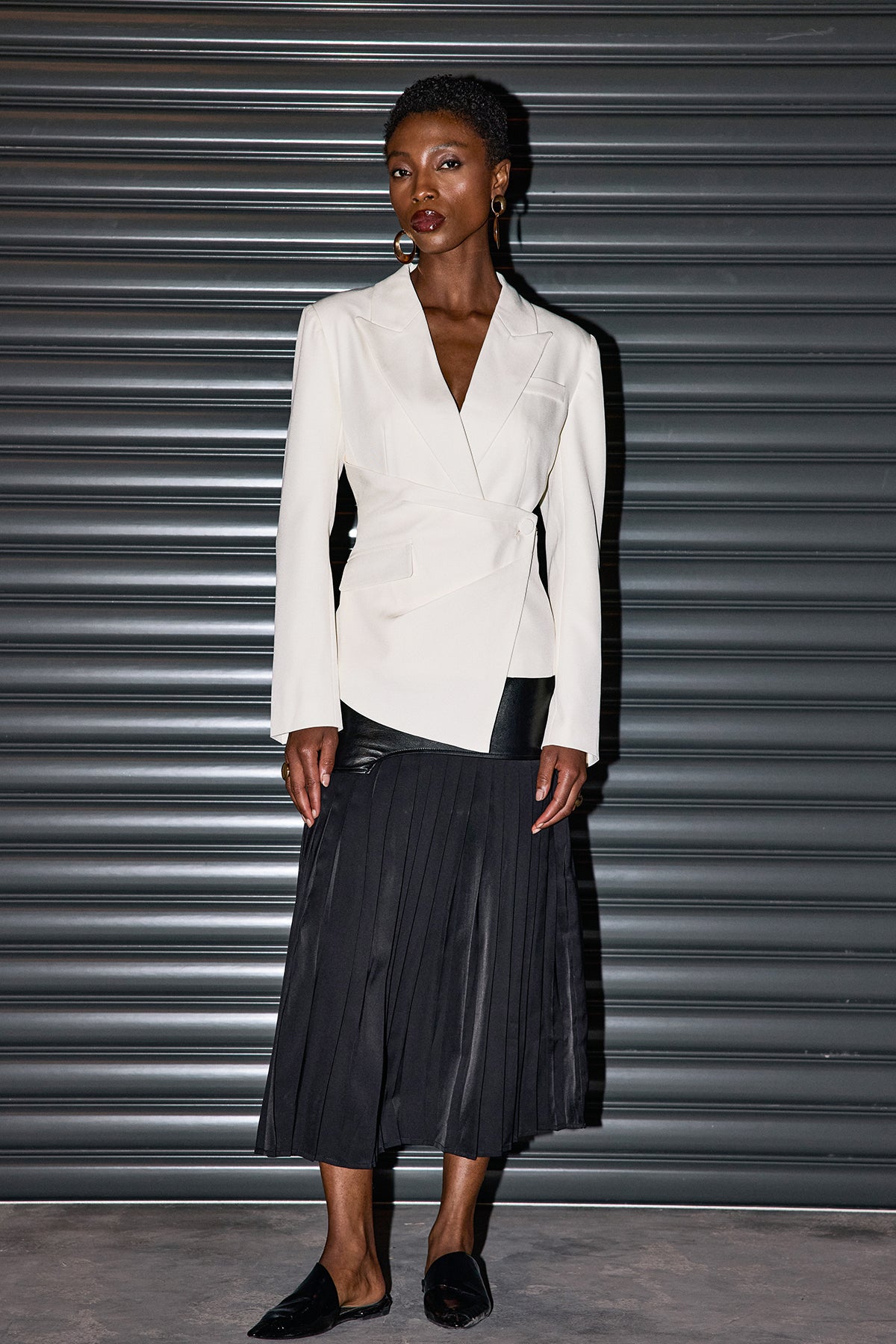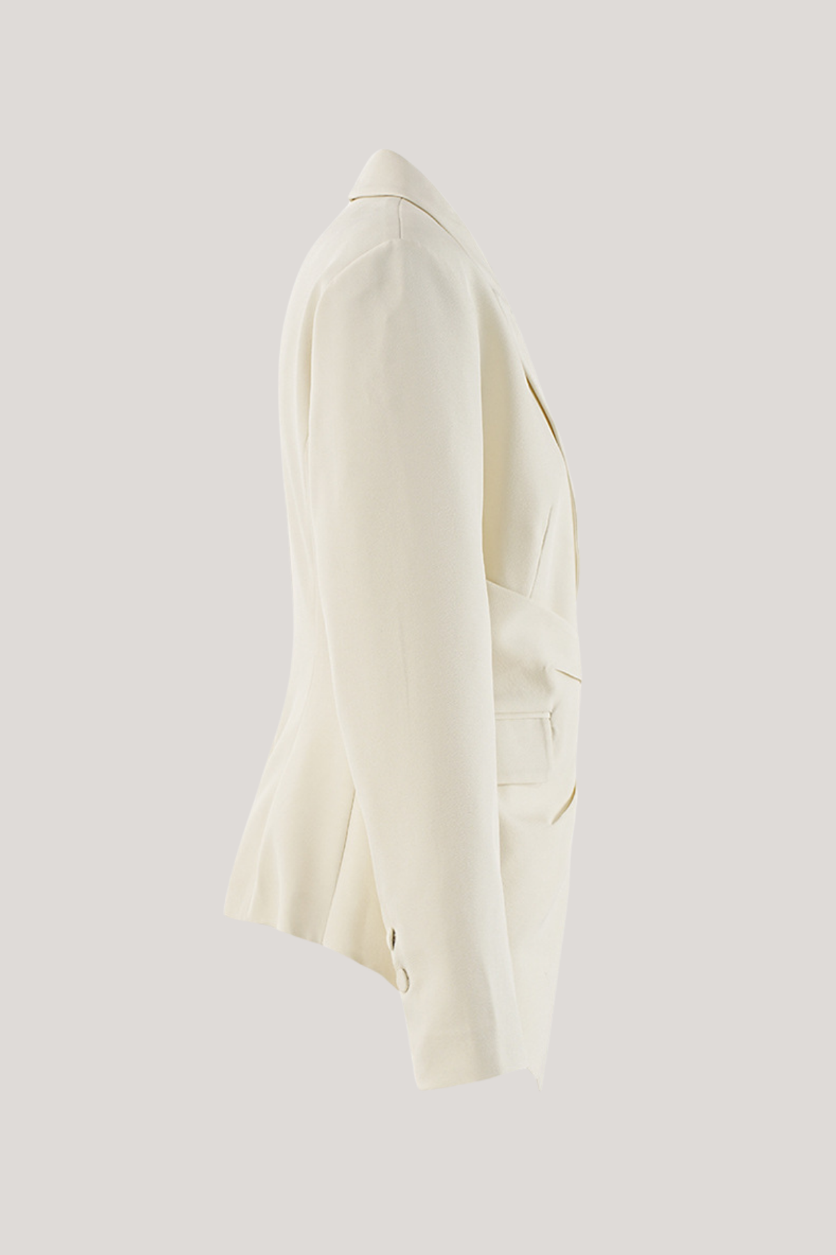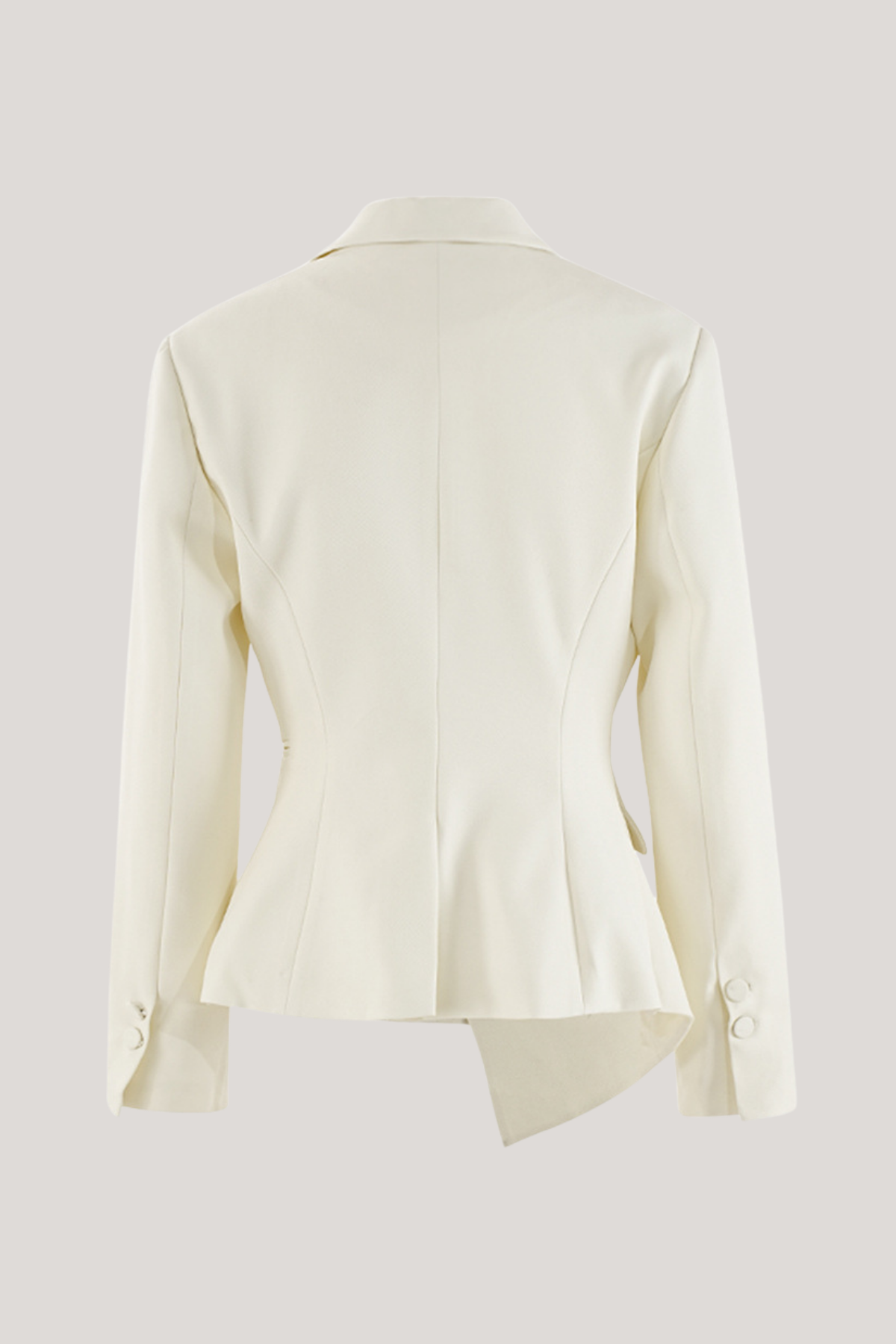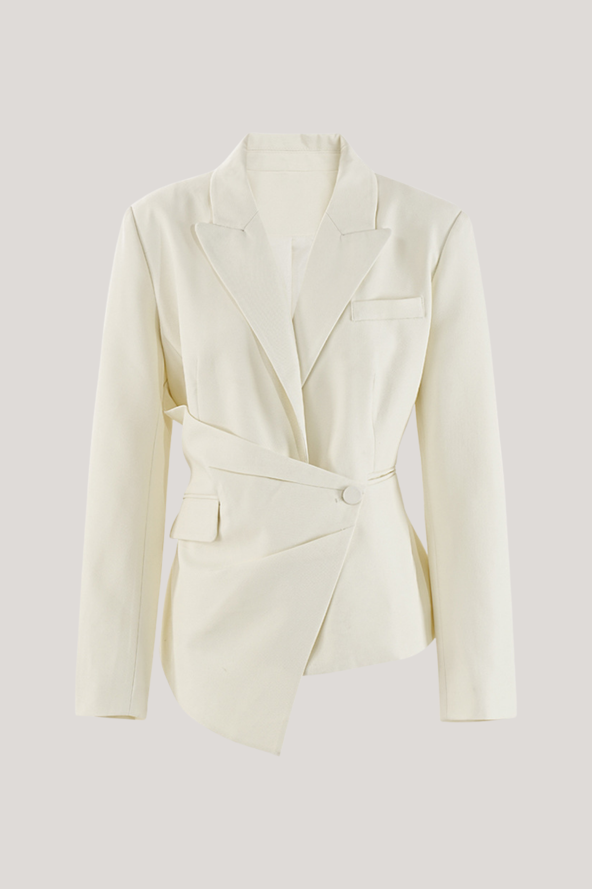 Elevate your work wardrobe with the White Cross Asymmetric Blazer. This blazer features a modern cross asymmetric design with a plunging neckline for a touch of elegance. Made from 100% Polyester with gentle machine wash care, this blazer offers a flattering fit and versatile style. Explore the chic and functional vibe of this blazer. Please note, color may vary due to lighting.